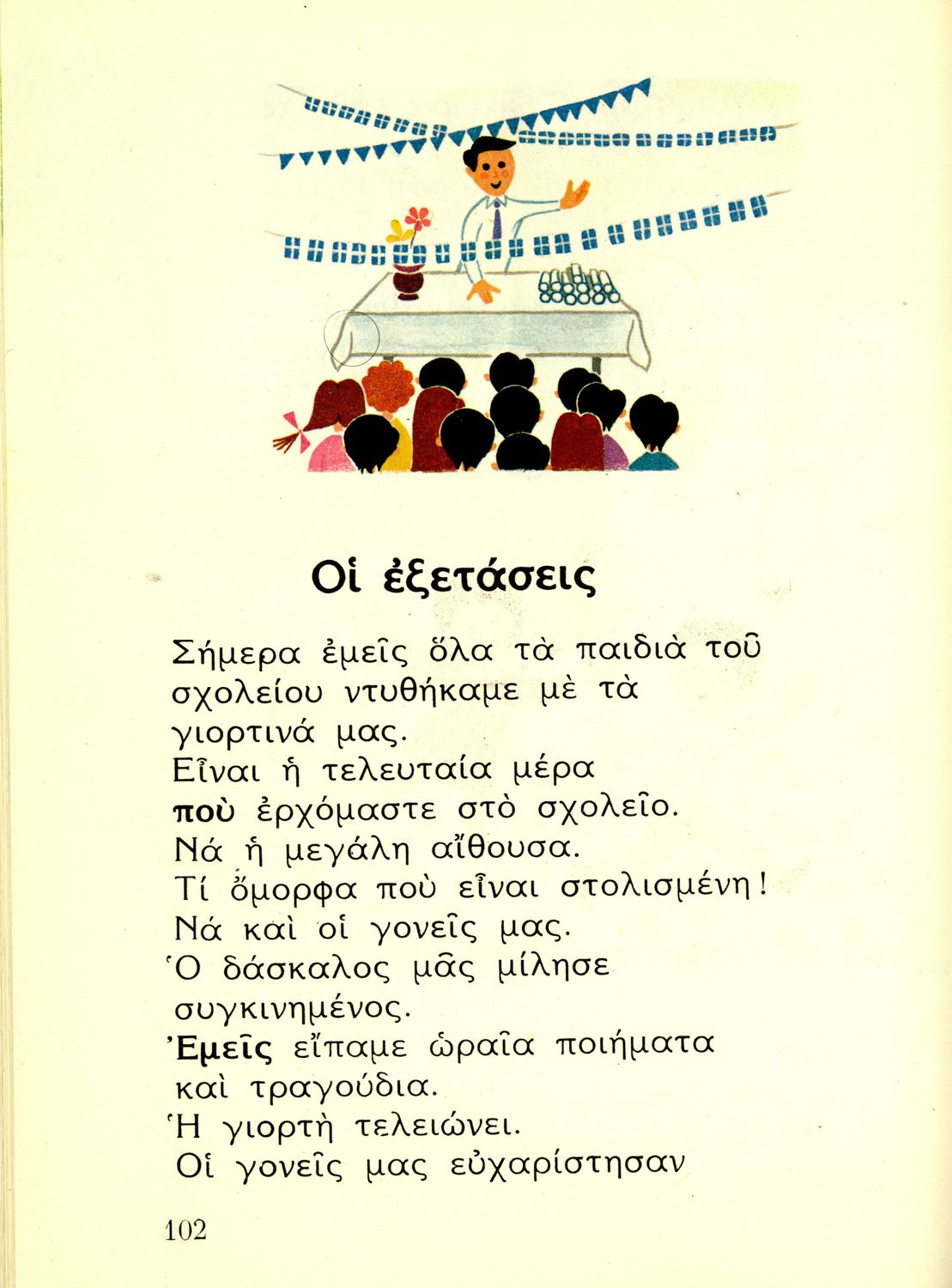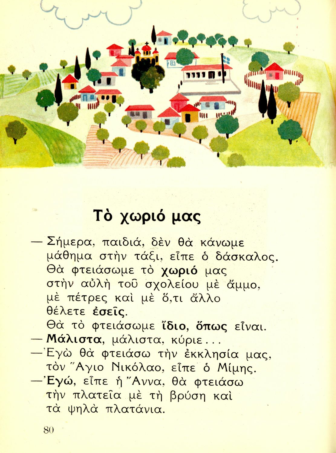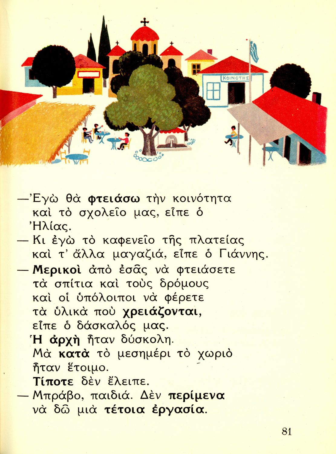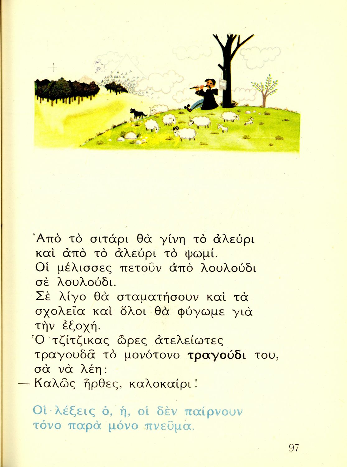 Αναγνωστικό Α΄ Δημοτικού που περιέχει γράμματα, συλλαβές, λέξεις, προτάσεις και κείμενα εμπνευσμένα από την οικογενειακή και κοινωνική ζωή του τόπου. Φέρει το σύμβολο της δικτατορίας.