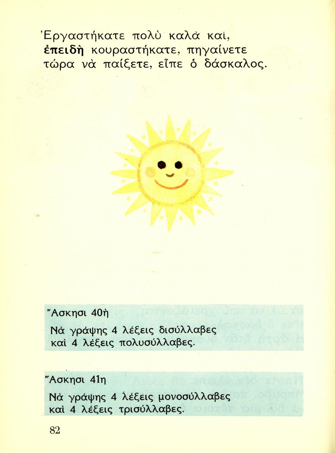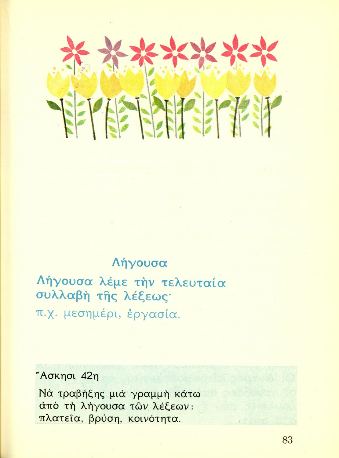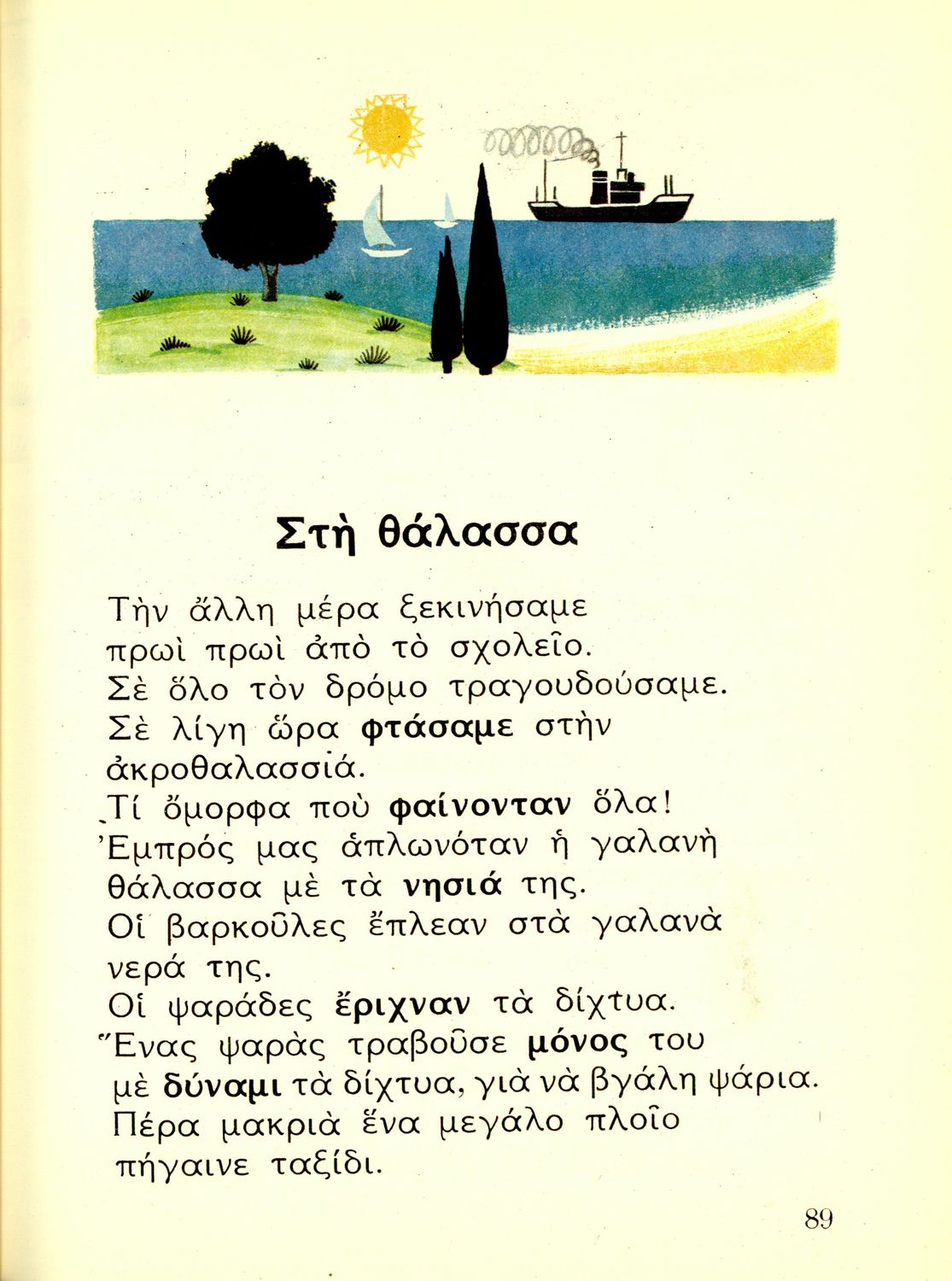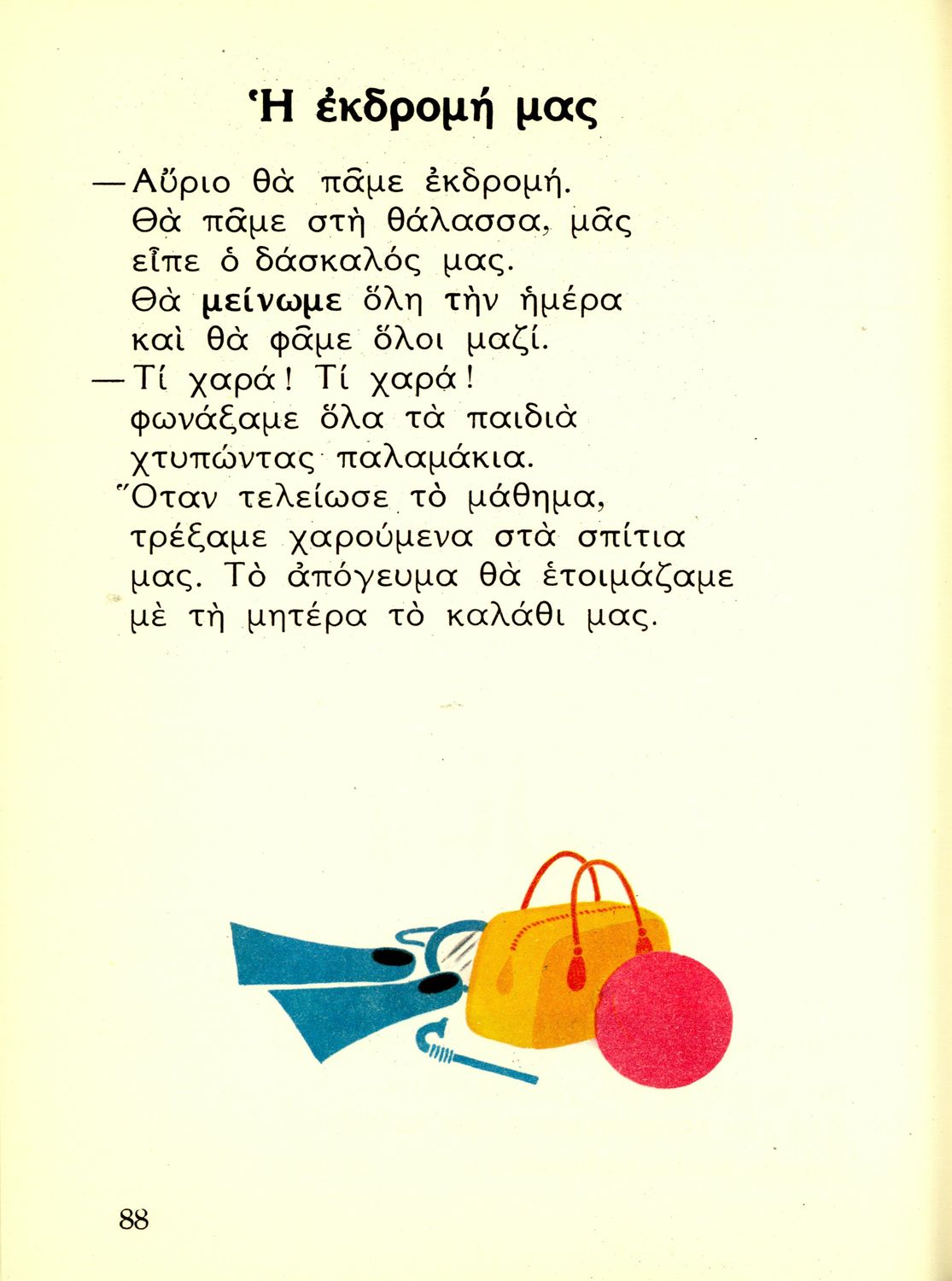 Αναγνωστικό Α΄ Δημοτικού που περιέχει γράμματα, συλλαβές, λέξεις, προτάσεις και κείμενα εμπνευσμένα από την οικογενειακή και κοινωνική ζωή του τόπου. Φέρει το σύμβολο της δικτατορίας.