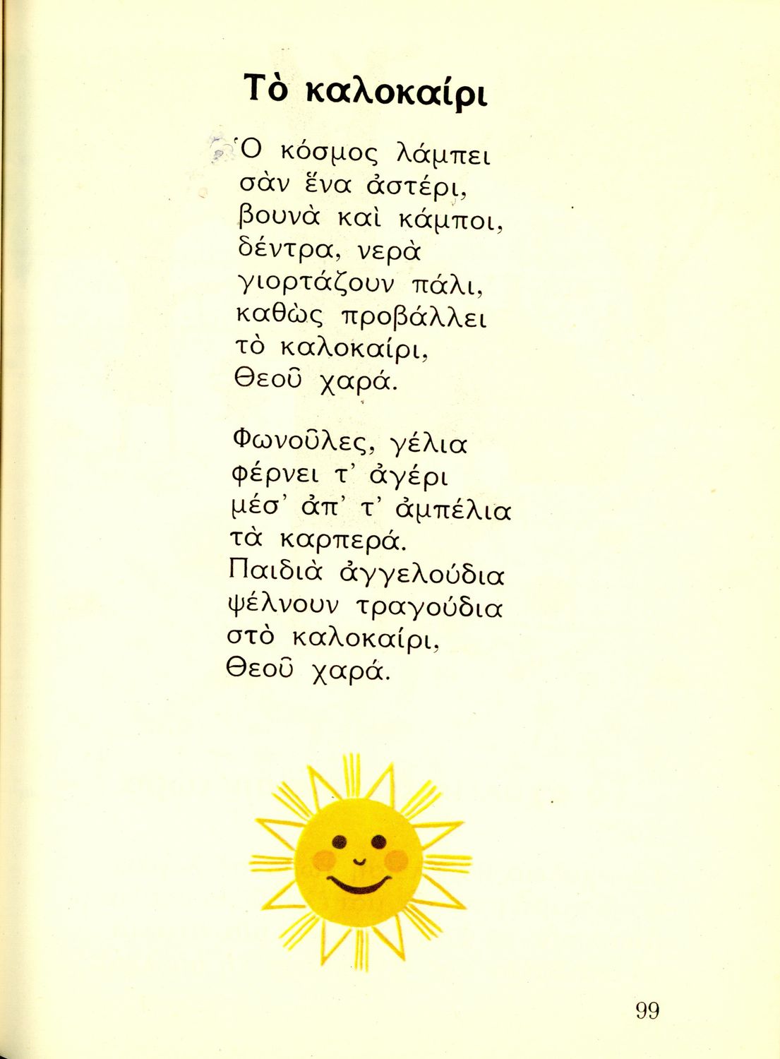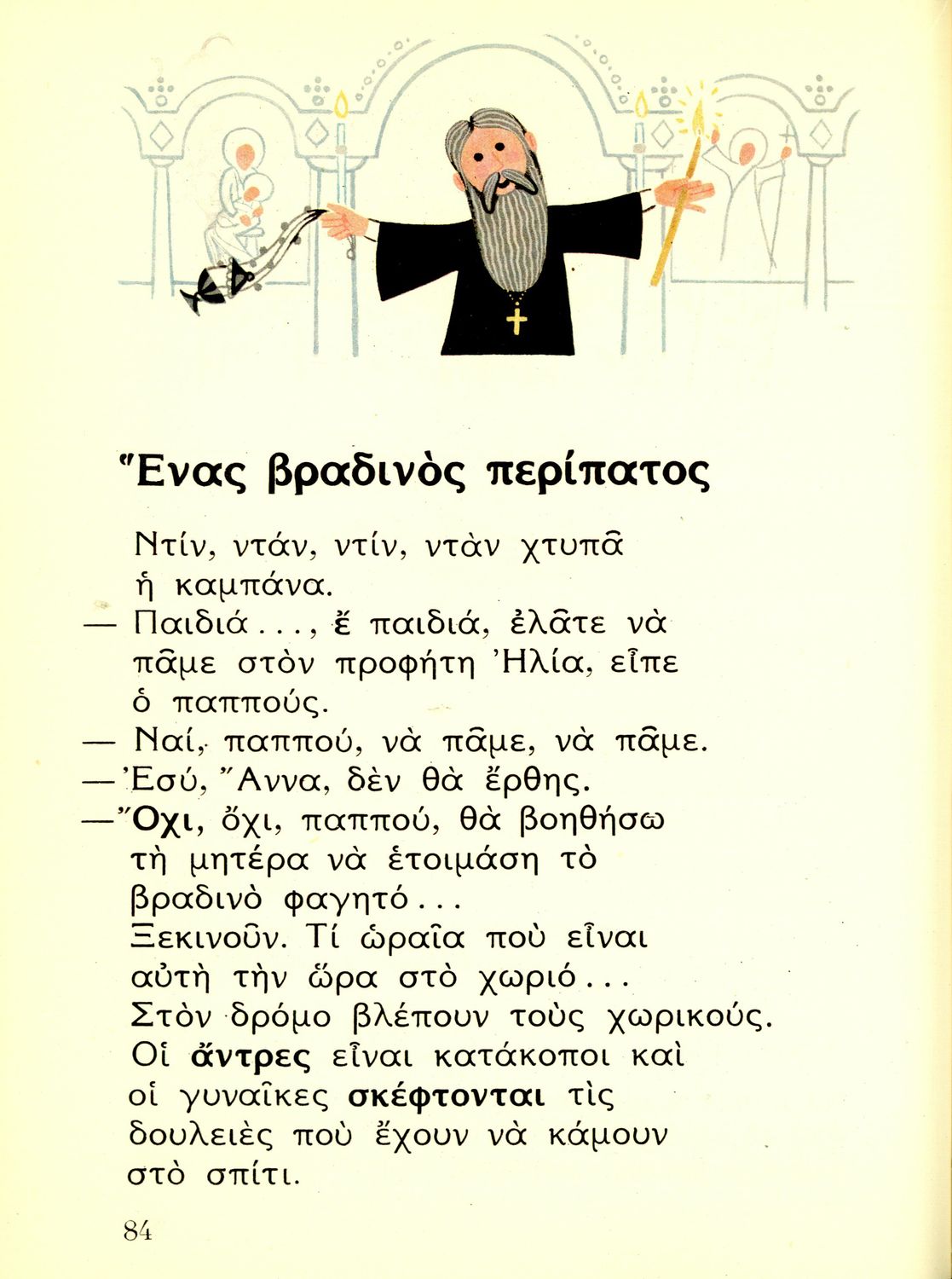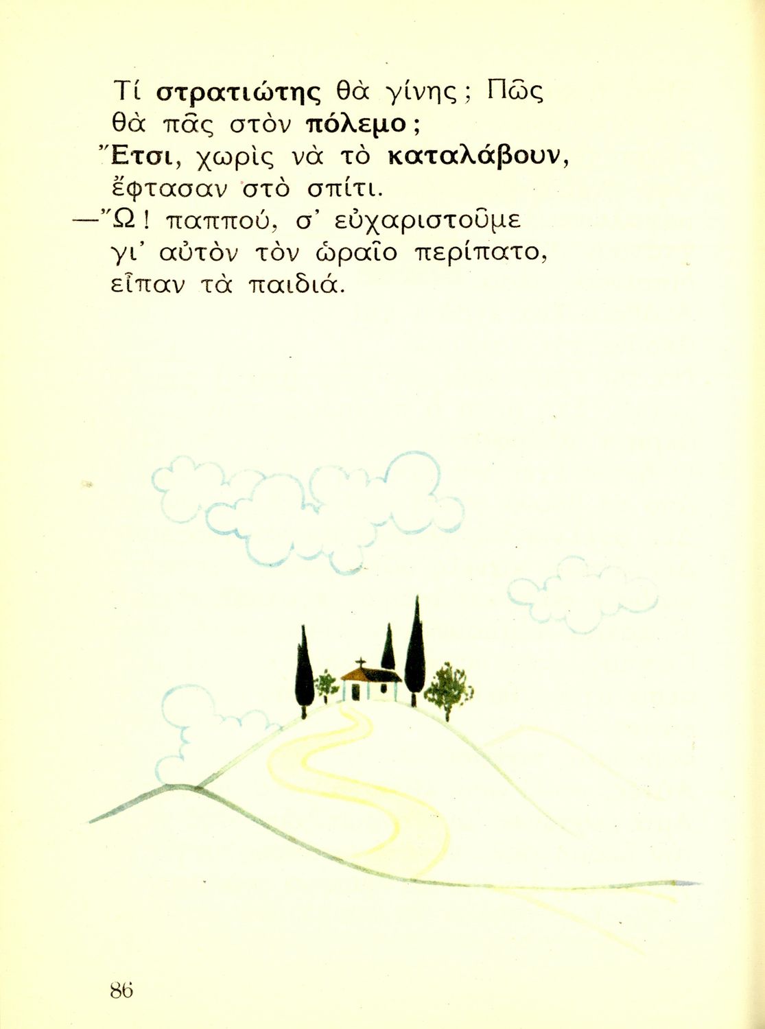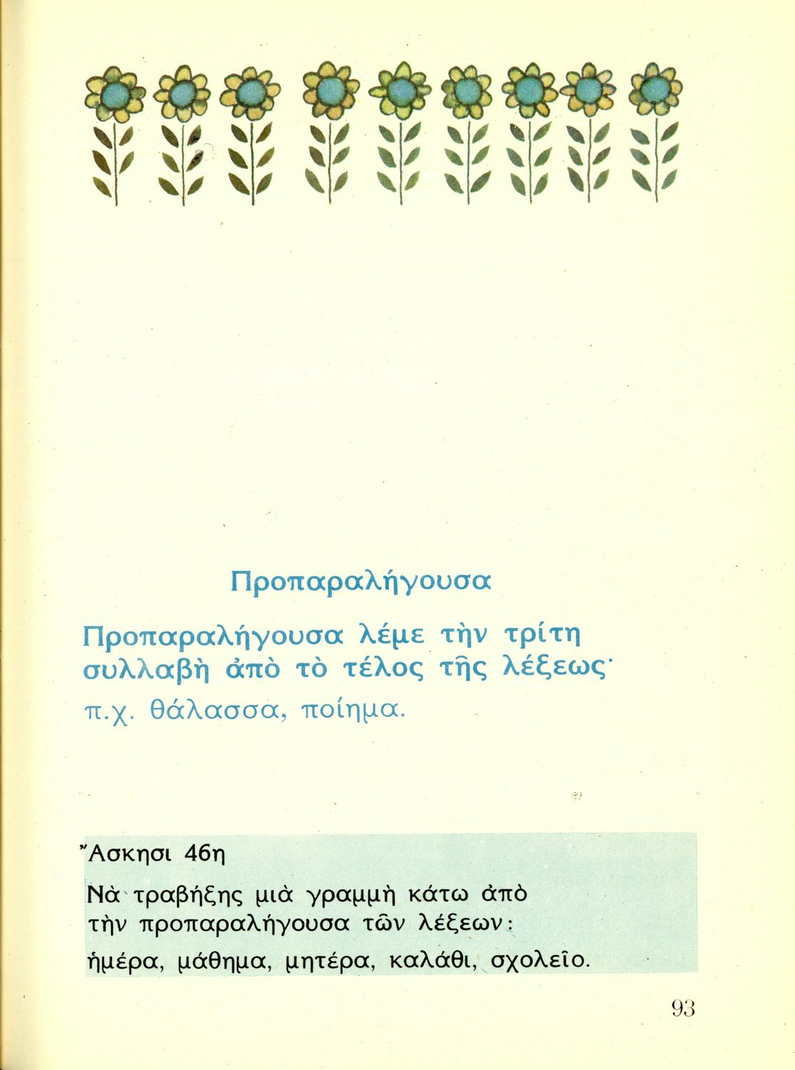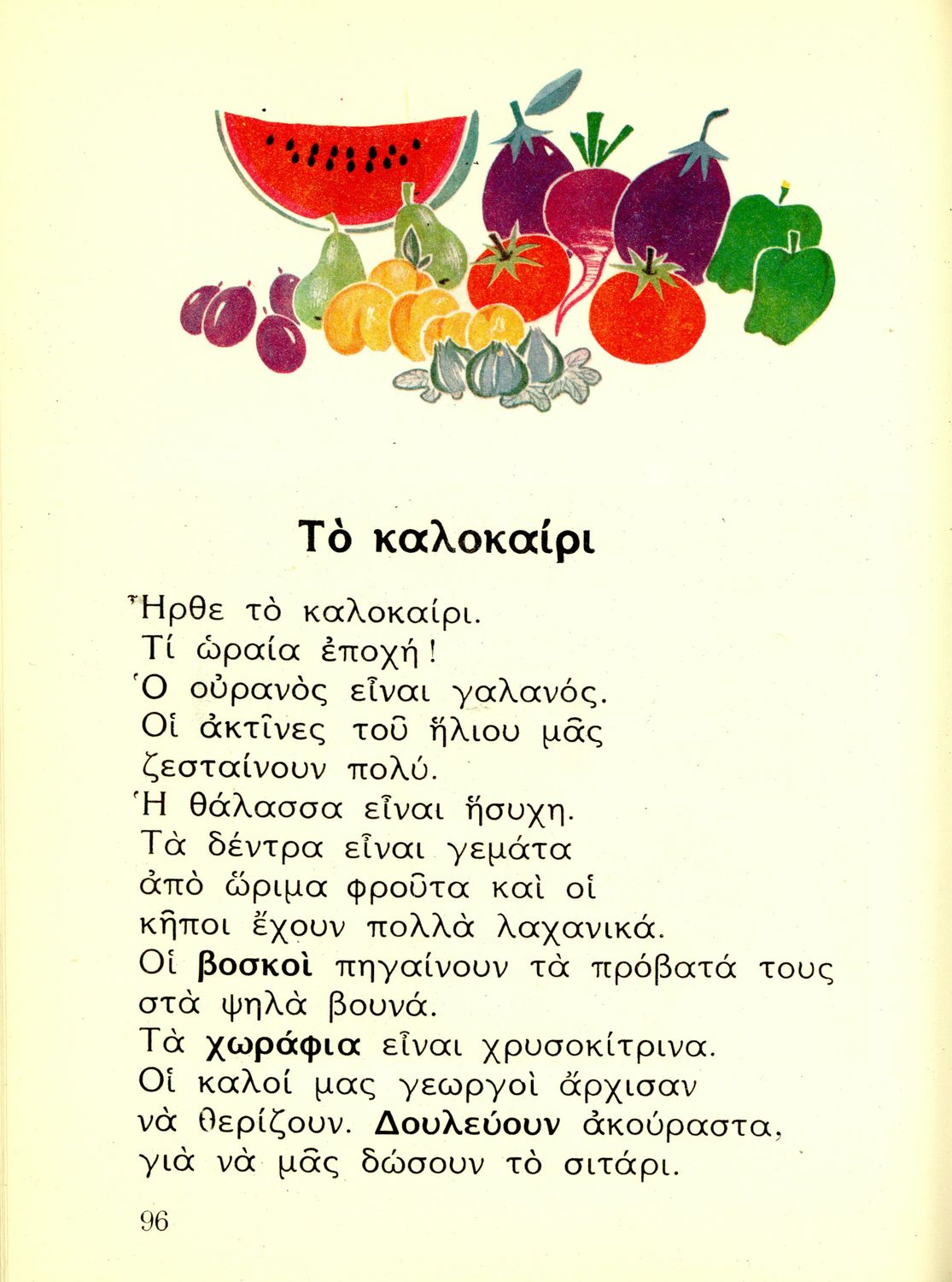 Αναγνωστικό Α΄ Δημοτικού που περιέχει γράμματα, συλλαβές, λέξεις, προτάσεις και κείμενα εμπνευσμένα από την οικογενειακή και κοινωνική ζωή του τόπου. Φέρει το σύμβολο της δικτατορίας.