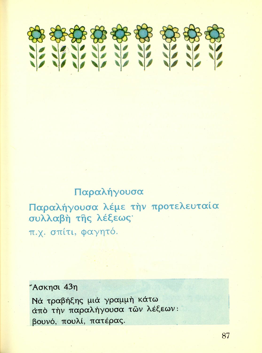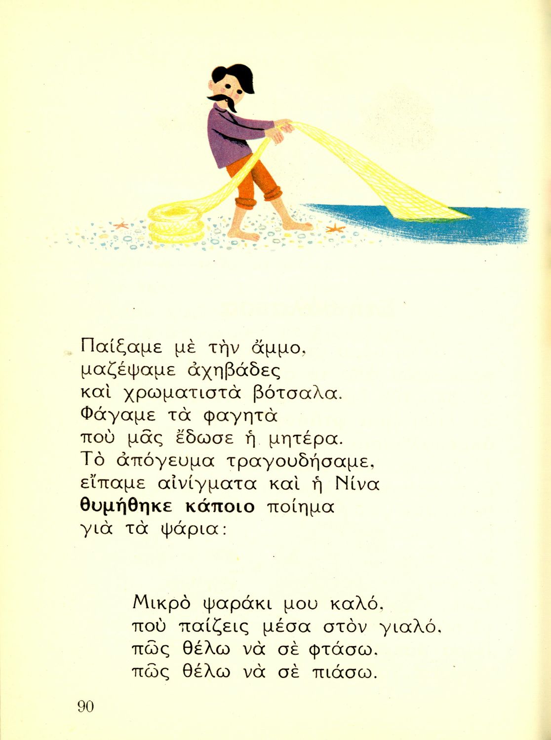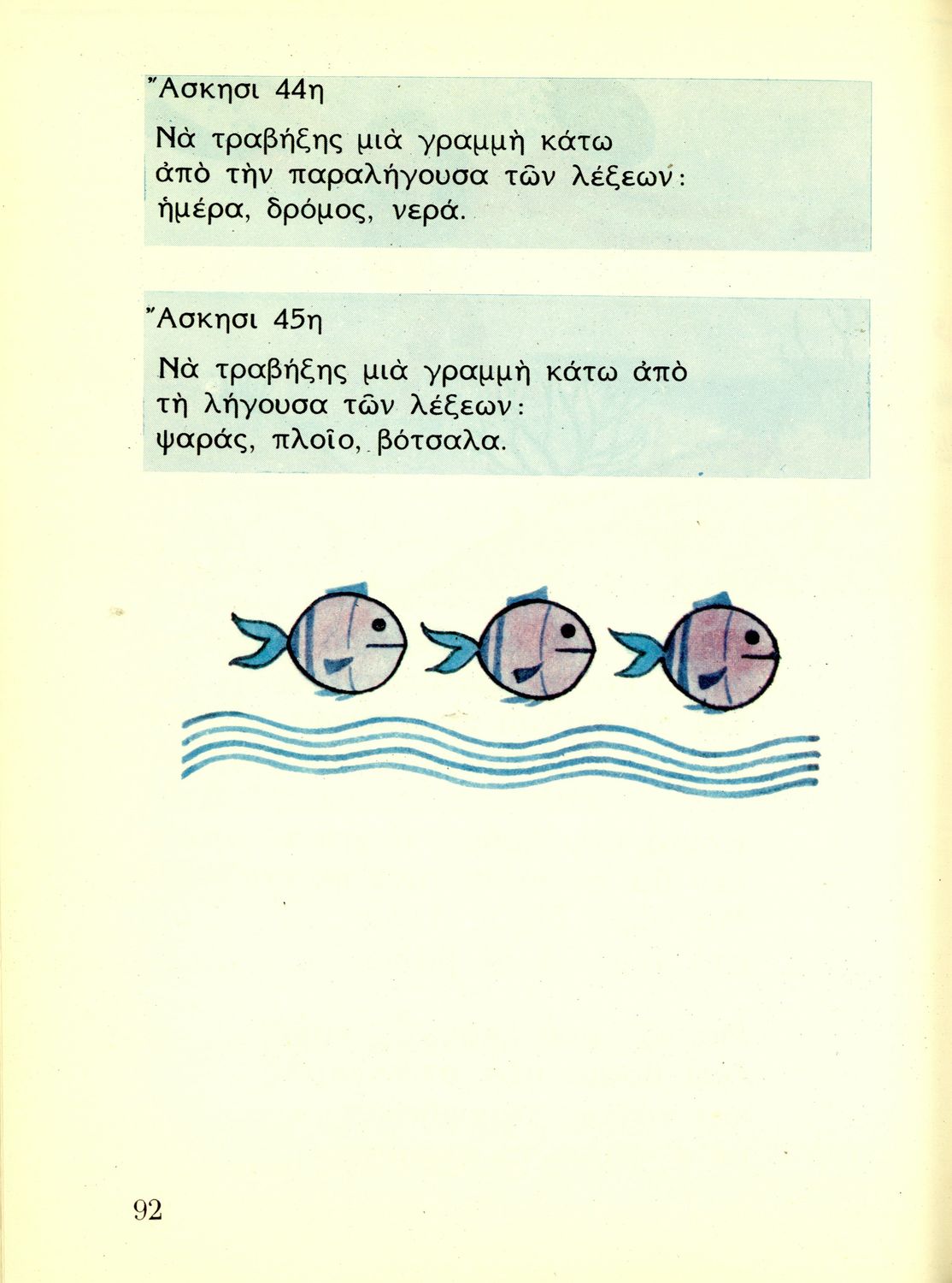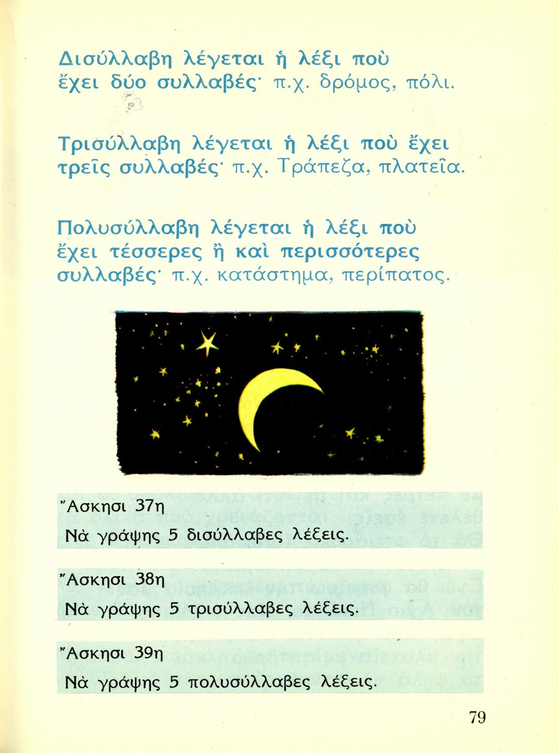 Αναγνωστικό Α΄ Δημοτικού που περιέχει γράμματα, συλλαβές, λέξεις, προτάσεις και κείμενα εμπνευσμένα από την οικογενειακή και κοινωνική ζωή του τόπου. Φέρει το σύμβολο της δικτατορίας.