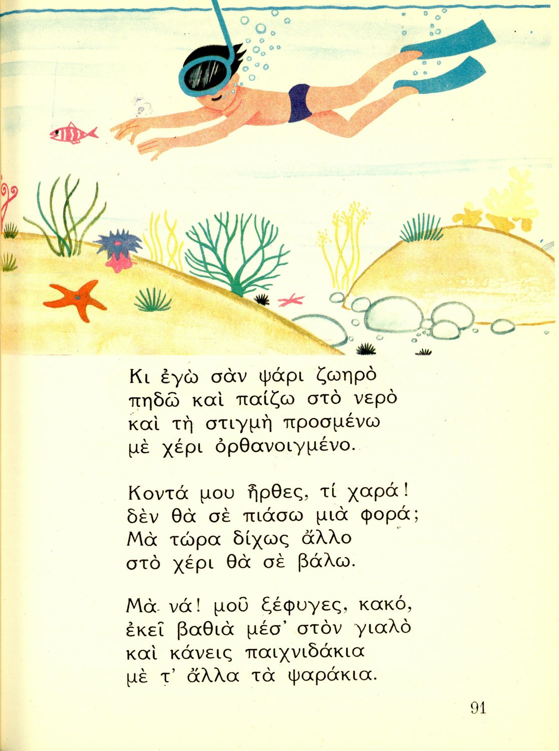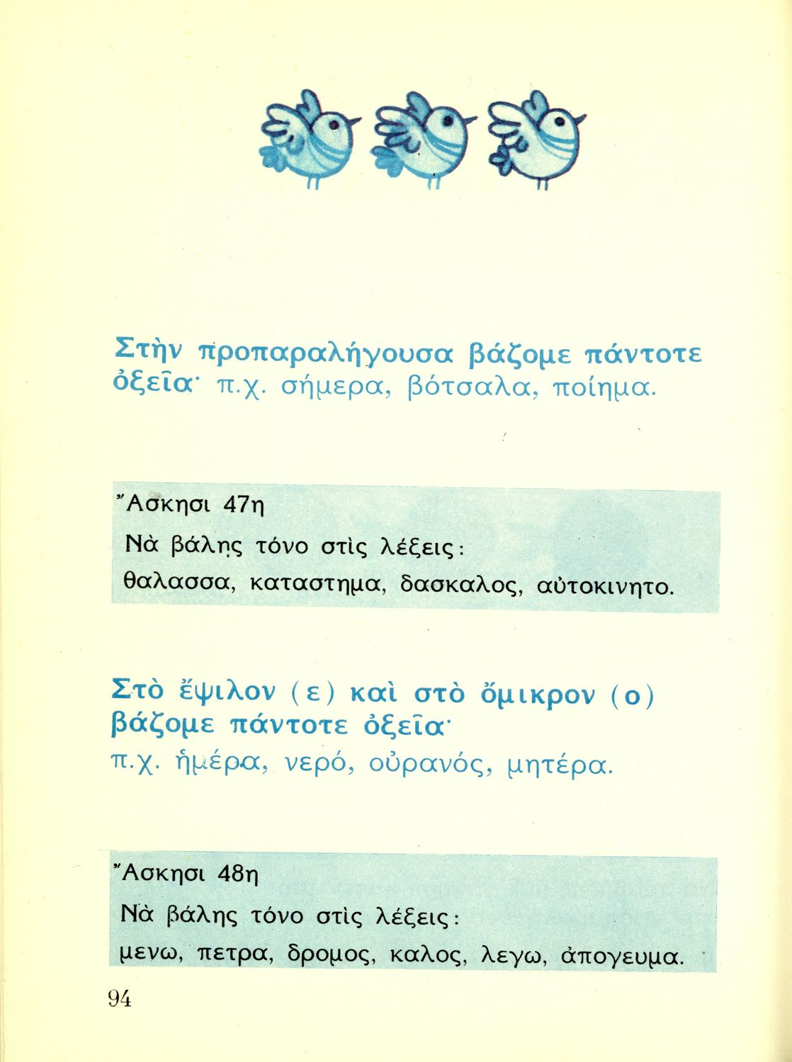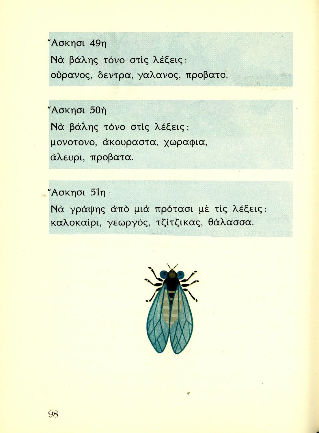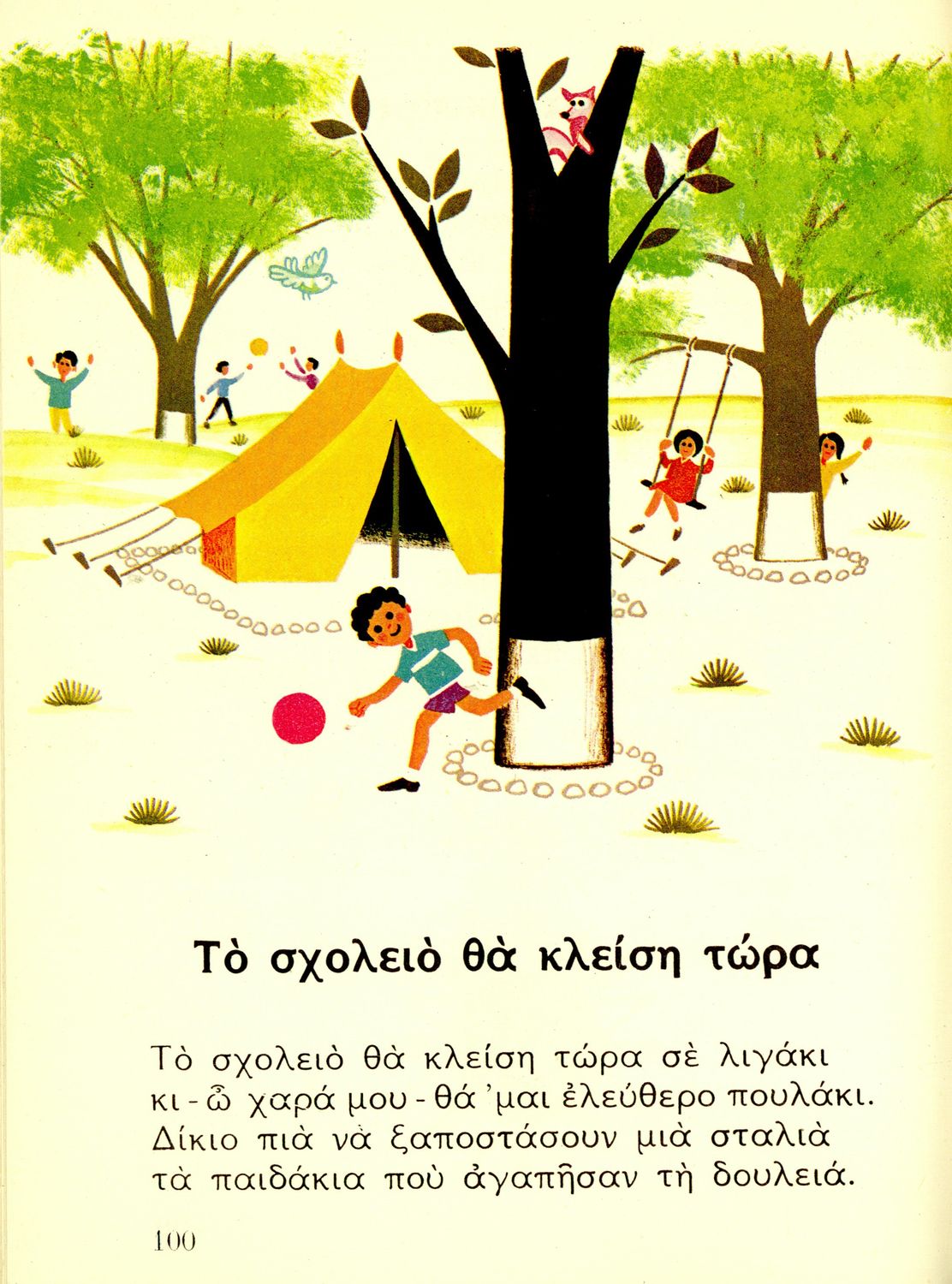 Αναγνωστικό Α΄ Δημοτικού που περιέχει γράμματα, συλλαβές, λέξεις, προτάσεις και κείμενα εμπνευσμένα από την οικογενειακή και κοινωνική ζωή του τόπου. Φέρει το σύμβολο της δικτατορίας.