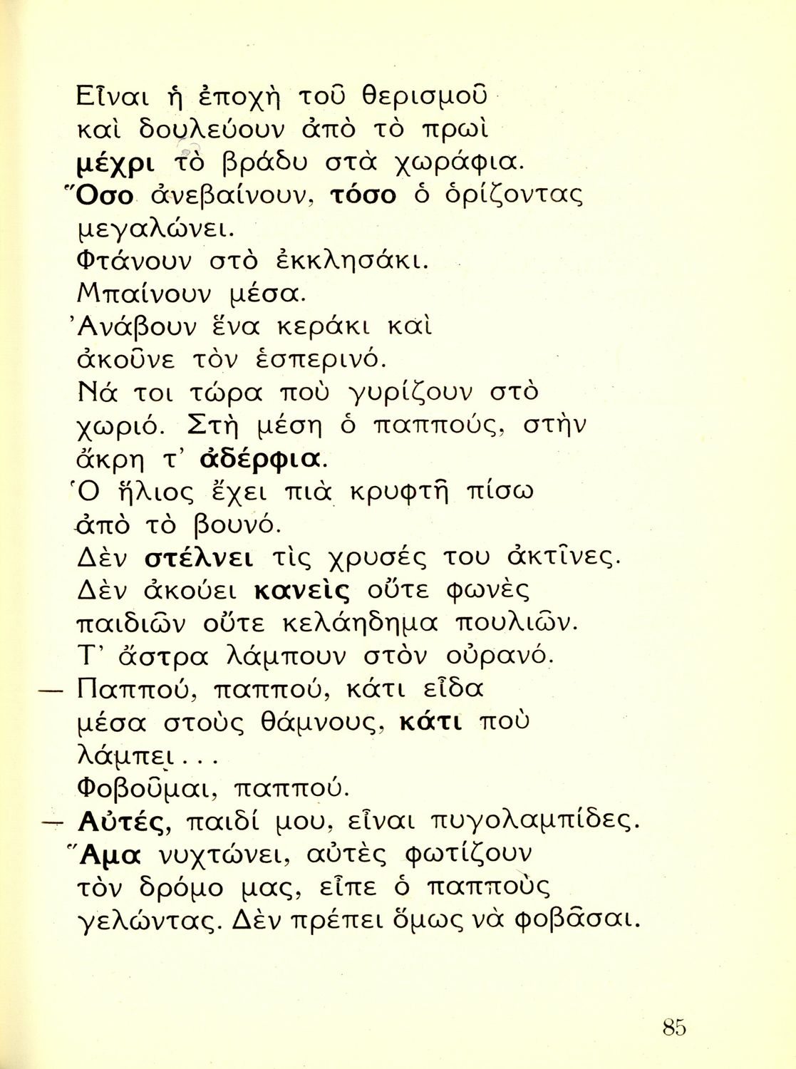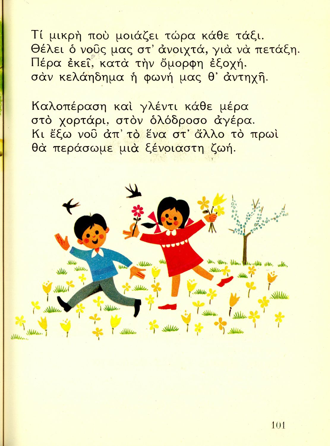 Αναγνωστικό Α΄ Δημοτικού που περιλαμβάνει κείμενα εμπνευσμένα από την εθνική, οικογενειακή, σχολική, θρησκευτική, κοινωνική και καθημερινή ζωή των μικρών παιδιών και ιστορίες για τη φύση και την αγάπη για τα φυτά και τα ζώα.