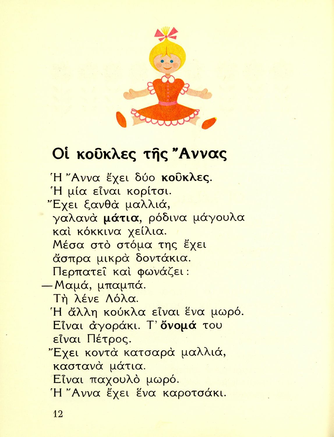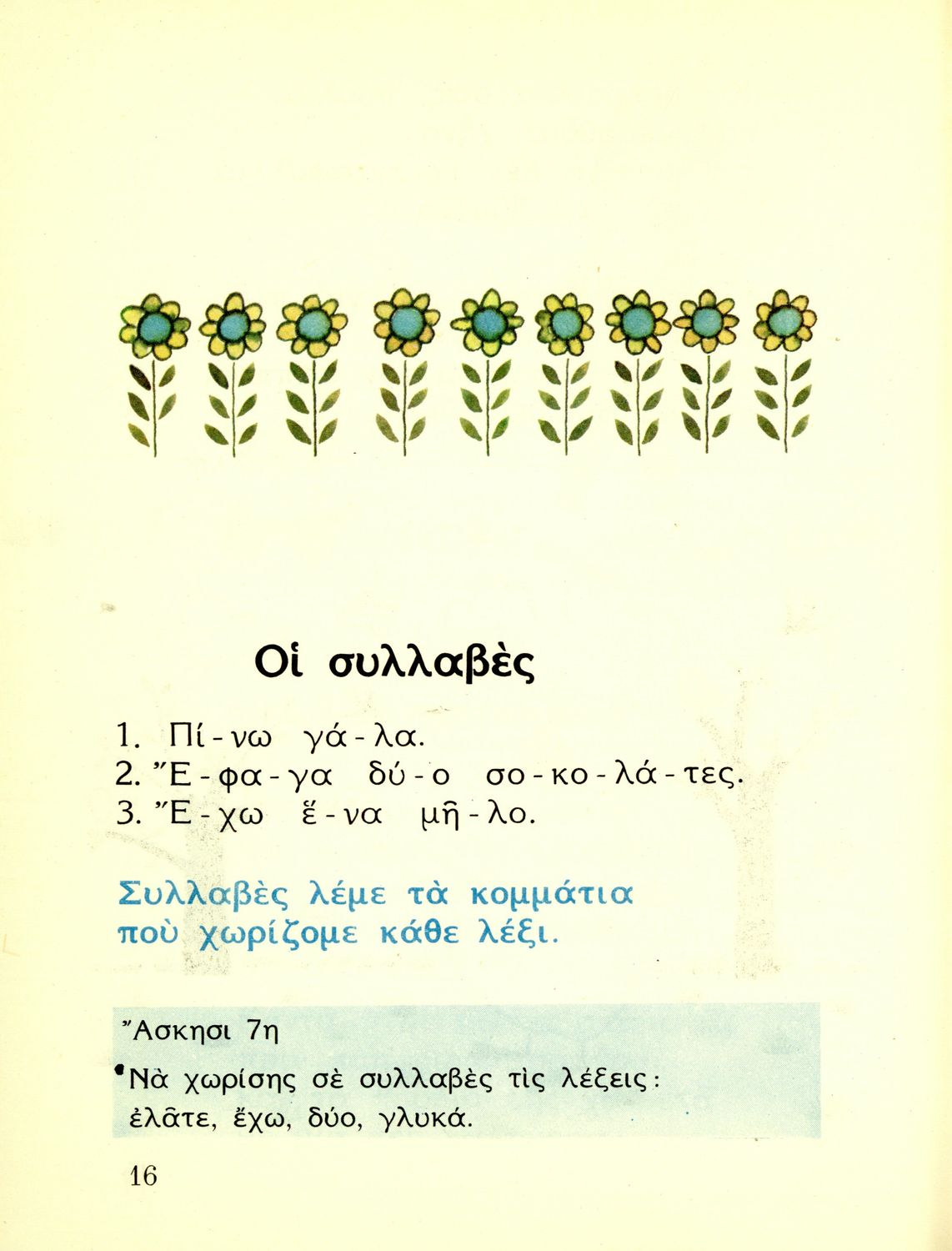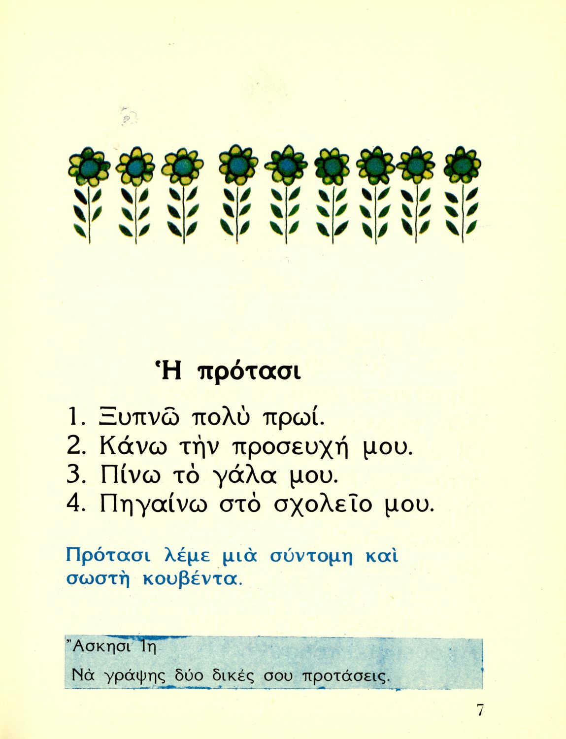 Αναγνωστικό Α΄ Δημοτικού που περιέχει γράμματα, συλλαβές, λέξεις, προτάσεις και κείμενα εμπνευσμένα από την οικογενειακή και κοινωνική ζωή του τόπου. Φέρει το σύμβολο της δικτατορίας.