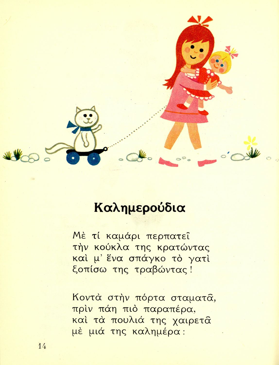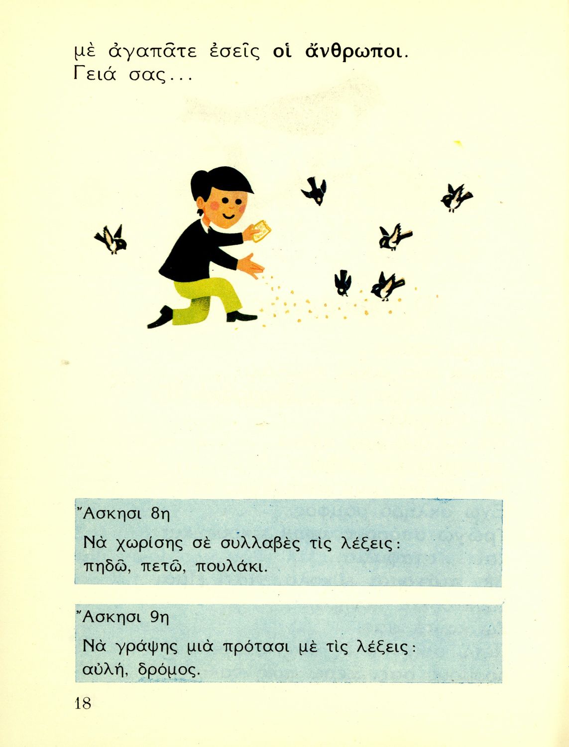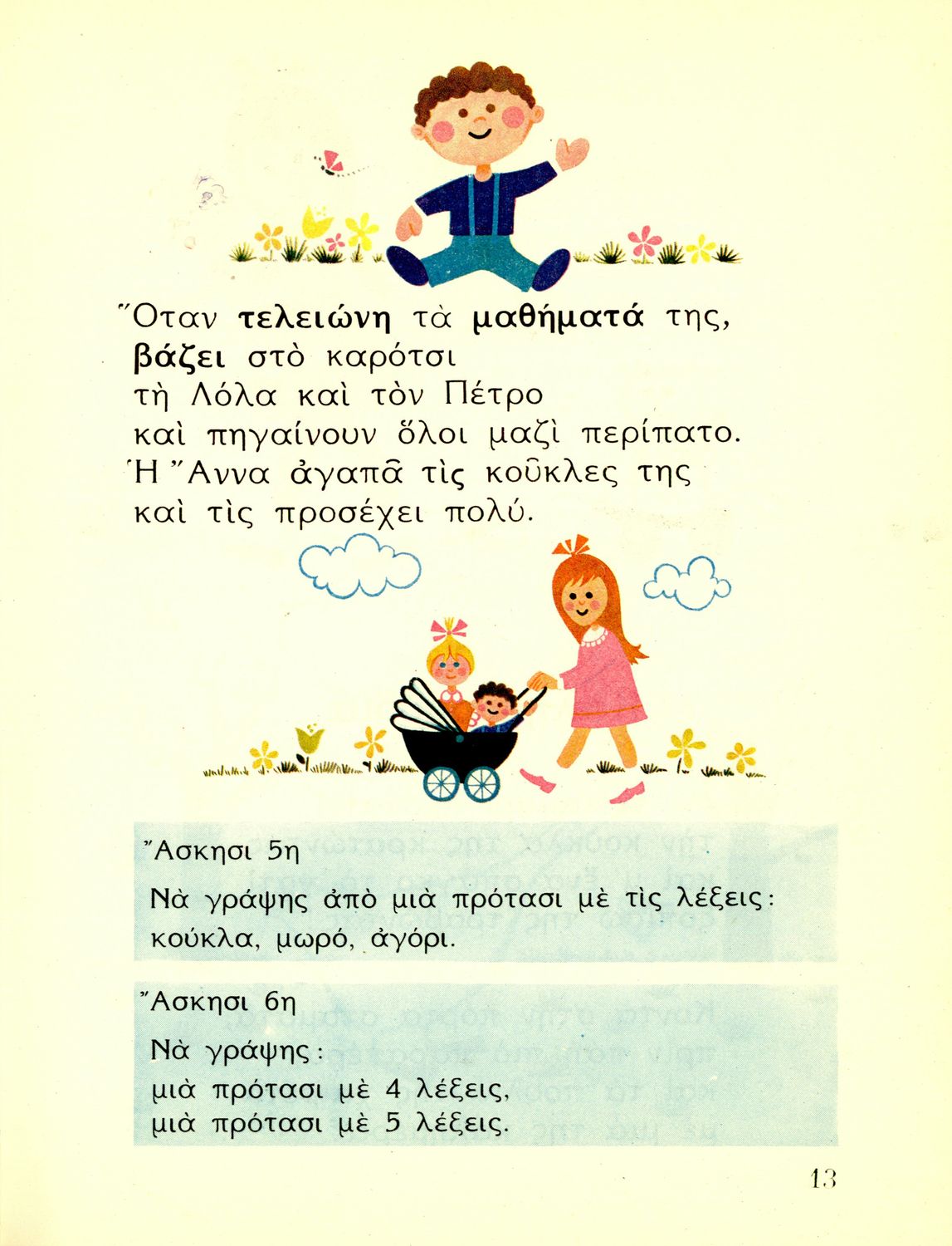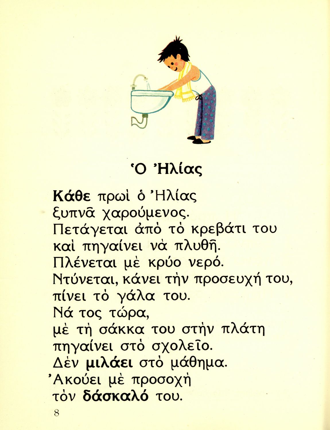 Αναγνωστικό Α΄ Δημοτικού που περιέχει γράμματα, συλλαβές, λέξεις, προτάσεις και κείμενα εμπνευσμένα από την οικογενειακή και κοινωνική ζωή του τόπου. Φέρει το σύμβολο της δικτατορίας.