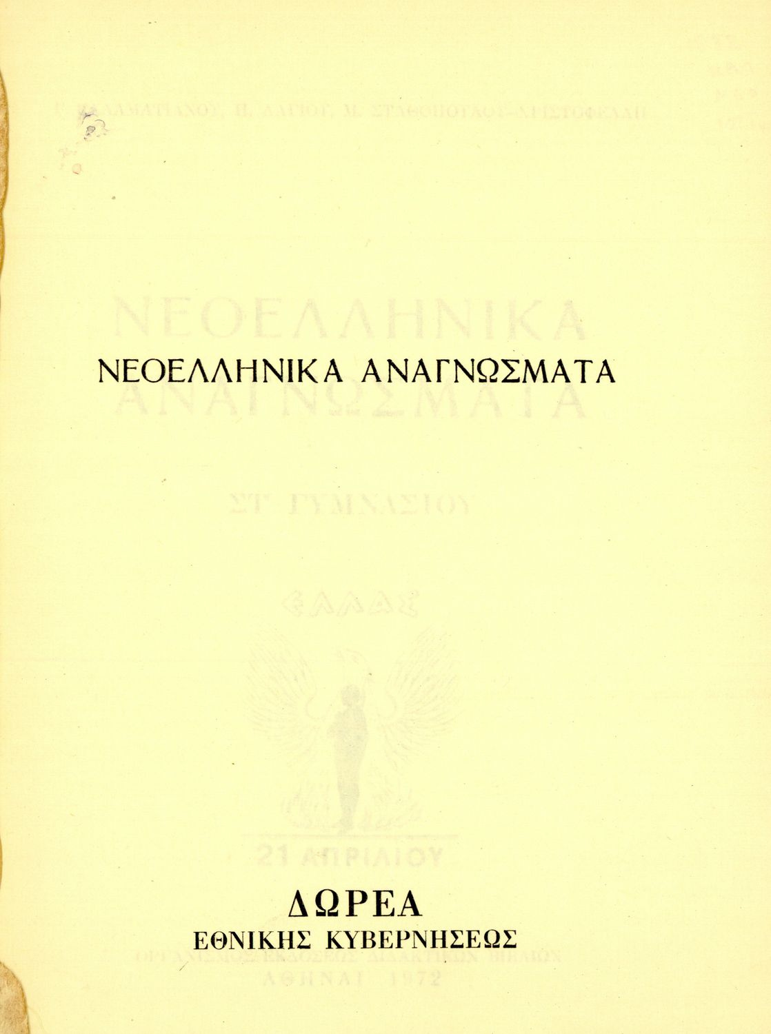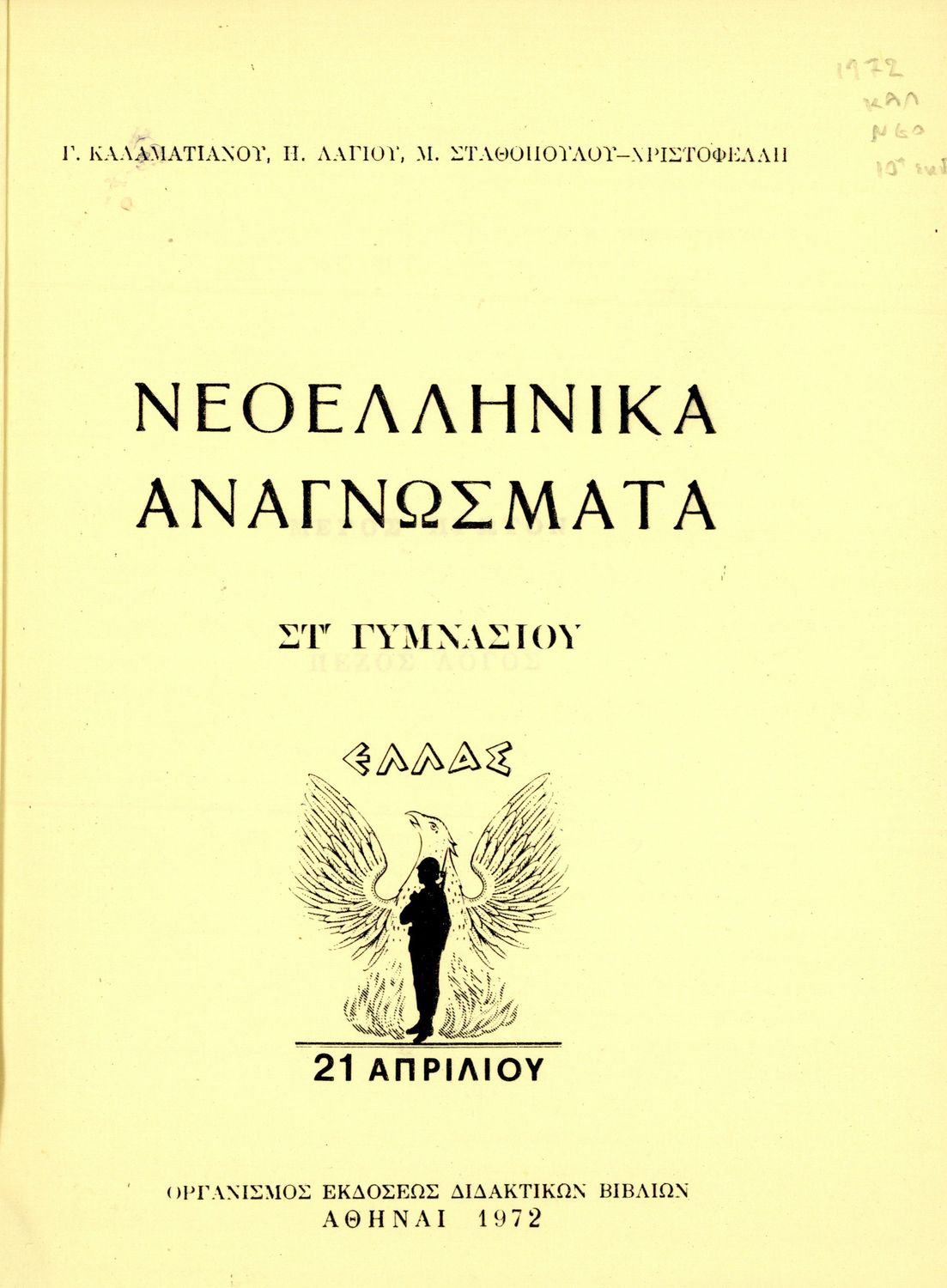 Σχολικό εγχειρίδιο Νέων Ελληνικών ΣΤ΄ Γυμνασίου και Λυκείου που περιλαμβάνει κείμενα Ελλήνων και ξένων συγγραφέων με θέματα από την σύγχρονη ελληνική ιστορία και την οικογενειακή και θρησκευτική ζωή, και ...