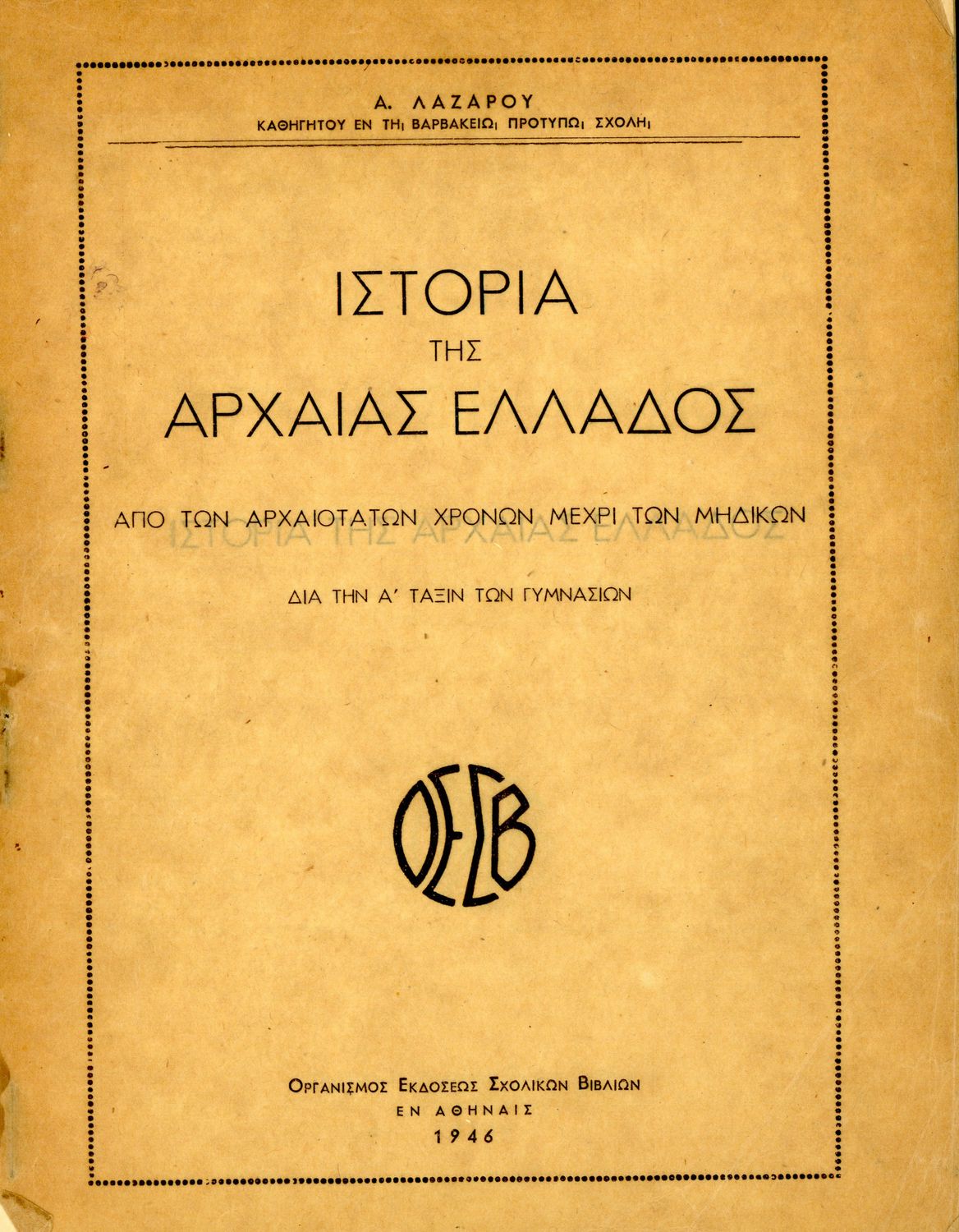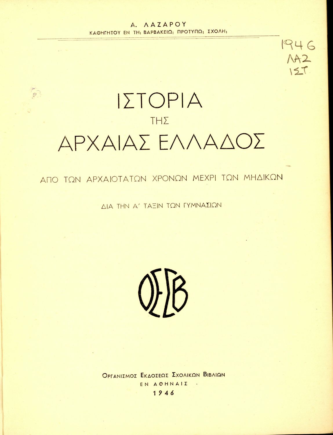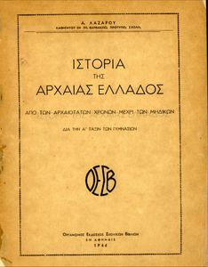 Κωδικός αναγνώρισης: 02-01016 Τίτλος: Ιστορία της Αρχαίας Ελλάδος, από των αρχαιοτάτων χρόνων μέχρι των μηδικών, δια την Α΄ τάξιν των Γυμνασίων Συγγραφέας: Α. Λαζάρου Μέγεθος και υπόστρωμα: Σχολικό εγχειρίδιο, μαλακό εξώφυλλο, 140 σελίδες. Σκίτσα (ασπρόμαυρα). |