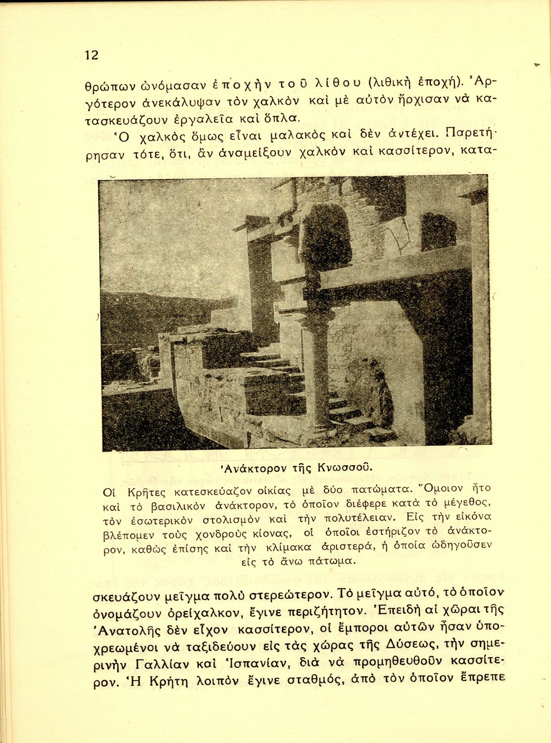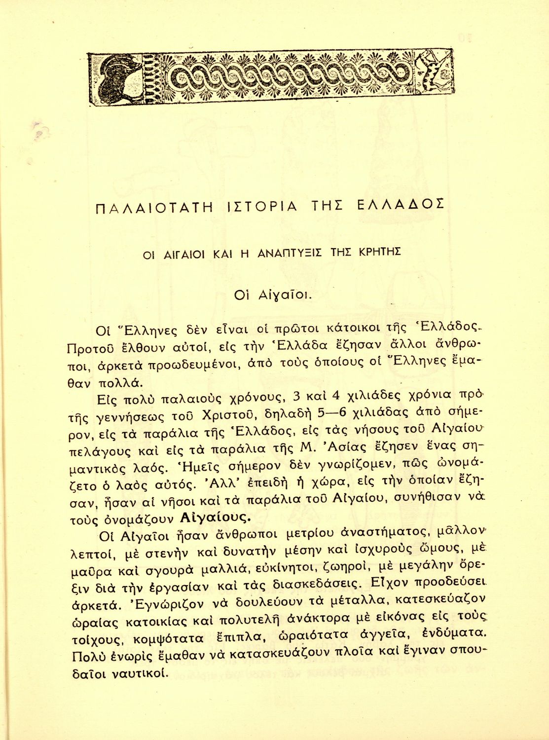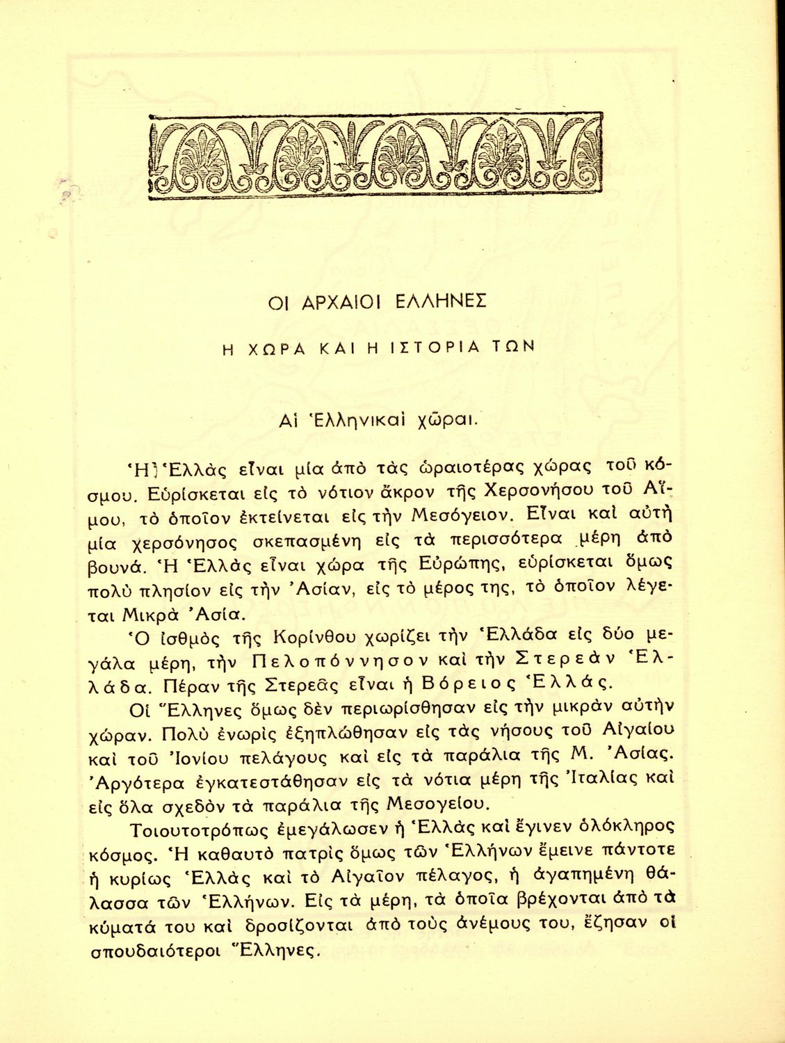 Βαθμίδα εκπαίδευσης: Δευτεροβάθμια Τάξη: Α' Γυμνασίου Μάθημα: Ιστορία Γλώσσα: Απλή καθαρεύουσα Παρουσίαση περιεχομένου: Σχολικό εγχειρίδιο Ιστορίας Α΄ Γυμνασίου που καλύπτει την περίοδο από τους προϊστορικούς χρόνους ως τις μεταρρυθμίσεις του Κλεισθένη. Περιέχει και εκτενή αναφορά στην ανάπτυξη των γραμμάτων, των τεχνών και του εμπορίου. |