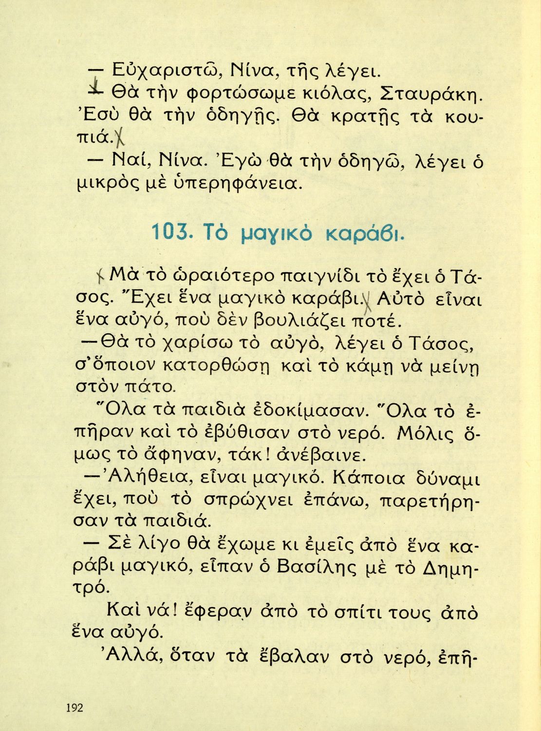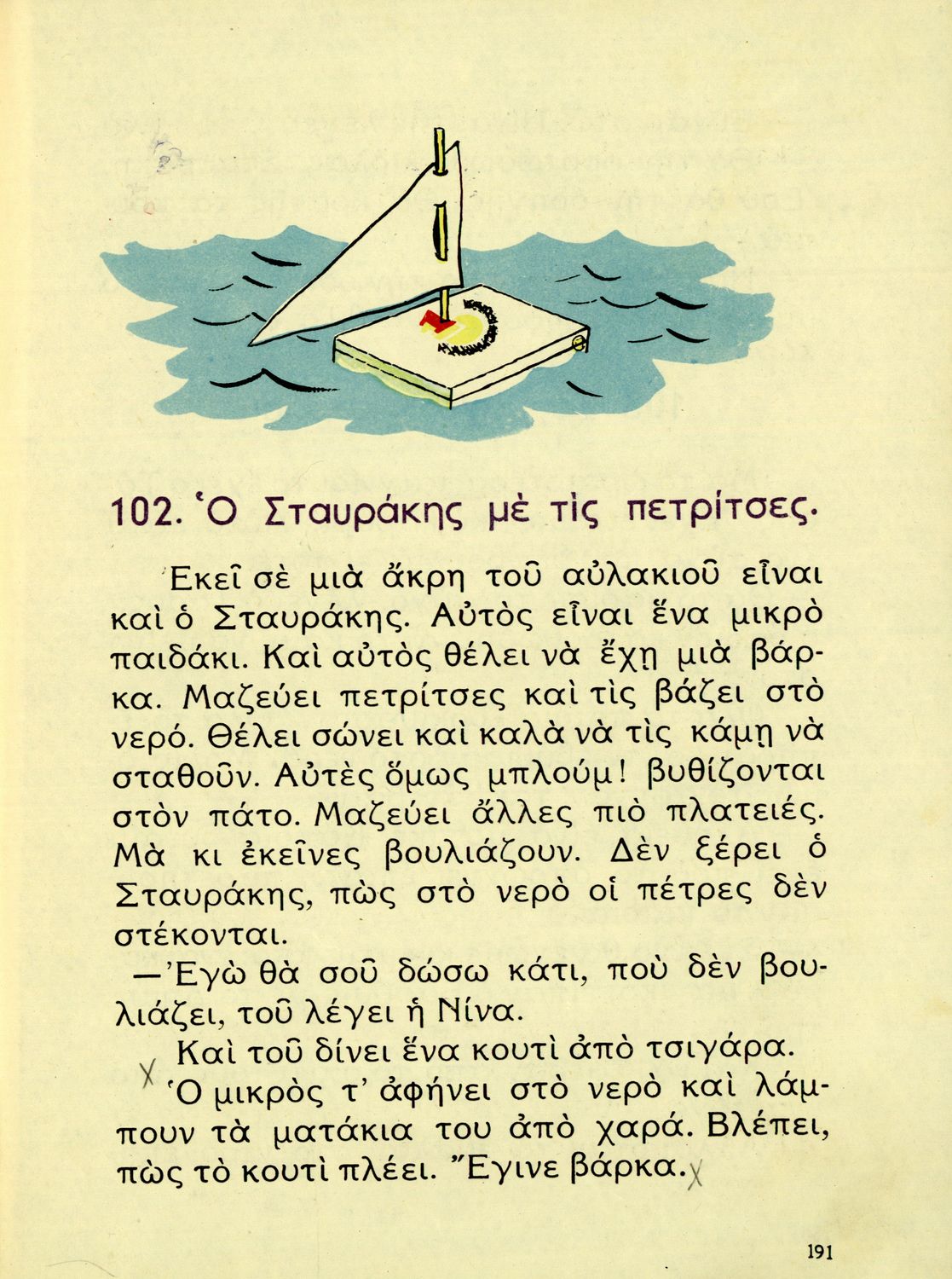 520 ## _aΑναγνωστικό Β' Δημοτικού που είναι χωρισμένο σύμφωνα με τις εποχές του χρόνου και περιλαμβάνει κείμενα ηθοποιητικού περιεχομένου εμπνευσμένα από τη θρησκευτική, εθνική, κοινωνική και οικογενειακή ζωή.