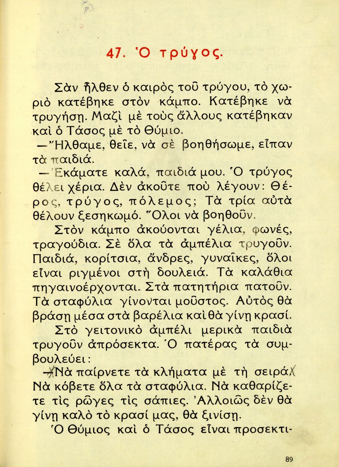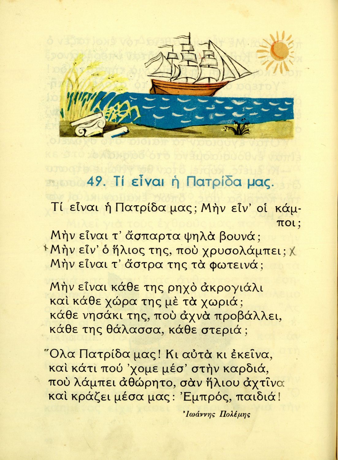 Αναγνωστικό Ε΄ Δημοτικού που περιέχει πεζά και ποιήματα εμπνευσμένα από τη θρησκευτική, εθνική, κοινωνική ζωή καθώς και από τις ασχολίες των Ελλήνων, την αρχαία και σύγχρονη ελληνική ιστορία και τον πολιτισμό.