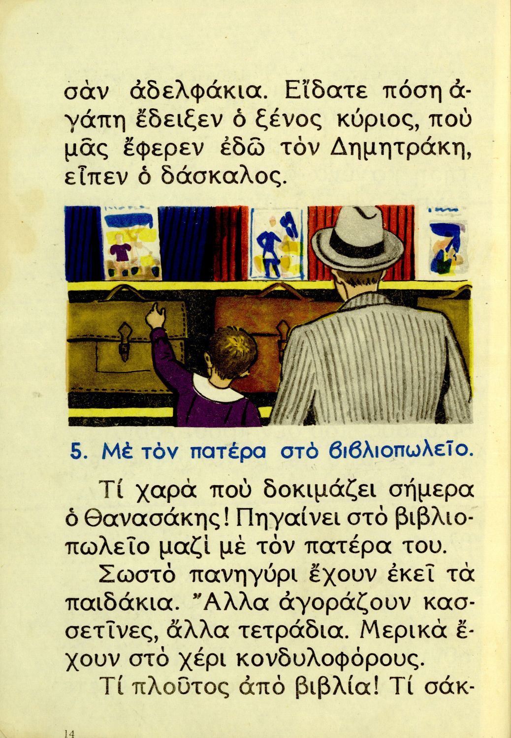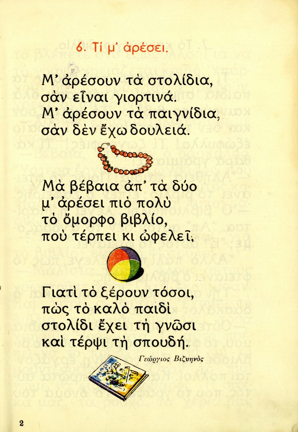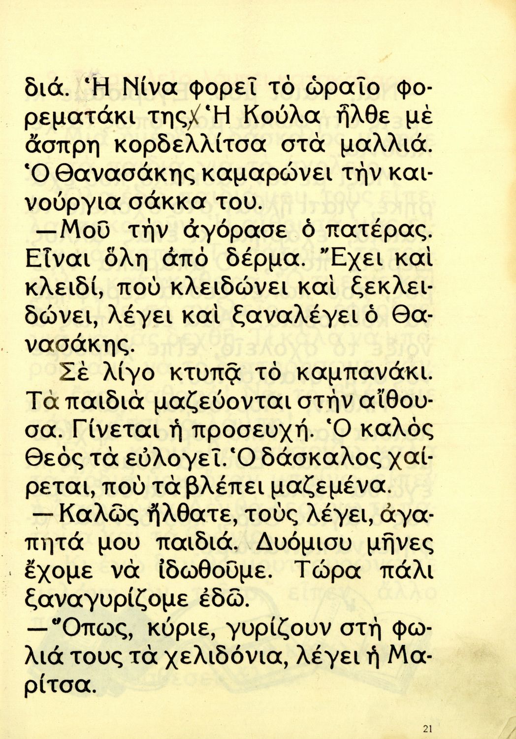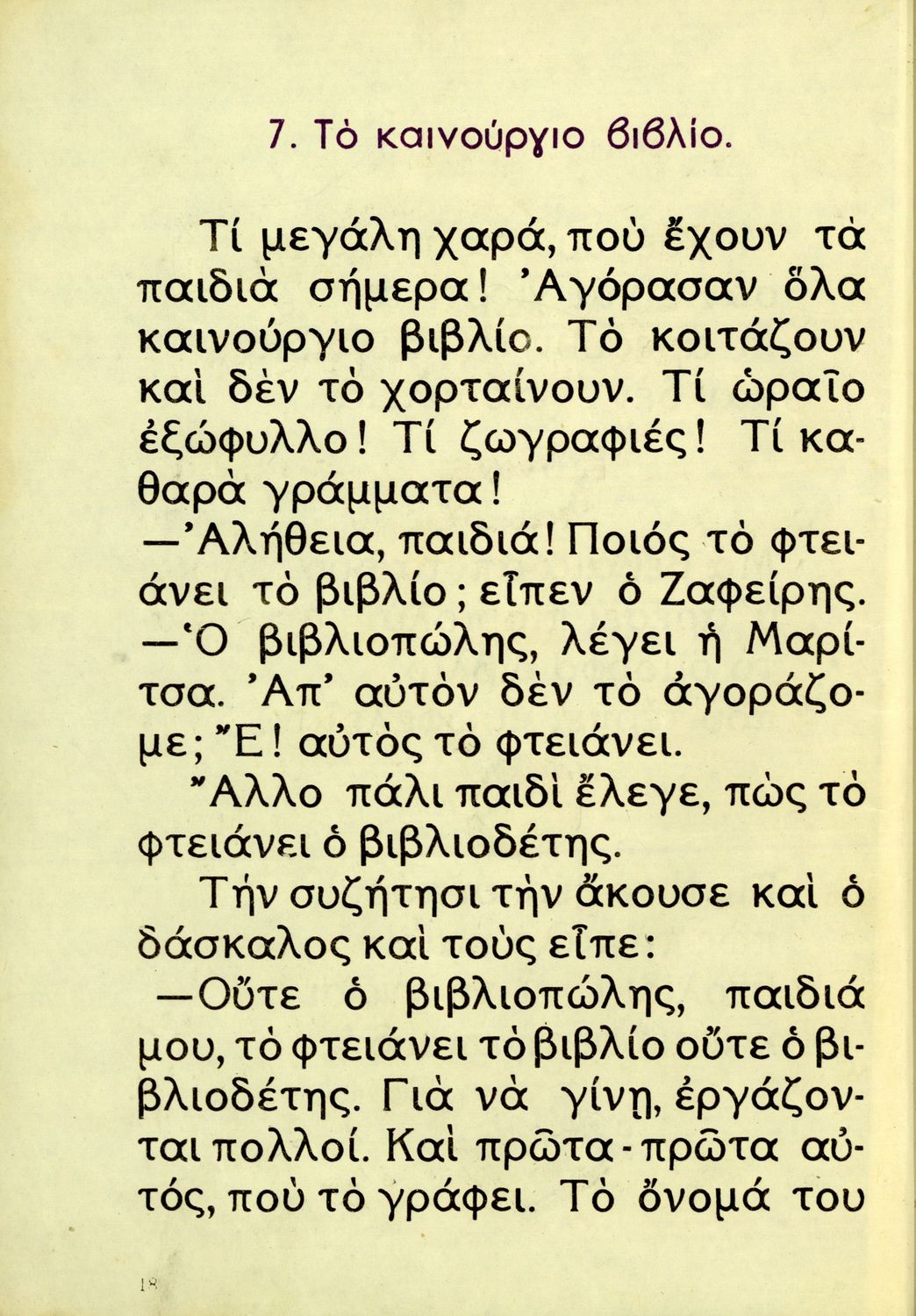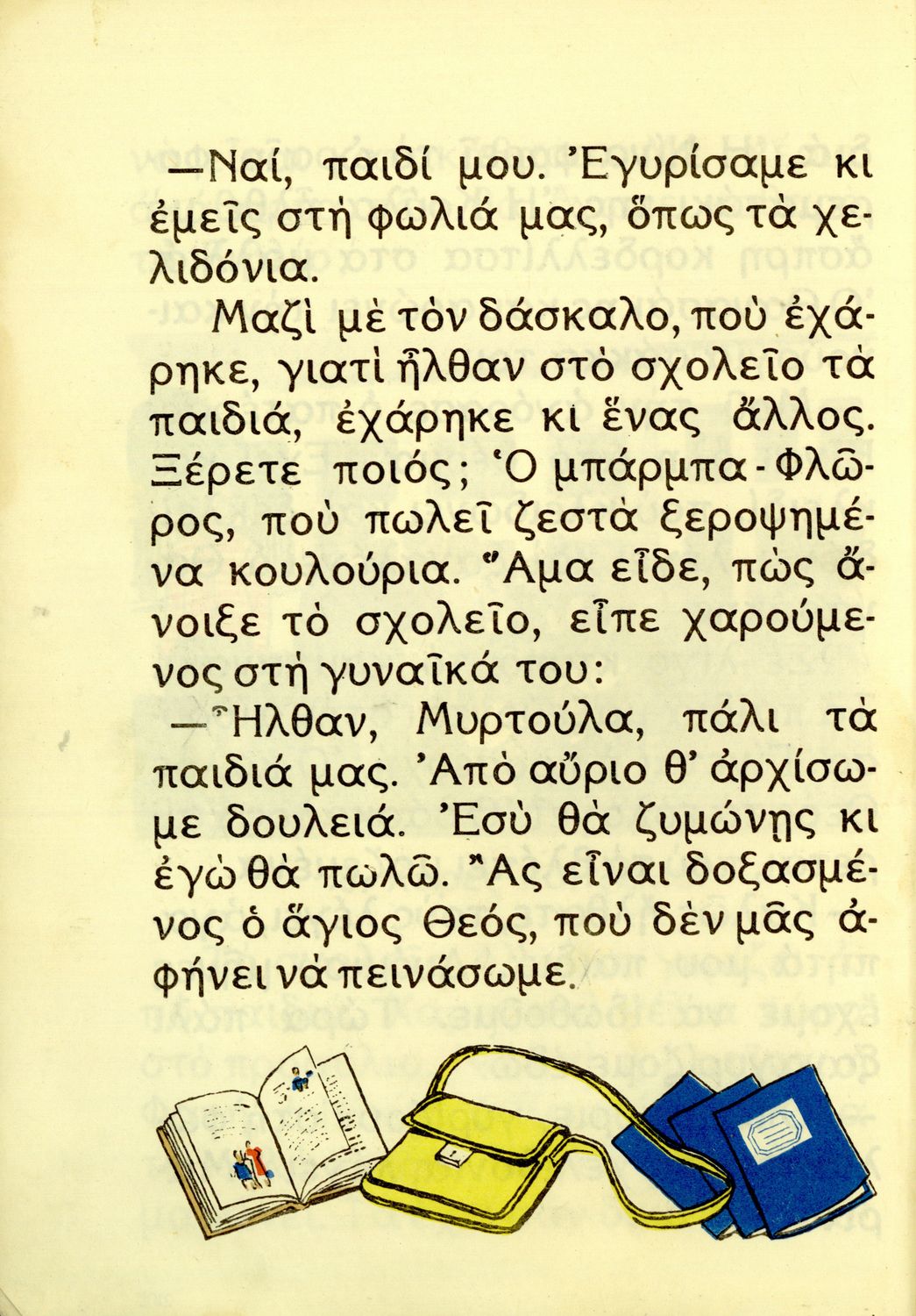 Βαθμίδα εκπαίδευσης: Πρωτοβάθμια Τάξη: Β' Δημοτικού Μάθημα: Νέα Ελληνικά Γλώσσα: Δημοτική με στοιχεία καθαρεύουσας Παρουσίαση περιεχομένου: Αναγνωστικό Β' Δημοτικού που είναι χωρισμένο σύμφωνα με τις εποχές του χρόνου και περιλαμβάνει κείμενα ηθοποιητικού περιεχομένου εμπνευσμένα από τη θρησκευτική, εθνική, κοινωνική και οικογενειακή ζωή. |