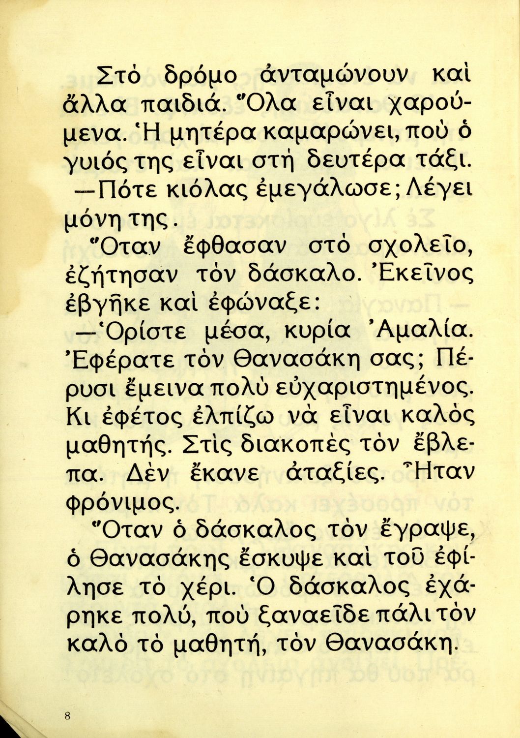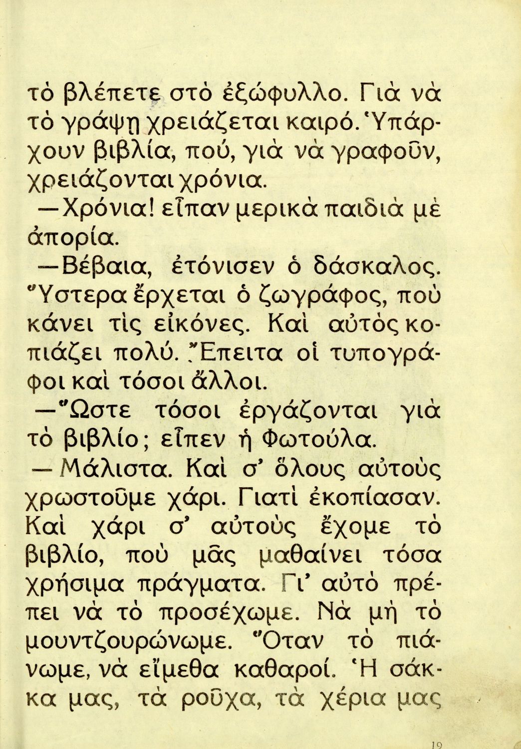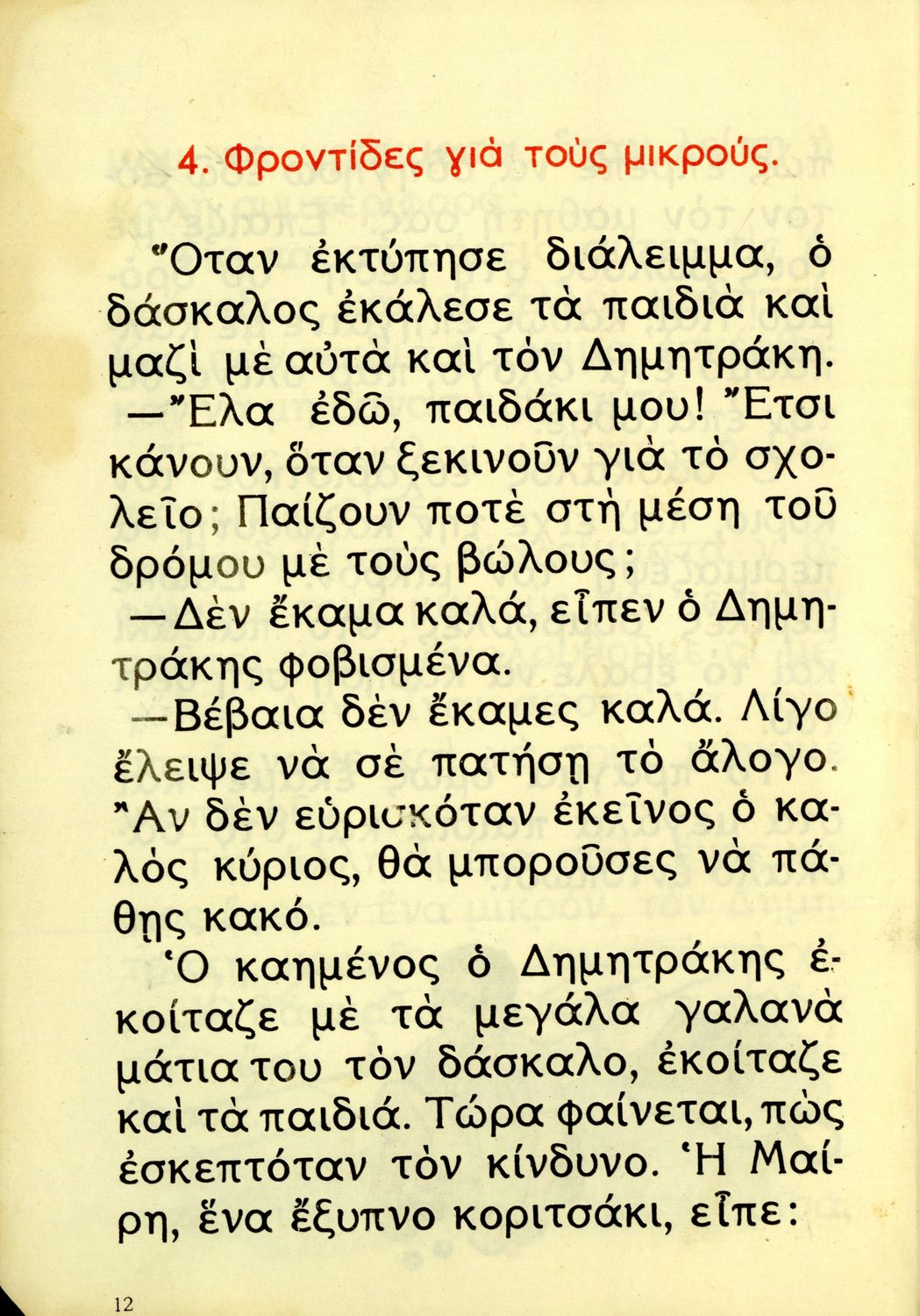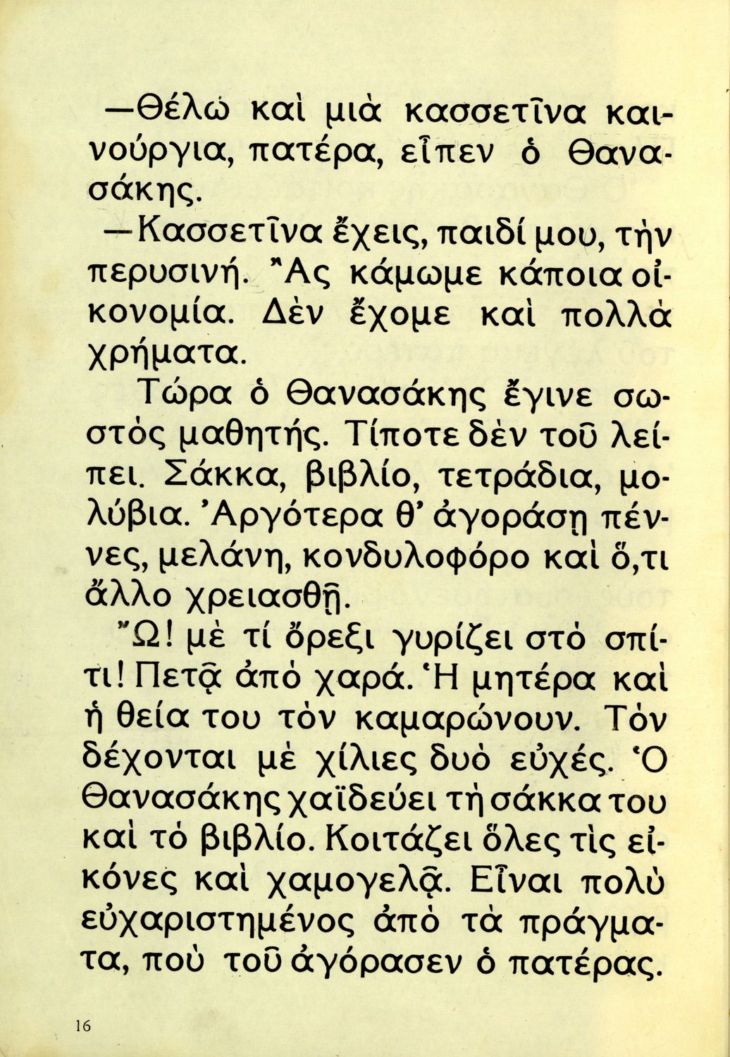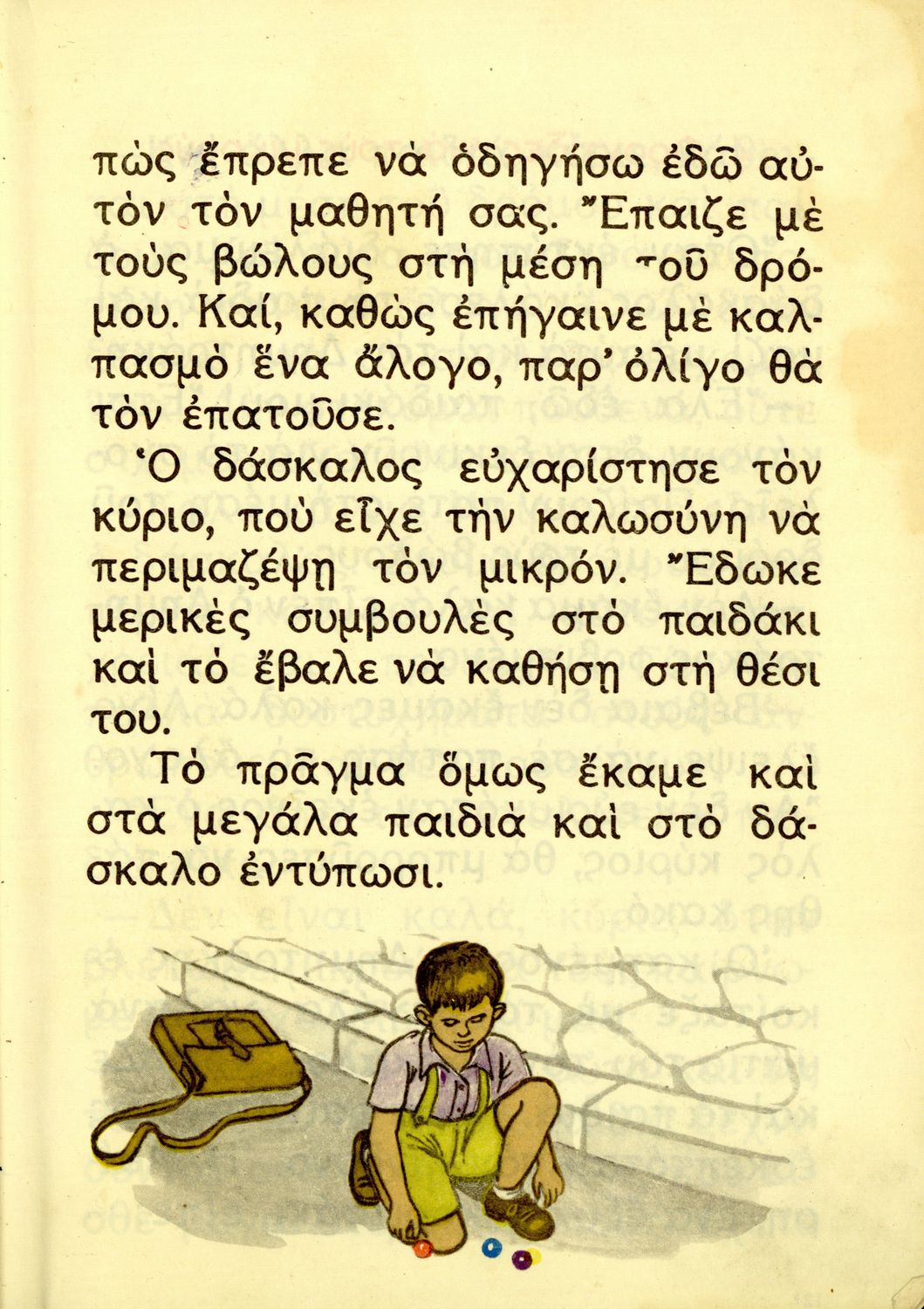 Βαθμίδα εκπαίδευσης: Πρωτοβάθμια Τάξη: Β' Δημοτικού Μάθημα: Νέα Ελληνικά Γλώσσα: Δημοτική με στοιχεία καθαρεύουσας Παρουσίαση περιεχομένου: Αναγνωστικό Β' Δημοτικού που είναι χωρισμένο σύμφωνα με τις εποχές του χρόνου και περιλαμβάνει κείμενα ηθοποιητικού περιεχομένου εμπνευσμένα από τη θρησκευτική, εθνική, κοινωνική και οικογενειακή ζωή. |