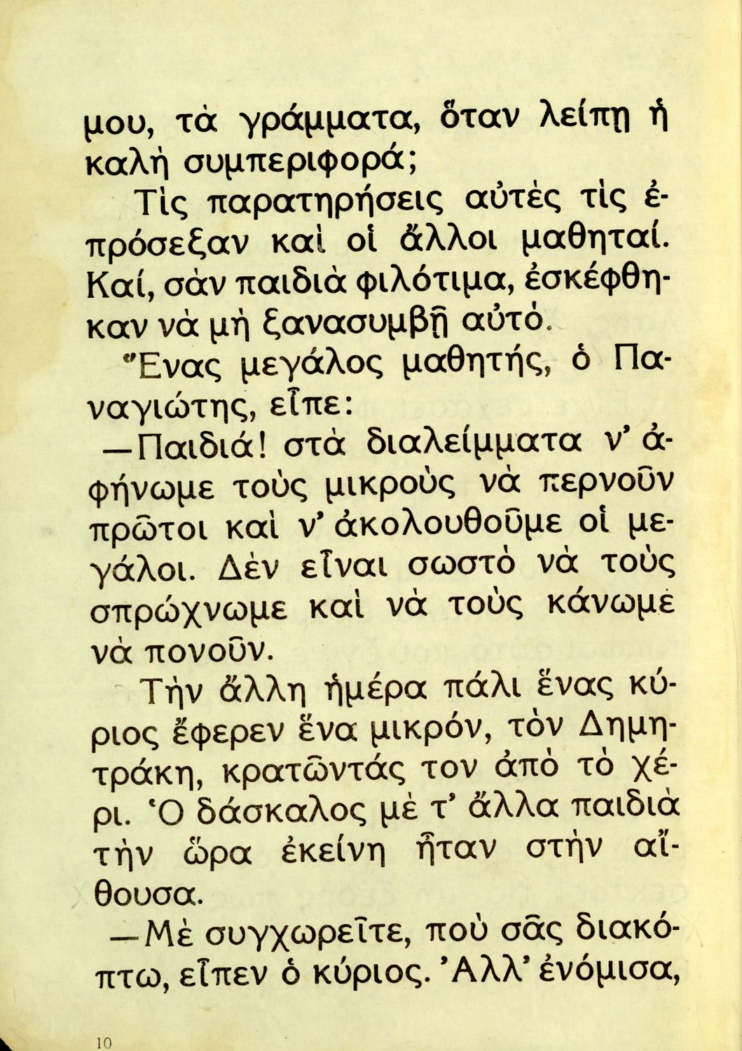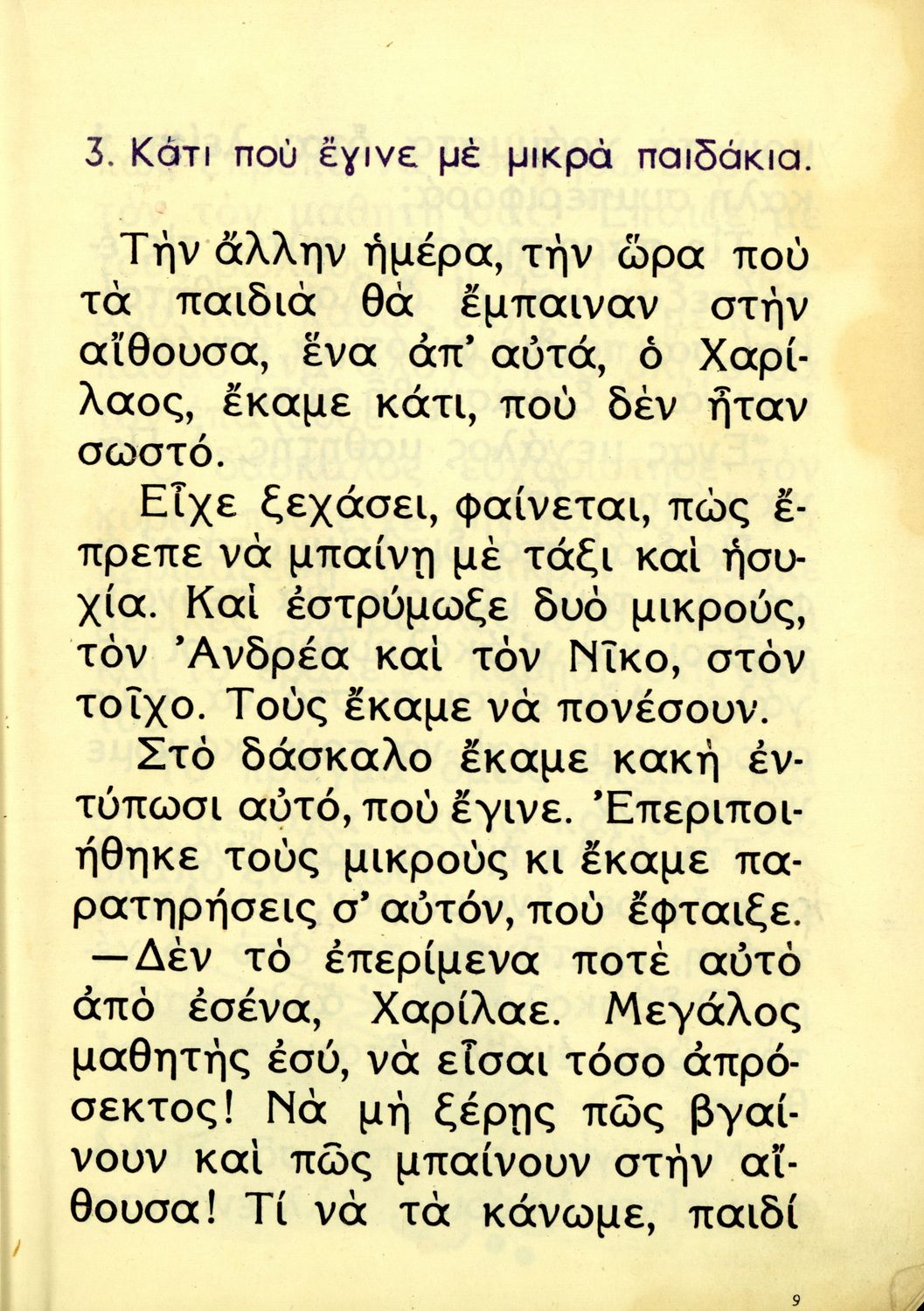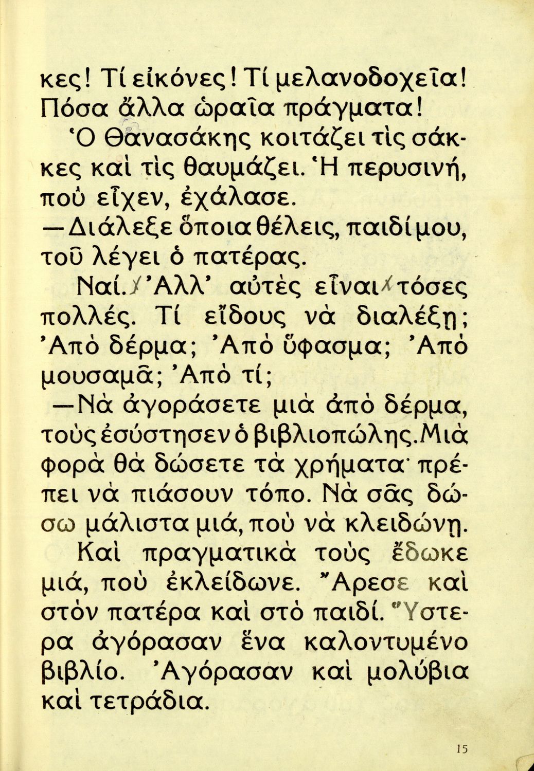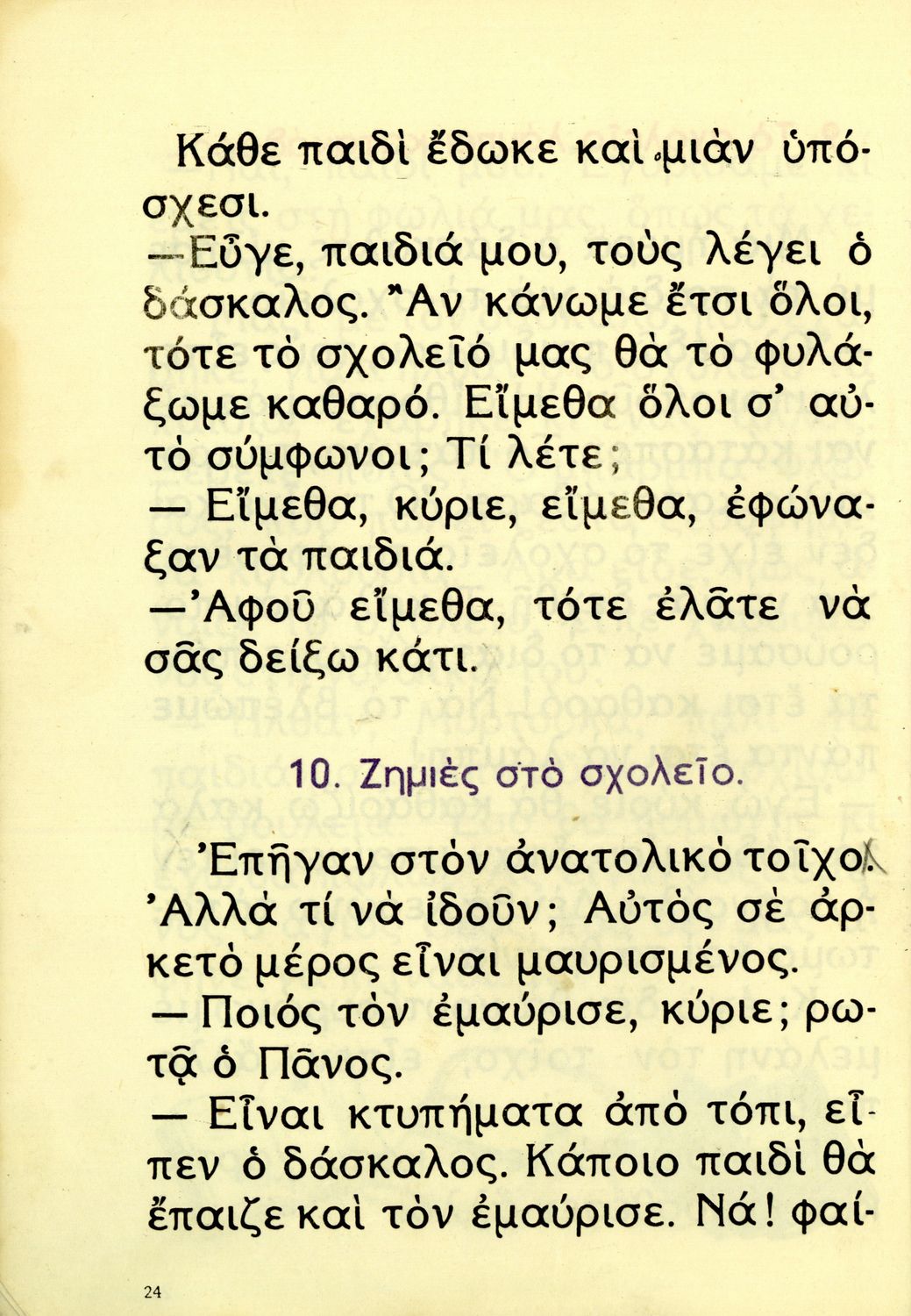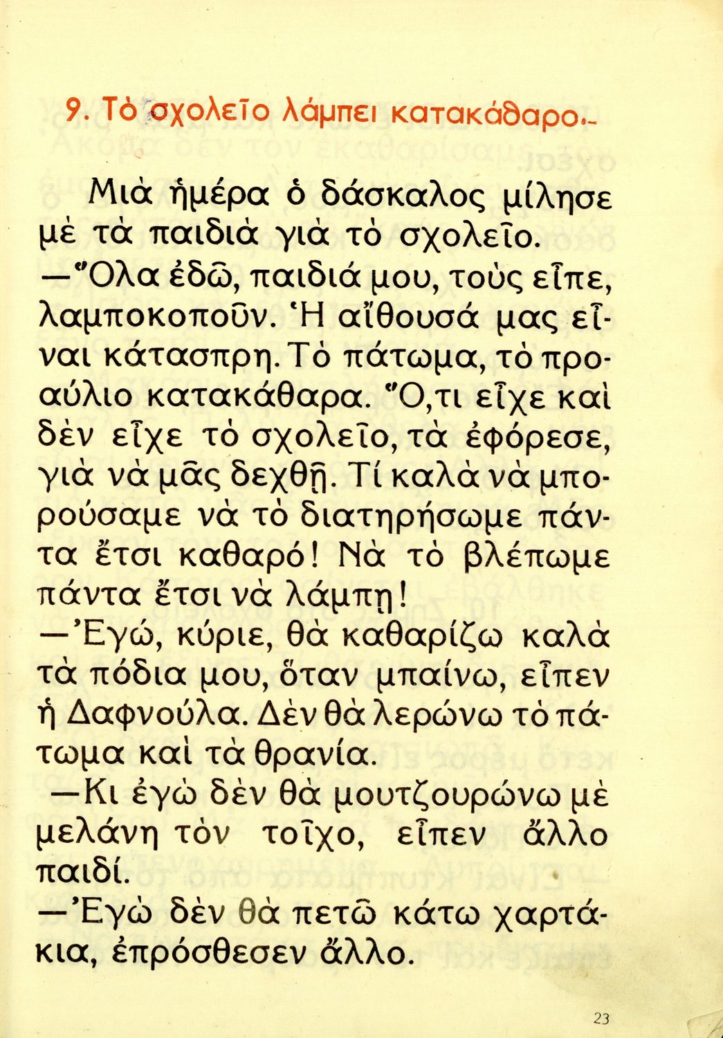 Βαθμίδα εκπαίδευσης: Πρωτοβάθμια Τάξη: Β' Δημοτικού Μάθημα: Νέα Ελληνικά Γλώσσα: Δημοτική με στοιχεία καθαρεύουσας Παρουσίαση περιεχομένου: Αναγνωστικό Β' Δημοτικού που είναι χωρισμένο σύμφωνα με τις εποχές του χρόνου και περιλαμβάνει κείμενα ηθοποιητικού περιεχομένου εμπνευσμένα από τη θρησκευτική, εθνική, κοινωνική και οικογενειακή ζωή. |