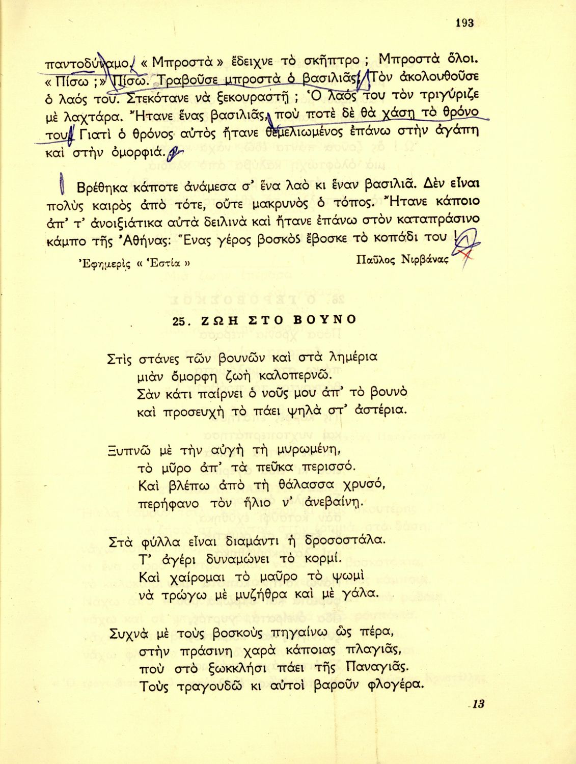 Σχολικό εγχειρίδιο Νέων Ελληνικών Β' Γυμνασίου που περιέχει ποιήματα και πεζά Ελλήνων συγγραφέων εμπνευσμένα από τη θρησκευτική, εθνική, οικογενειακή και κοινωνική ζωή και την ελληνική φύση. Περιέχει παράρτημα με βιογραφίες των συγγραφέων και λεξιλόγιο. Φέρει το σύμβολο της δικτατορίας.