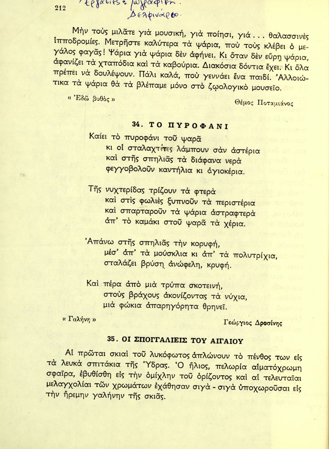 Σχολικό εγχειρίδιο Νέων Ελληνικών Β' Γυμνασίου που περιέχει ποιήματα και πεζά Ελλήνων συγγραφέων εμπνευσμένα από τη θρησκευτική, εθνική, οικογενειακή και κοινωνική ζωή και την ελληνική φύση. Περιέχει παράρτημα
