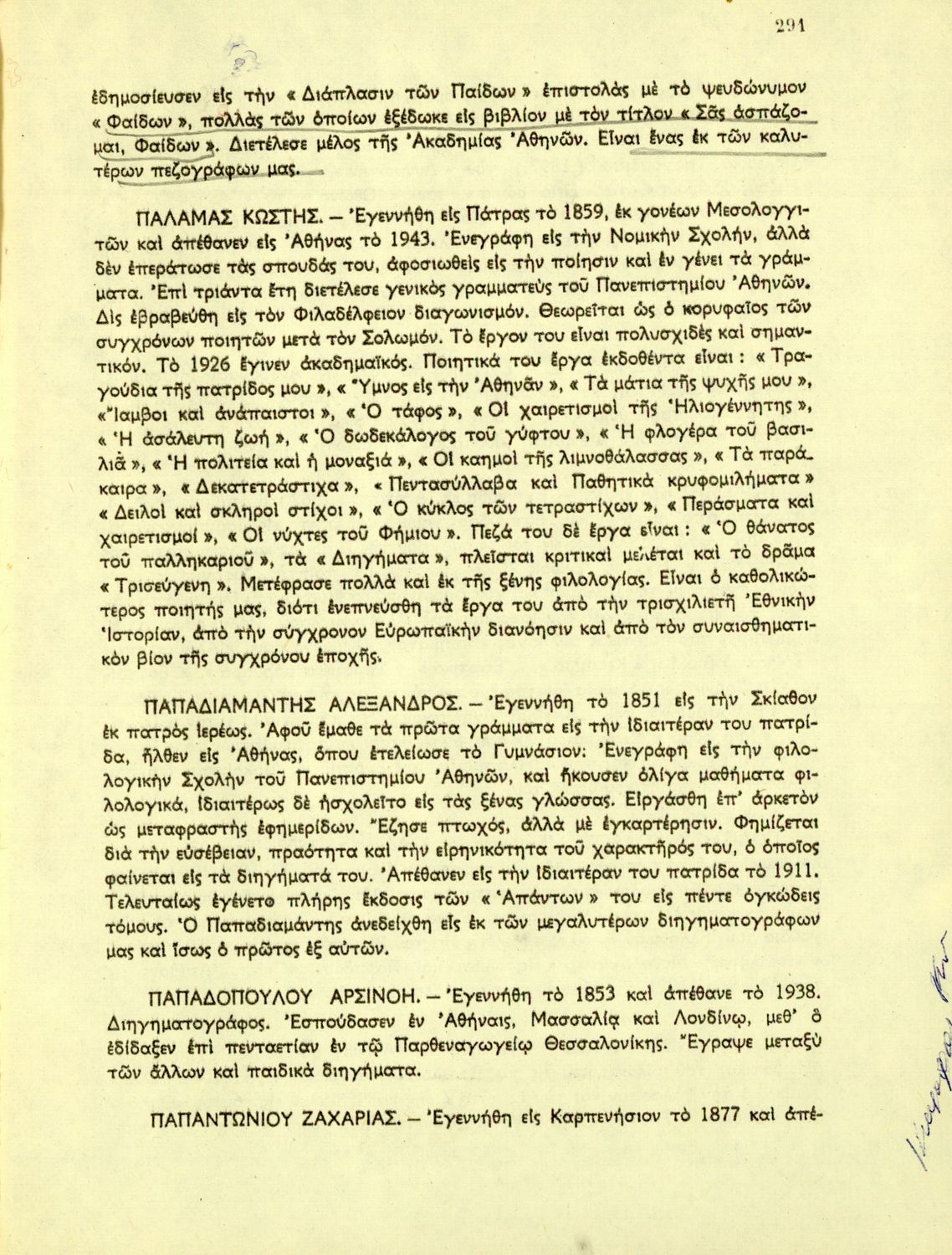 Σχετιζόμενοι όροι:  Βάμβας, Κοραής, Παλαμάς, Παπαδιαμάντης