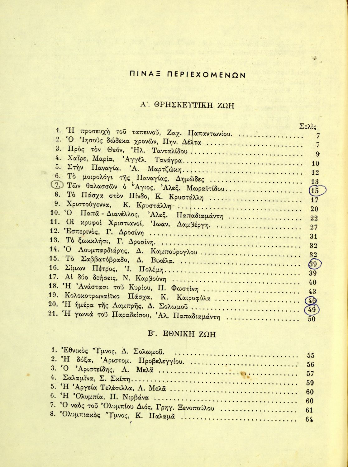 Σχολικό εγχειρίδιο Νέων Ελληνικών Δ΄ Γυμνασίου και Β΄ Αστικού Σχολείου που περιέχει πεζά και ποιήματα Ελλήνων συγγραφέων εμπνευσμένα από τη θρησκευτική και κοινωνική ζωή, την ελληνική μυθολογία, την αρχαία και