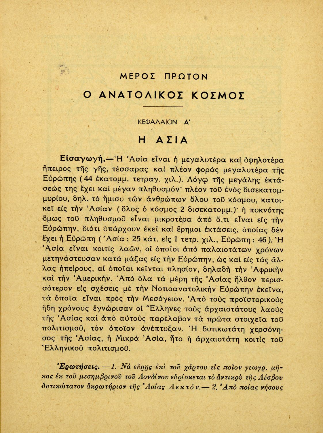 Πρόκειται για σχολικό εγχειρίδιο το οποίο προοριζόταν για τη διδασκαλία του μαθήματος της φυσικής και πολιτικής γεωγραφία της Ασίας, Αφρικής, Αμερικής και Αυστραλίας στην Α΄ τάξη των Ελληνικών Σχολείων. Φέρει ...