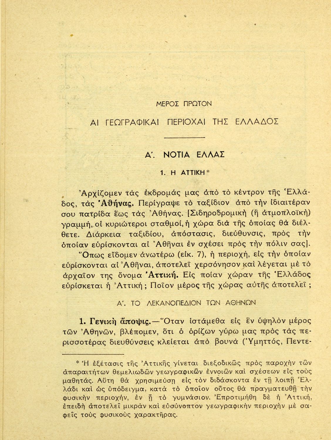 Σχολικό εγχειρίδιο Γεωγραφίας Α' Γυμνασίου που εξετάζει την Ελλάδα ανά διαμέρισμα και νομό από γεωφυσική, οικονομική και πολιτική άποψη.