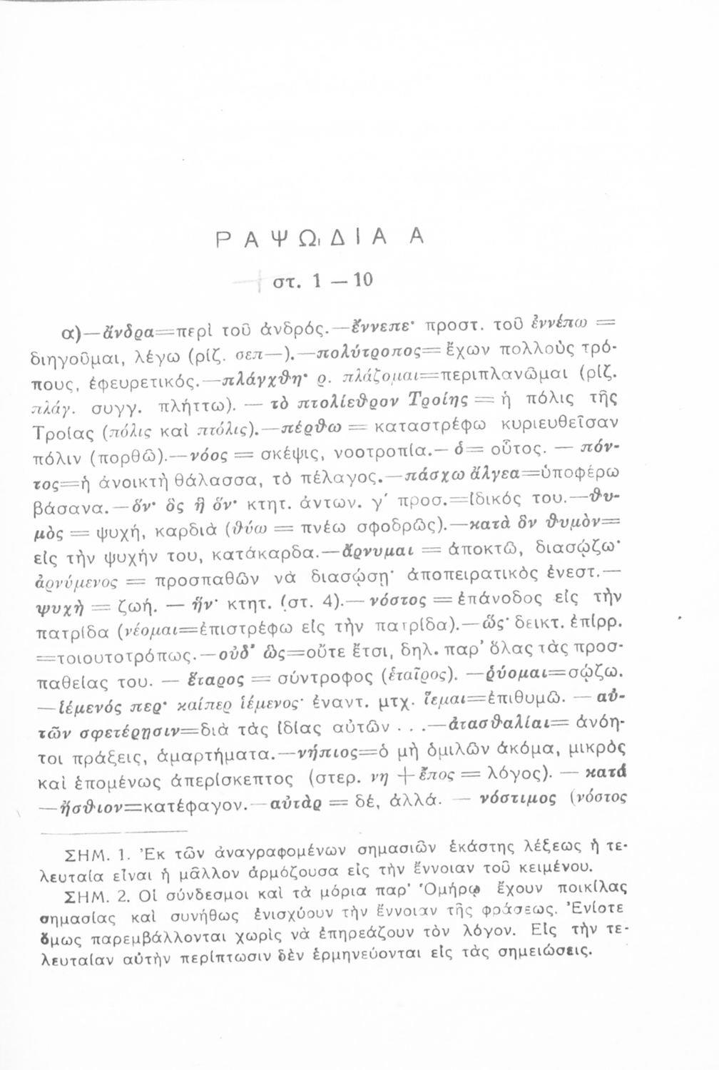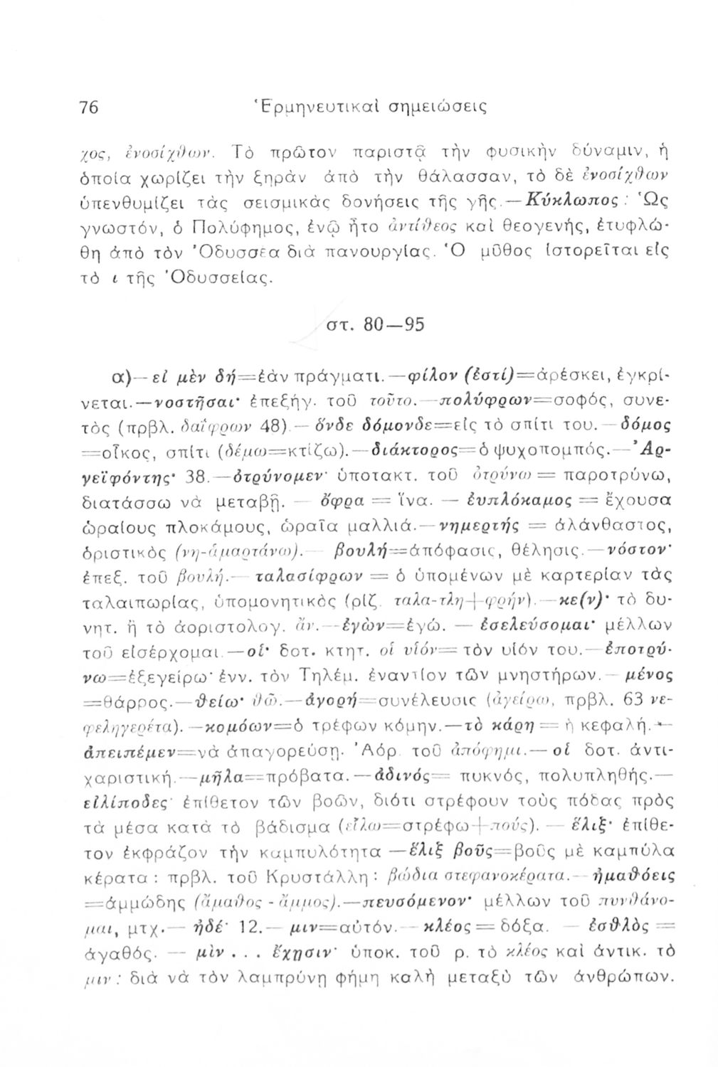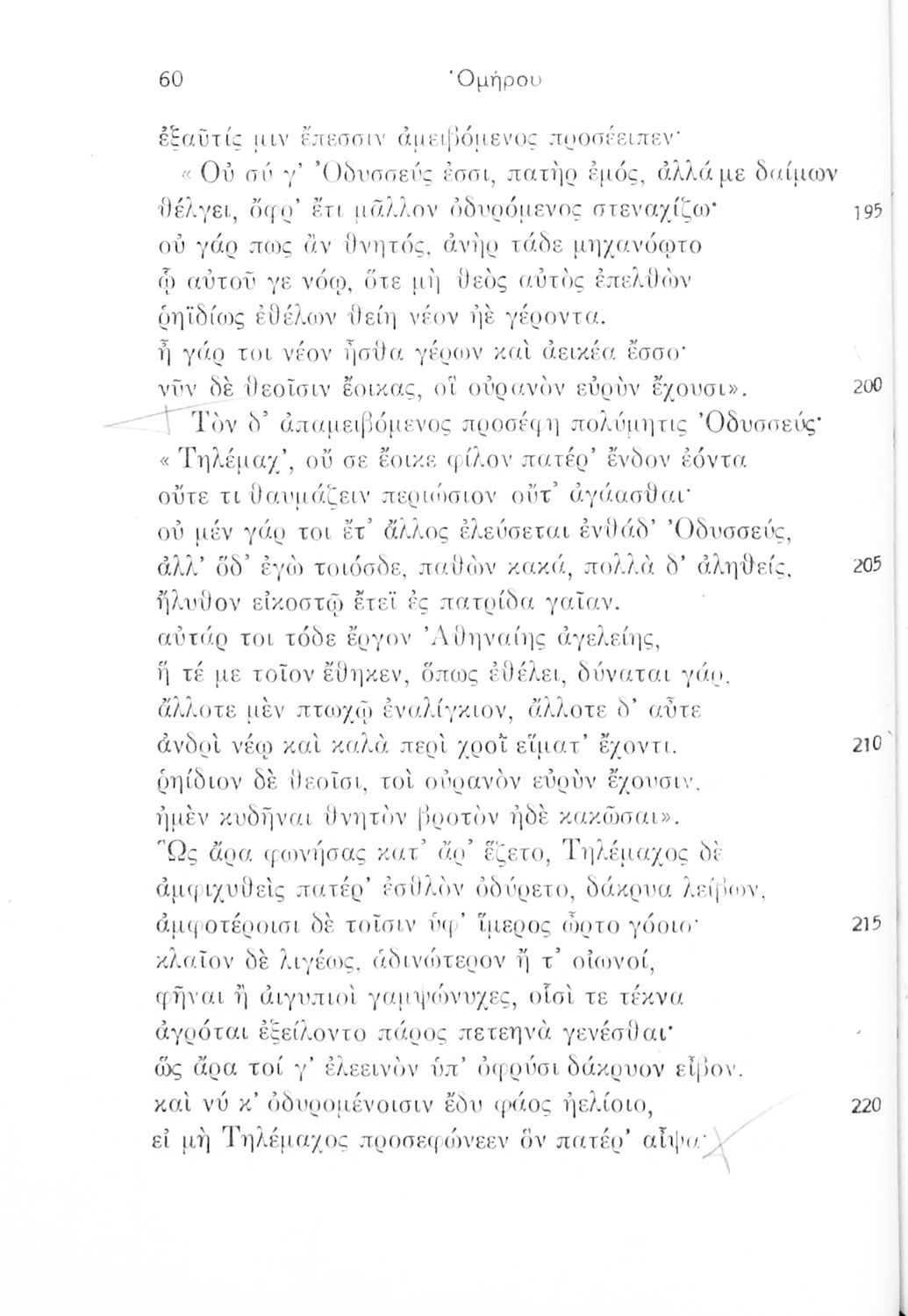 Σχολικό εγχειρίδιο Αρχαίων Ελληνικών Γυμνασίου που περιλαμβάνει αποσπάσματα από τις ραψωδίες της Οδύσσειας, ερμηνευτικά και πραγματολογικά σχόλια, και λεξιλογικές παρατηρήσεις.