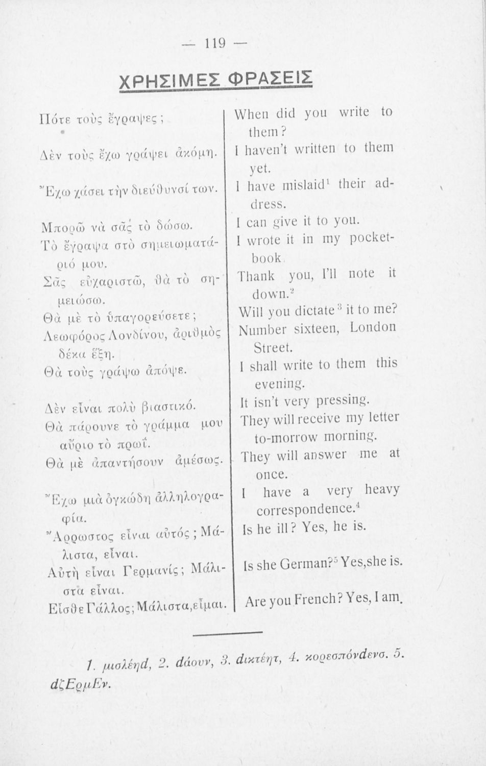 Μαθητικό βοήθημα Αγγλικών που περιλαμβάνει λέξεις και φράσεις στα ελληνικά και αγγλικά και την προφορά τους. Περιέχει και υποδείγματα επιστολών και σύντομες συνομιλίες.