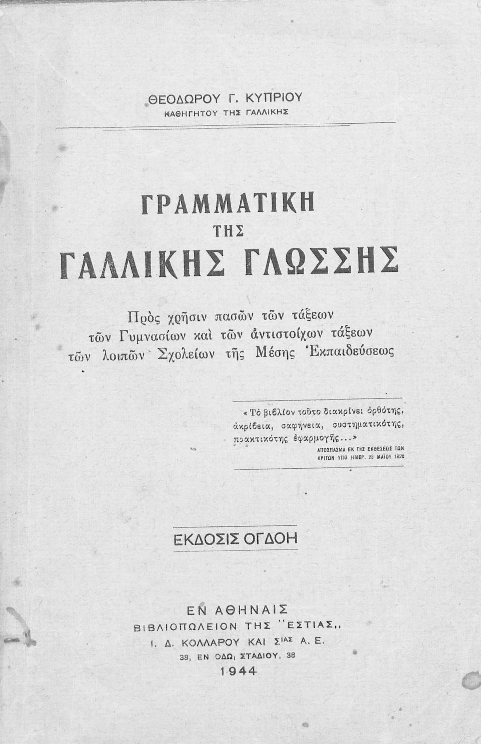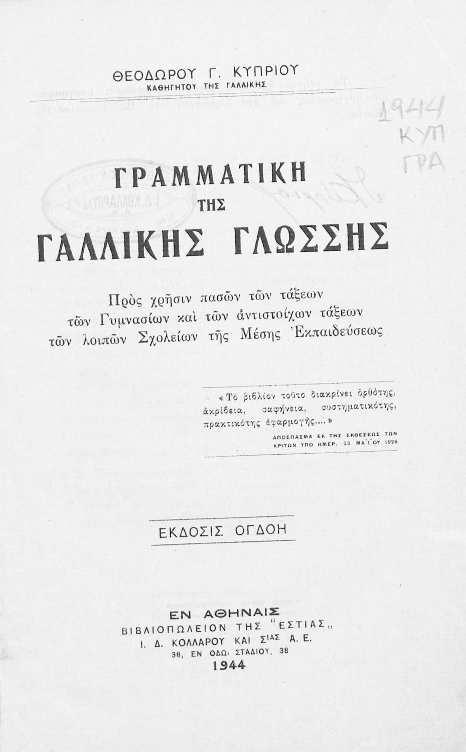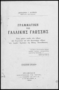 Κωδικός αναγνώρισης: 02-01097 Τίτλος: Γραμματική της γαλλικής γλώσσης προς χρήσιν πασών των τάξεων των Γυμνασίων και των αντιστοίχων τάξεων των λοιπών Σχολείων της Μέσης Εκπαιδεύσεως Συγγραφέας: Θεόδωρος Γ. Κύπριος Μέγεθος και υπόστρωμα: Σχολικό εγχειρίδιο, μαλακό εξώφυλλο, 204 σελίδες. |