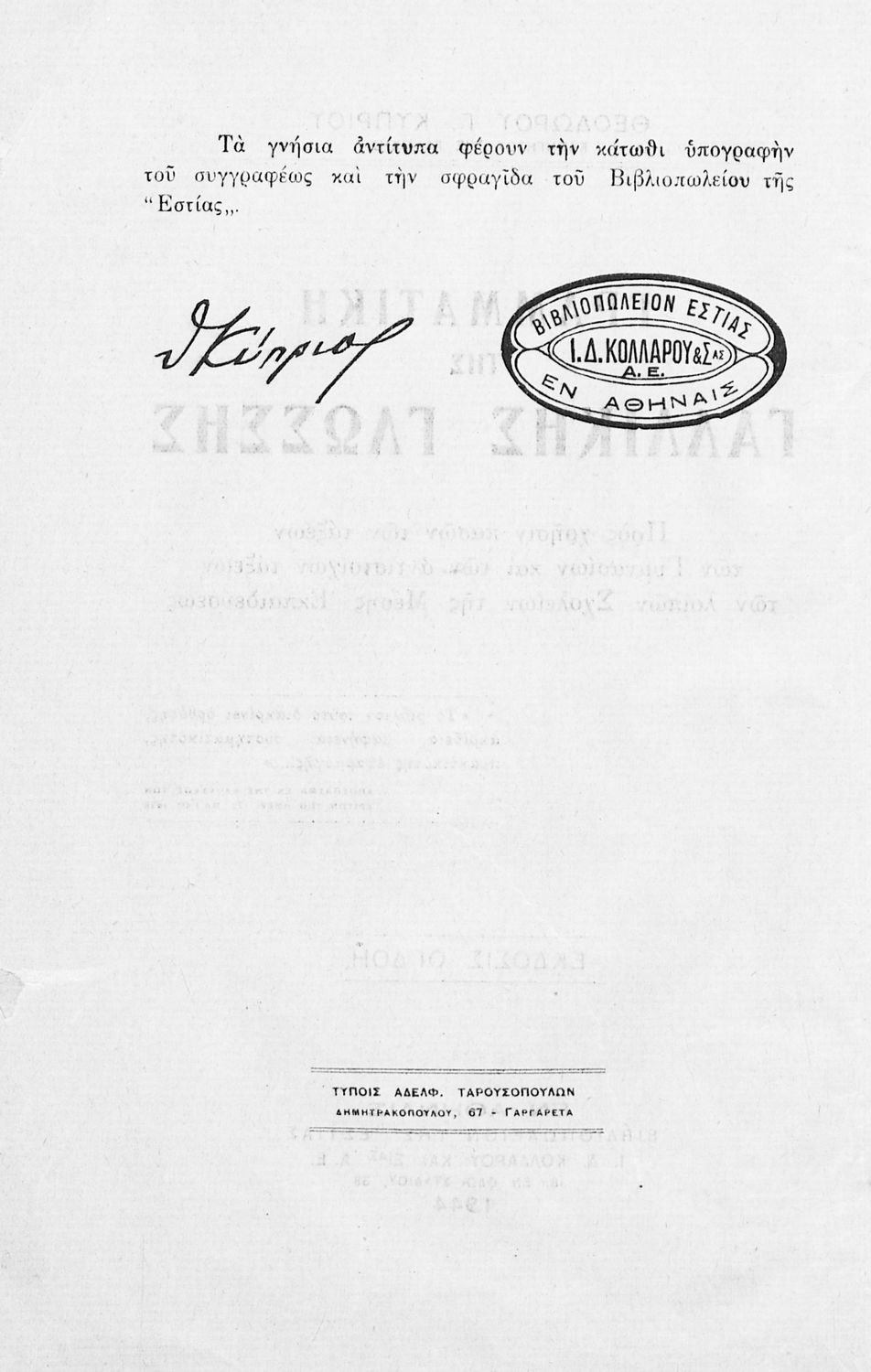 Εκδότης: Ιωάννης Δ. Κολλάρος και ΣΙΑ, Βιβλιοπωλείο της "Εστίας" Έτος έκδοσης: 1944 Τόπος έκδοσης: Αθήνα Έκδοση: 8η |