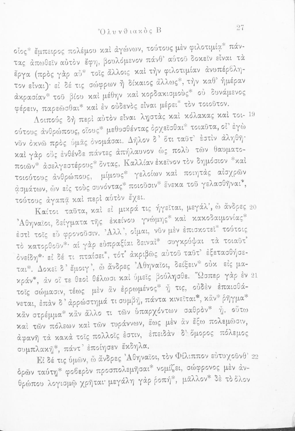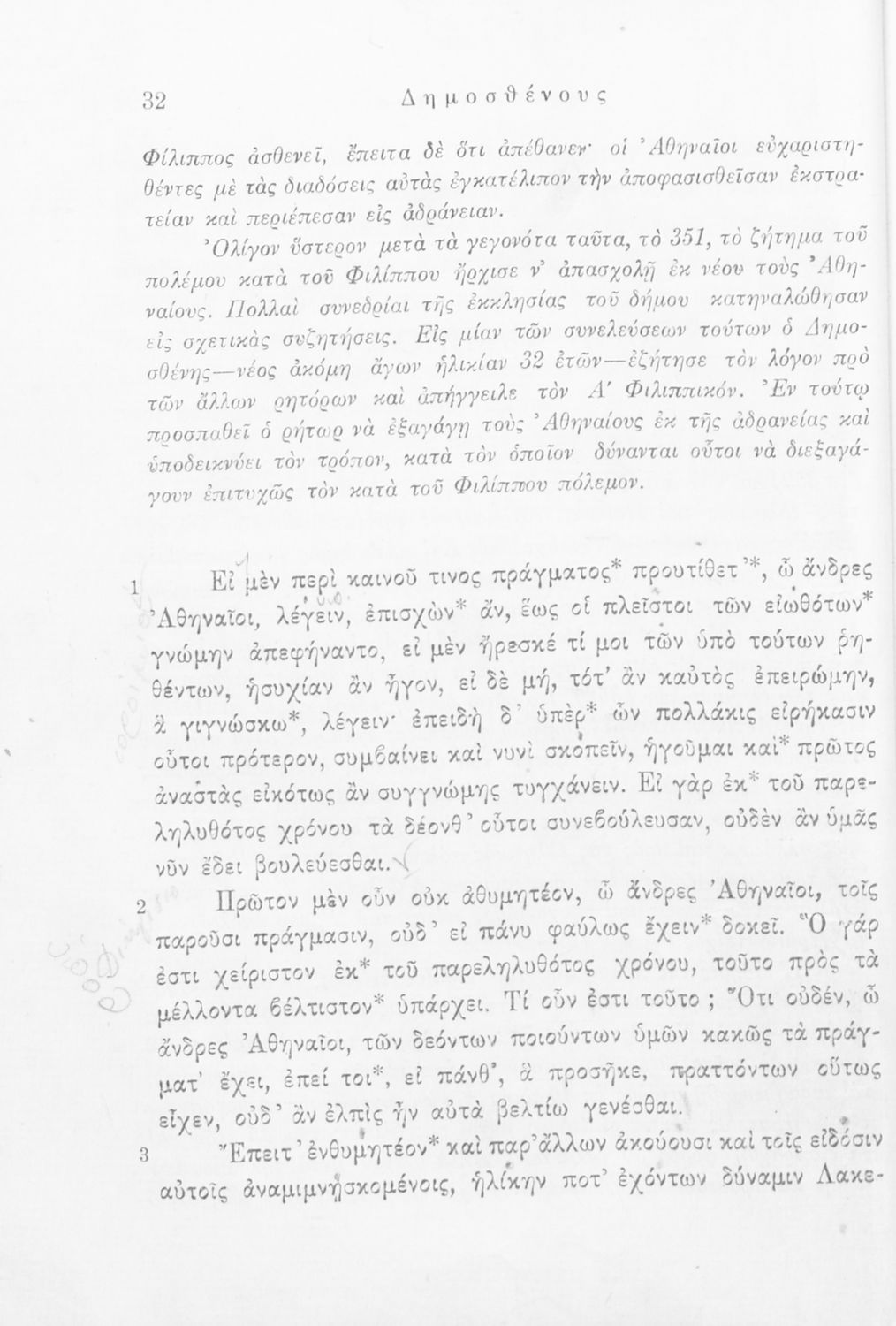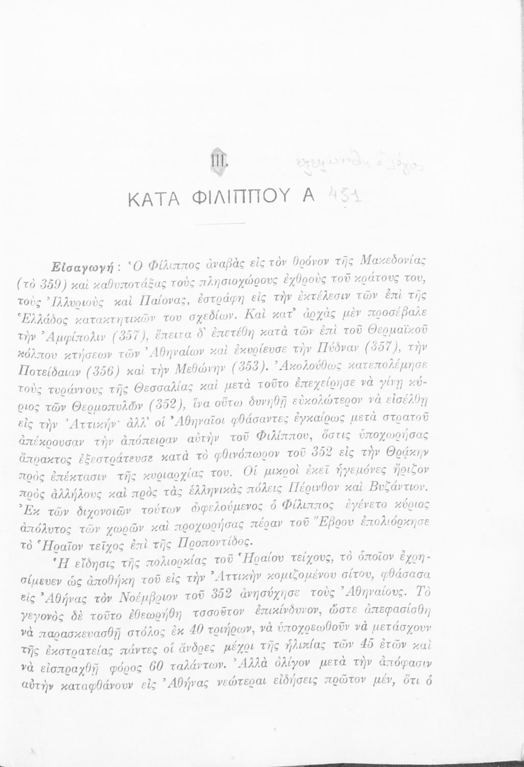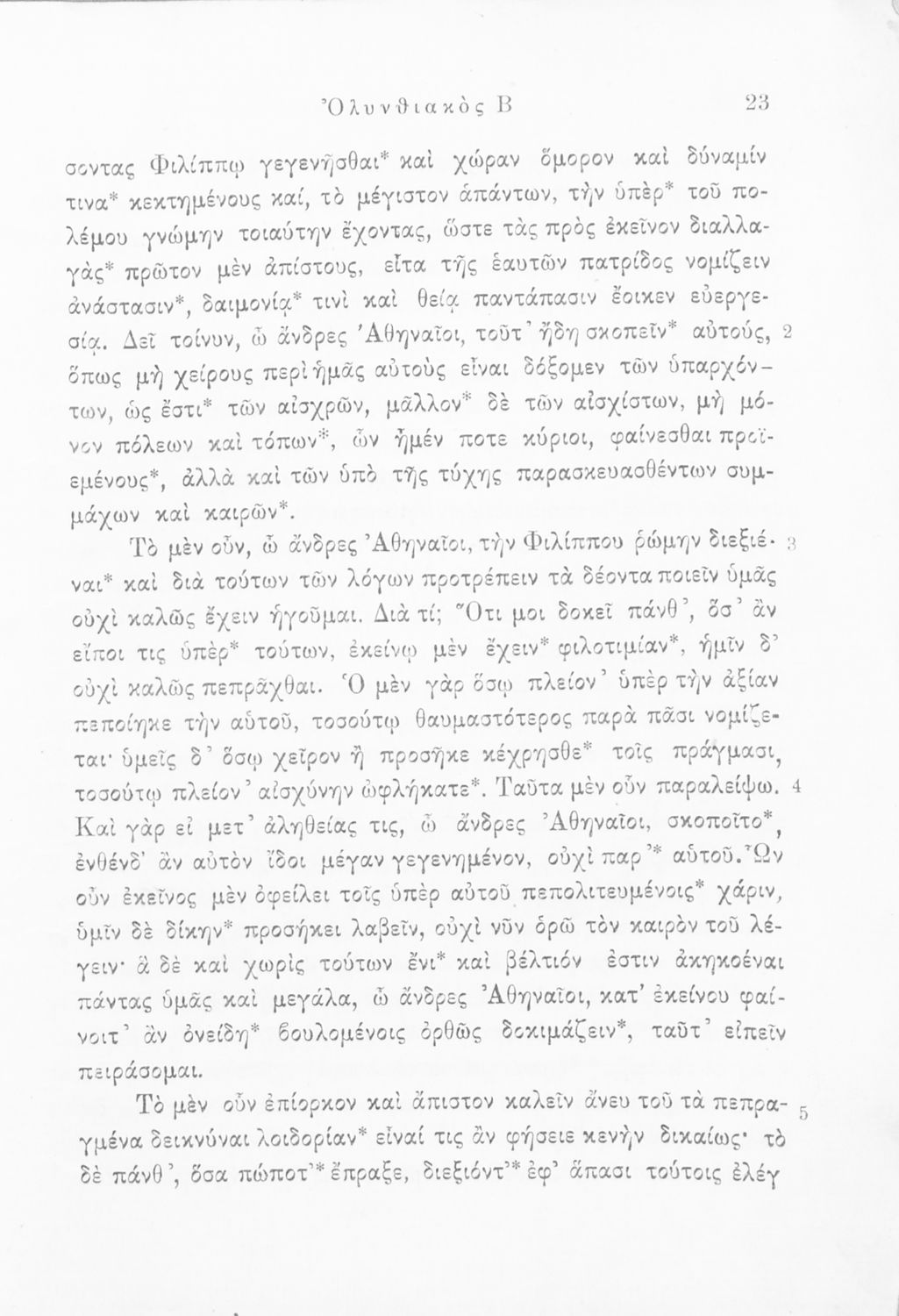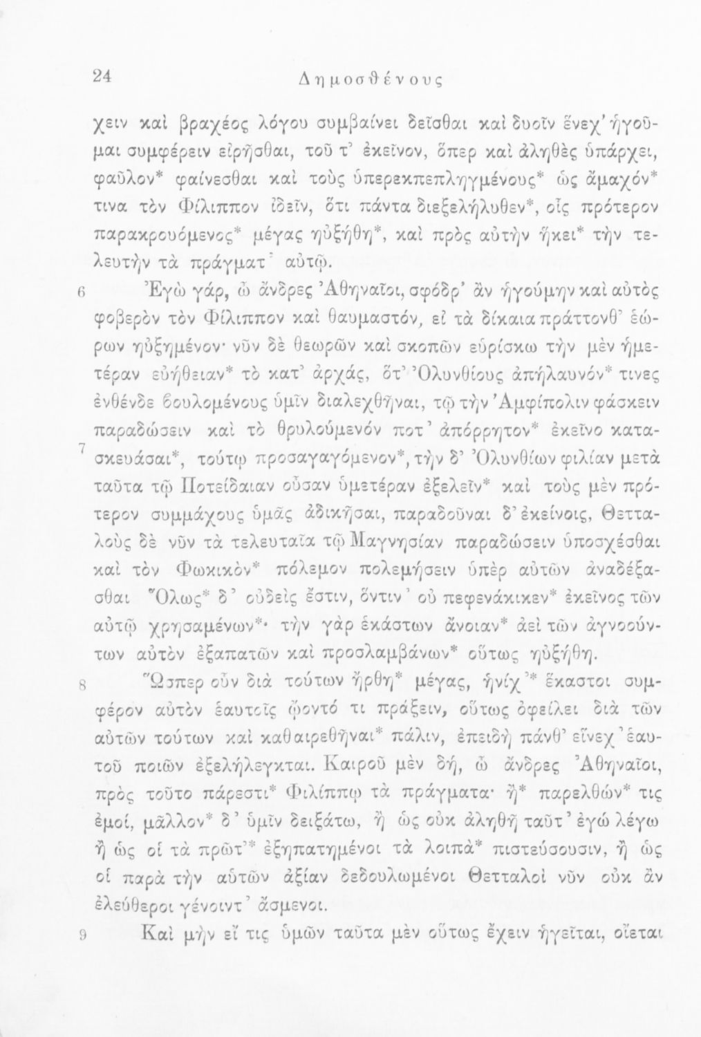 Σχολικό εγχειρίδιο Αρχαίων Ελληνικών Ε΄ Γυμνασίου που περιέχει τους Ολυνθιακούς Α΄ και Β΄ και τους Φιλιππικούς Α΄ και Β΄ του Δημοσθένη, βιογραφικό σημείωμα, λεξιλόγιο και ερμηνευτικά και ετυμολογικά σχόλια.