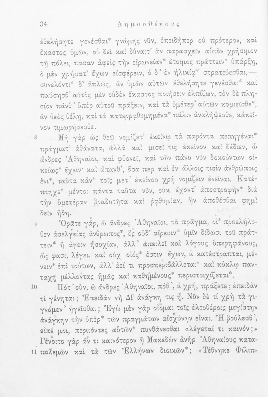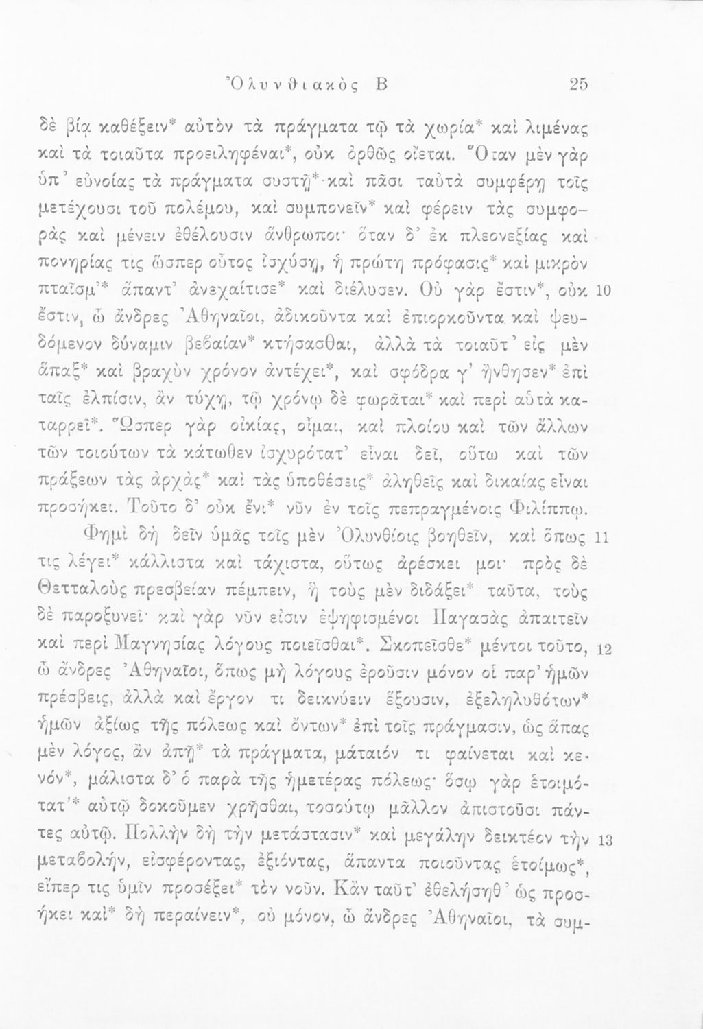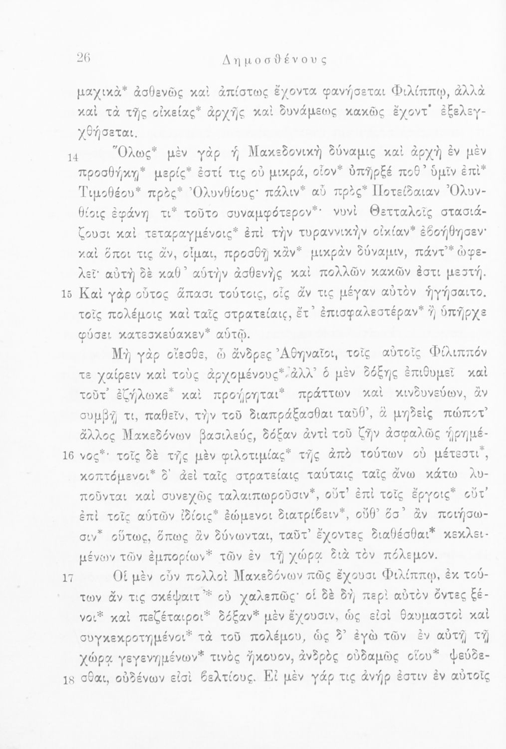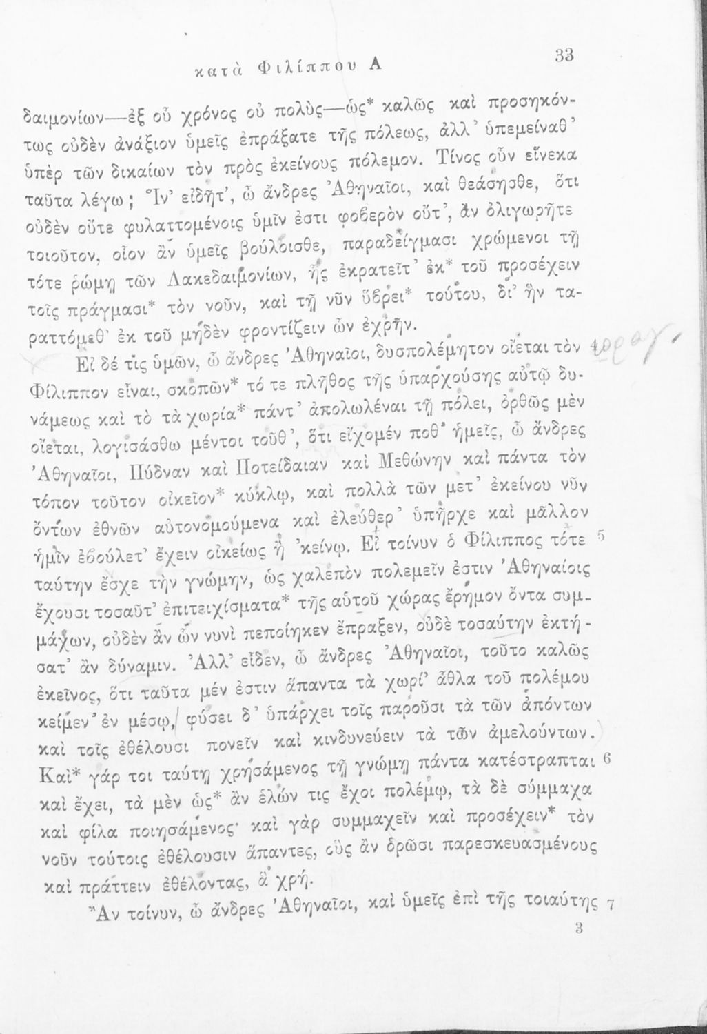 Σχολικό εγχειρίδιο Αρχαίων Ελληνικών Ε΄ Γυμνασίου που περιέχει τους Ολυνθιακούς Α΄ και Β΄ και τους Φιλιππικούς Α΄ και Β΄ του Δημοσθένη, βιογραφικό σημείωμα, λεξιλόγιο και ερμηνευτικά και ετυμολογικά σχόλια.