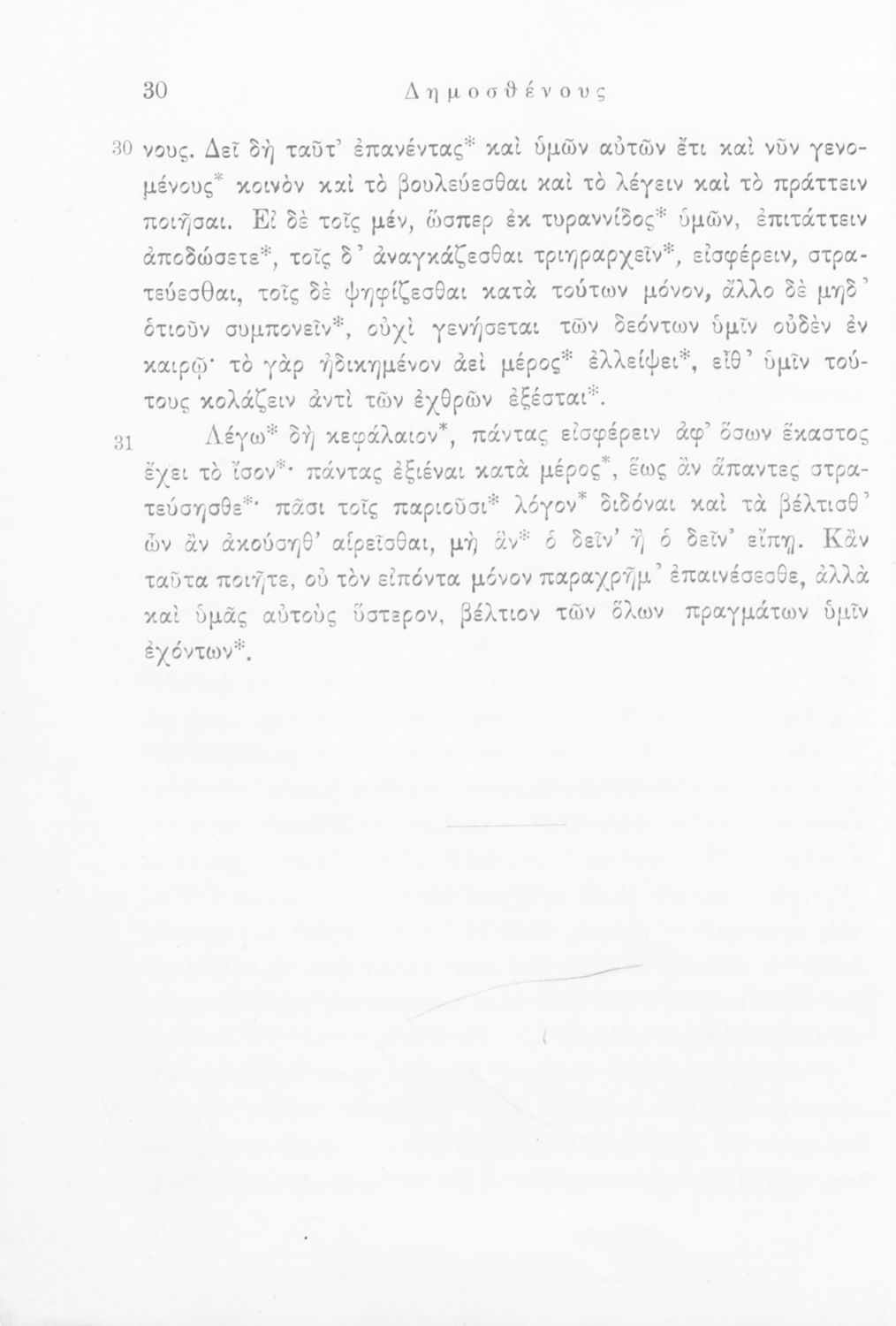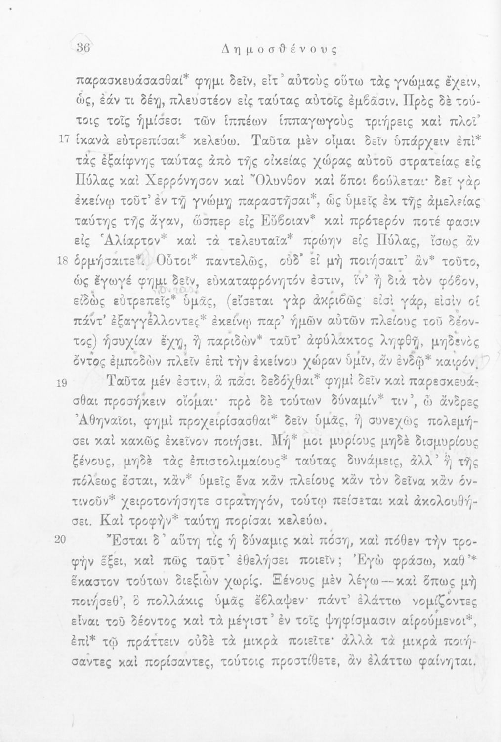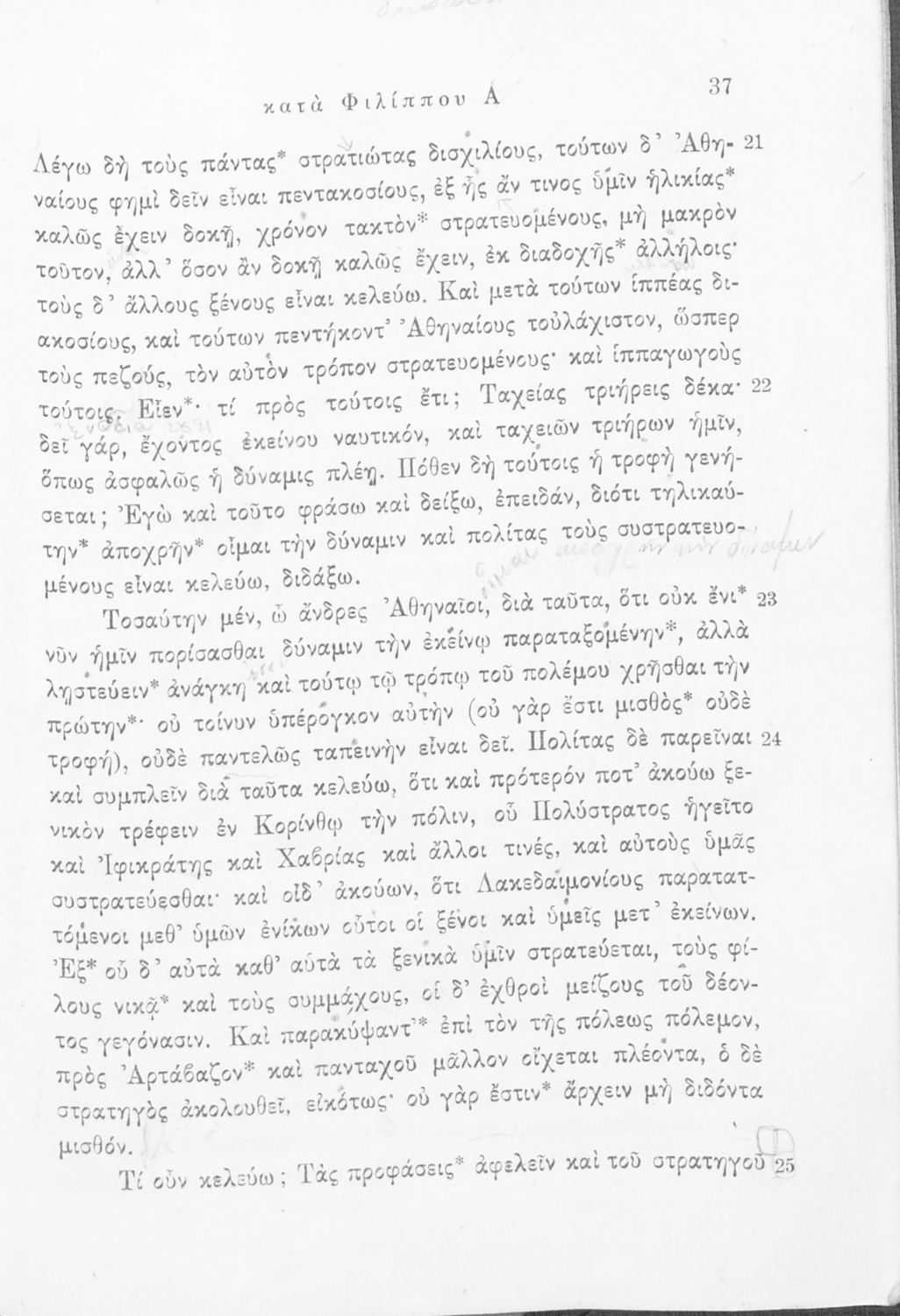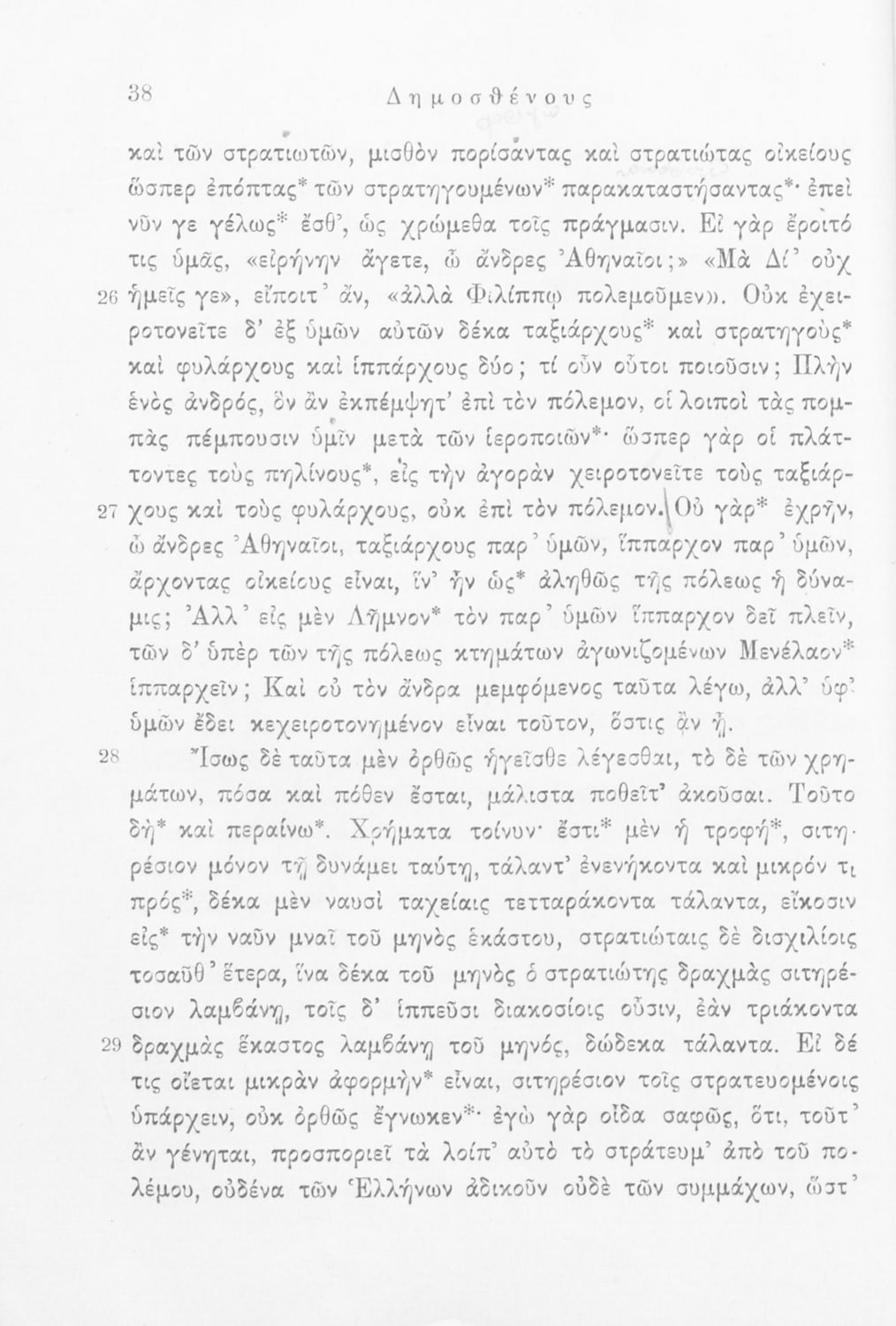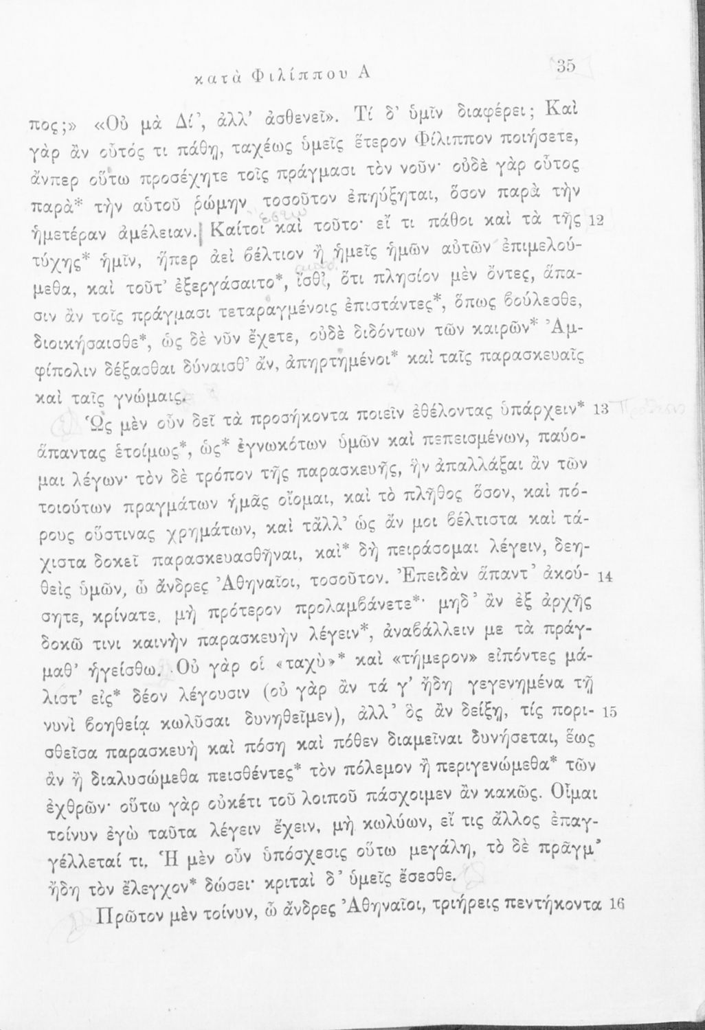 Σχολικό εγχειρίδιο Αρχαίων Ελληνικών Ε΄ Γυμνασίου που περιέχει τους Ολυνθιακούς Α΄ και Β΄ και τους Φιλιππικούς Α΄ και Β΄ του Δημοσθένη, βιογραφικό σημείωμα, λεξιλόγιο και ερμηνευτικά και ετυμολογικά σχόλια.