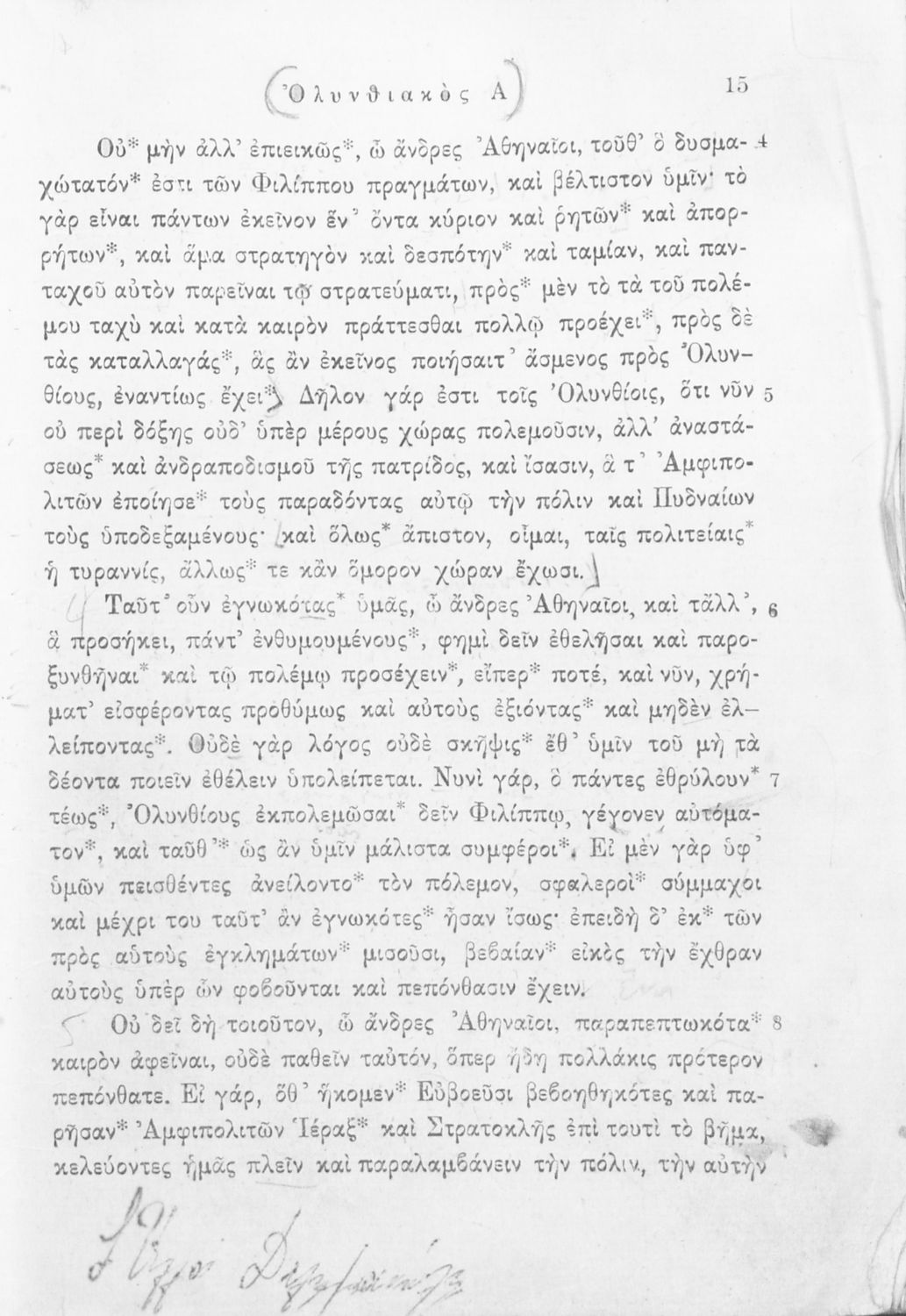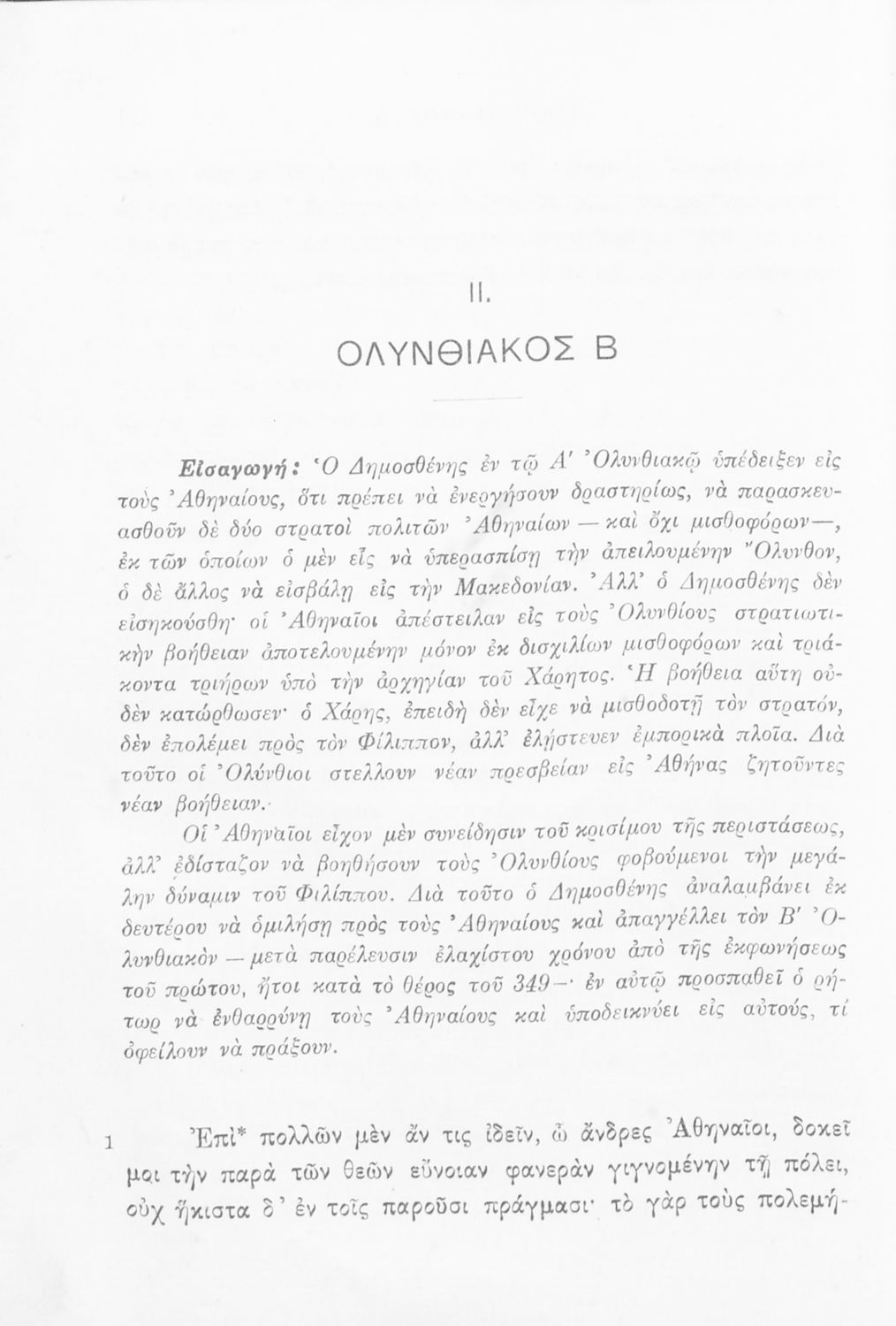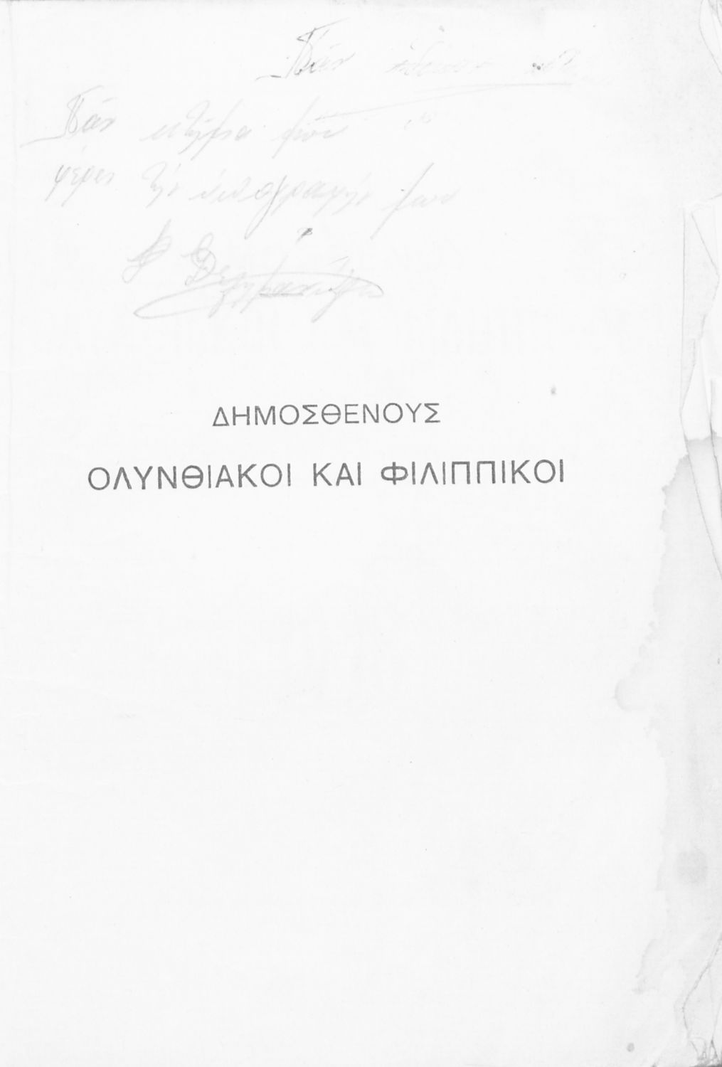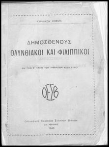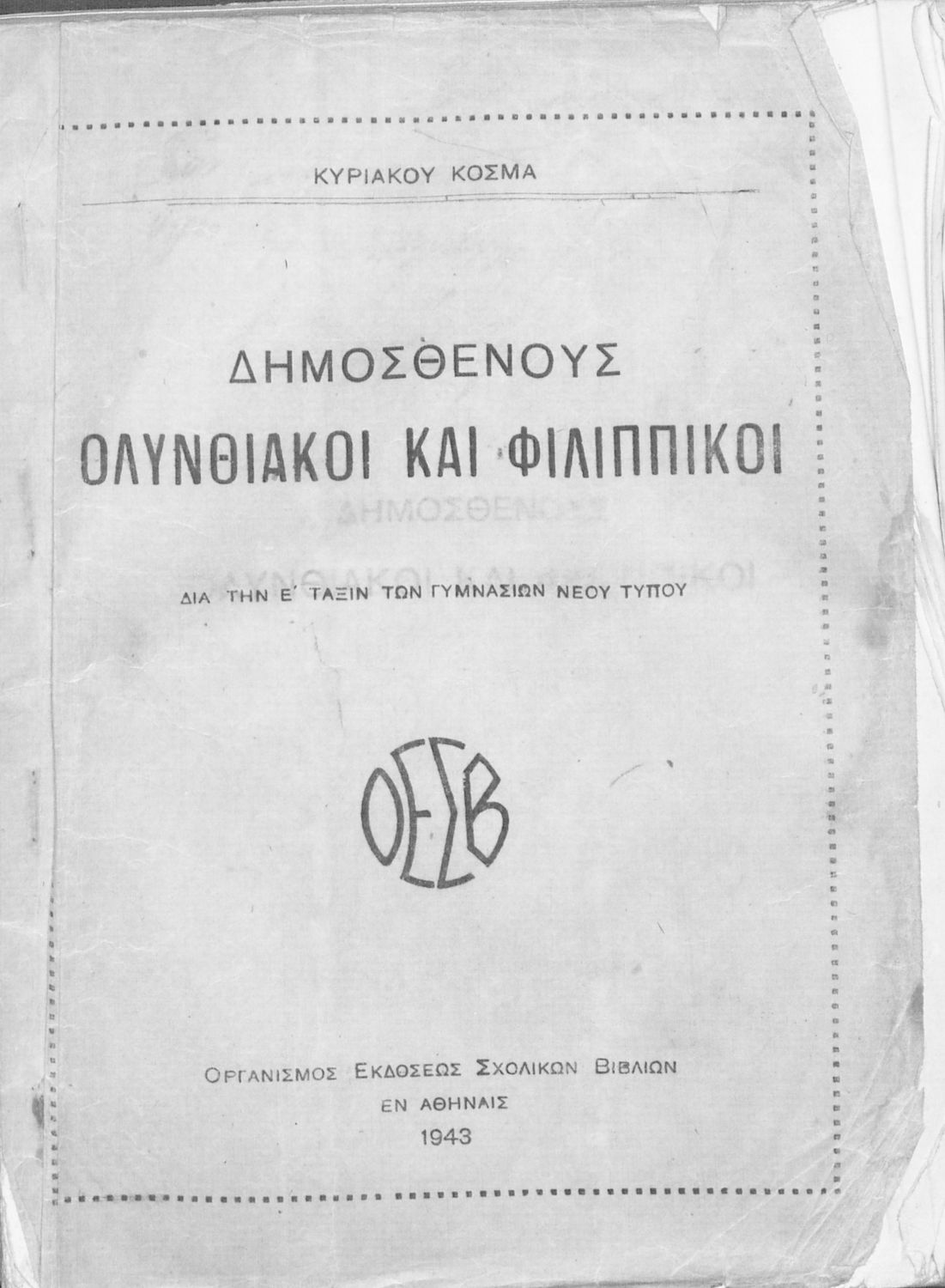 Σχολικό εγχειρίδιο Αρχαίων Ελληνικών Ε΄ Γυμνασίου που περιέχει τους Ολυνθιακούς Α΄ και Β΄ και τους Φιλιππικούς Α΄ και Β΄ του Δημοσθένη, βιογραφικό σημείωμα, λεξιλόγιο και ερμηνευτικά και ετυμολογικά σχόλια.