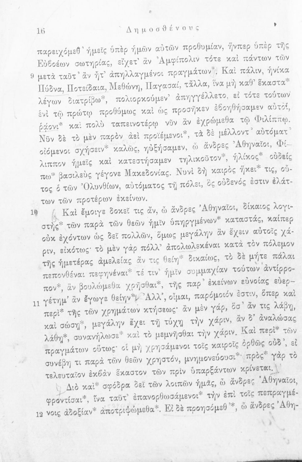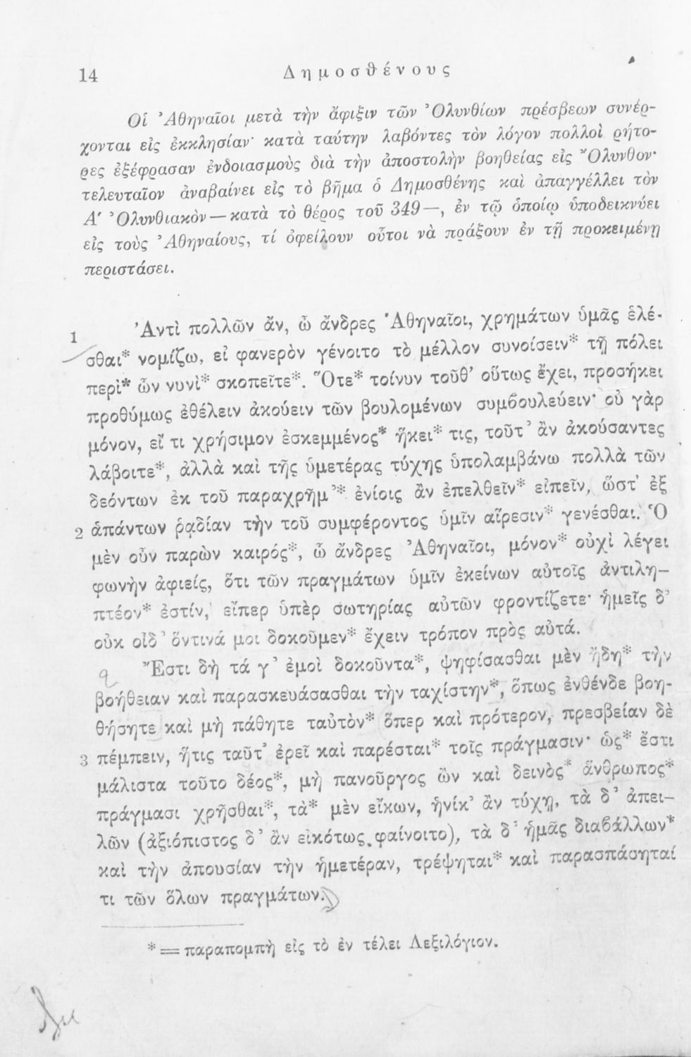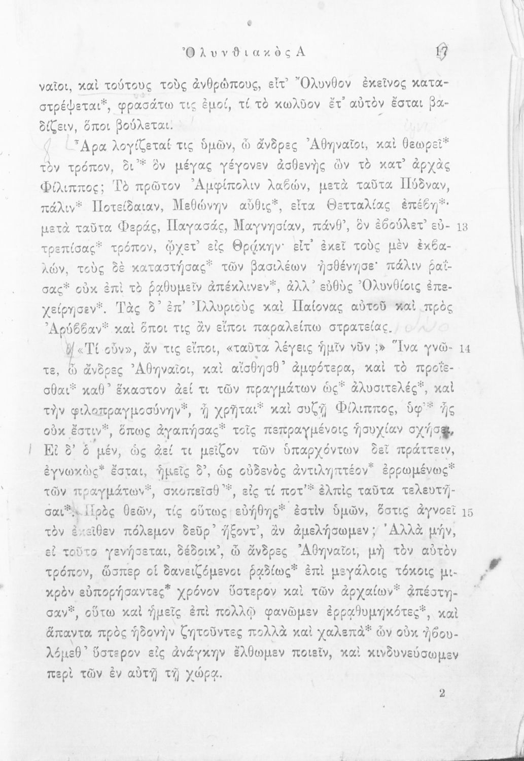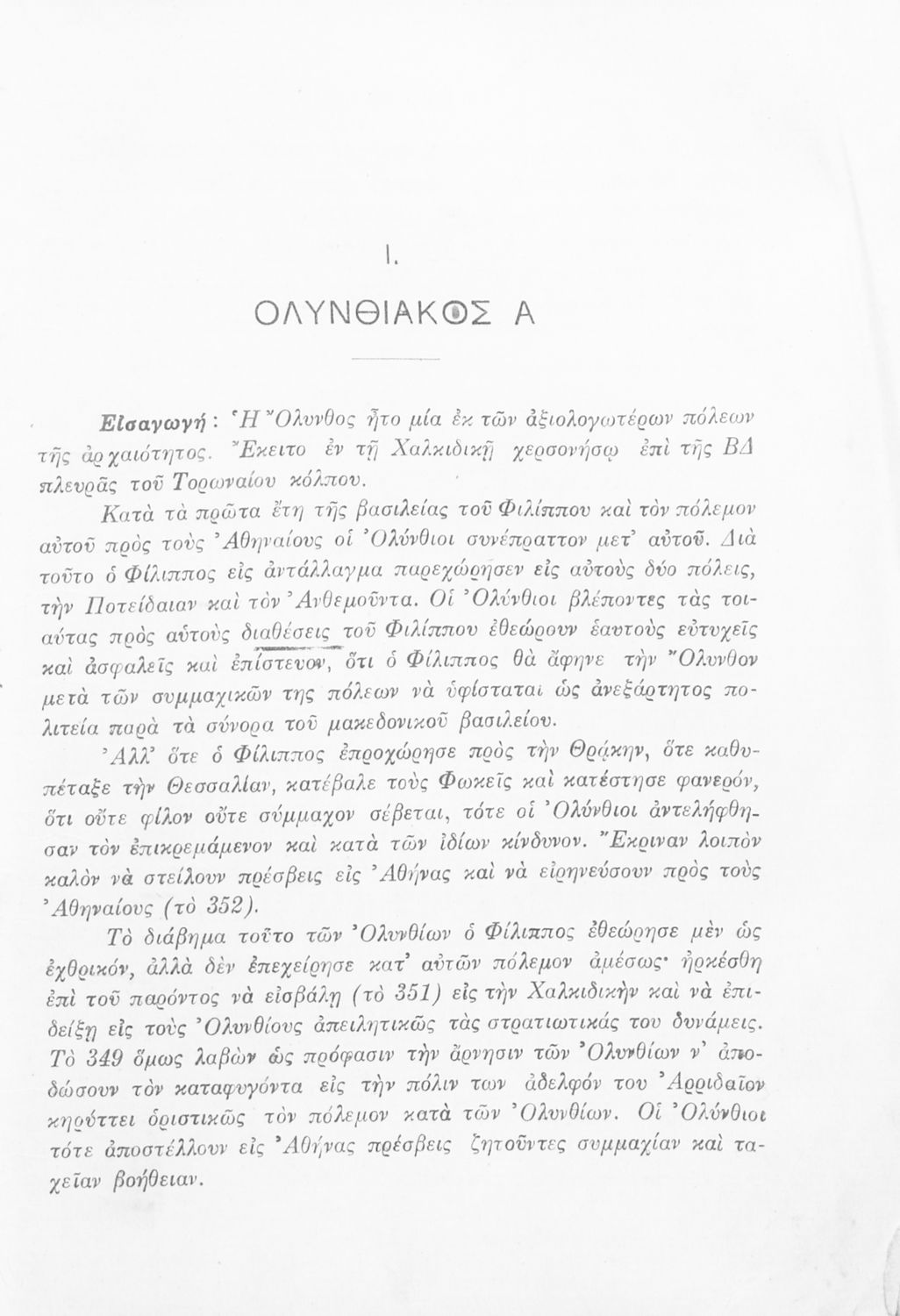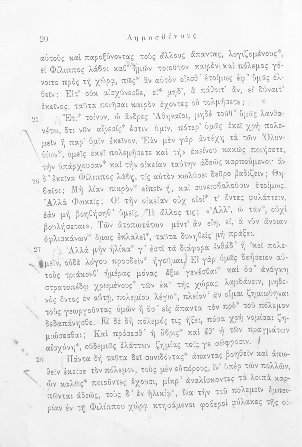 Σχολικό εγχειρίδιο Αρχαίων Ελληνικών Ε΄ Γυμνασίου που περιέχει τους Ολυνθιακούς Α΄ και Β΄ και τους Φιλιππικούς Α΄ και Β΄ του Δημοσθένη, βιογραφικό σημείωμα, λεξιλόγιο και ερμηνευτικά και ετυμολογικά σχόλια.