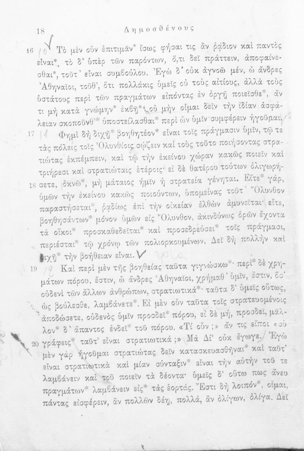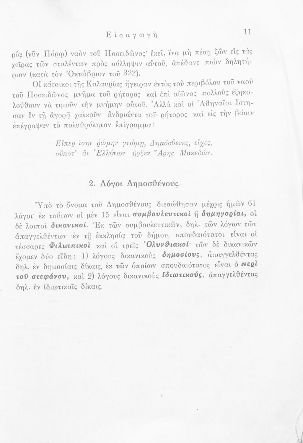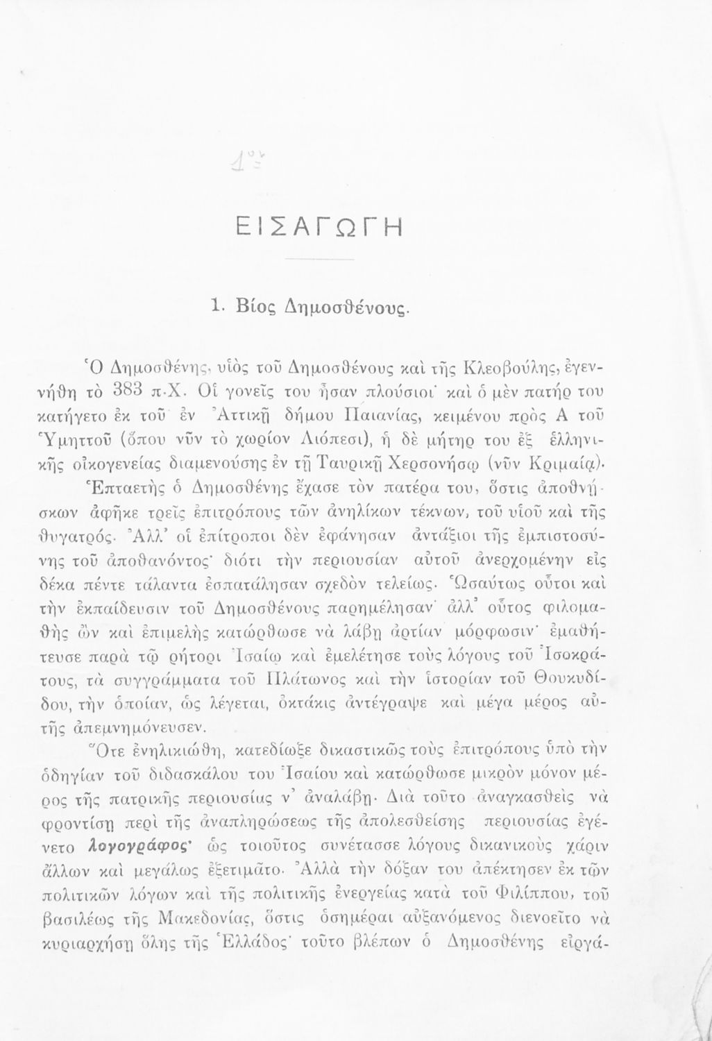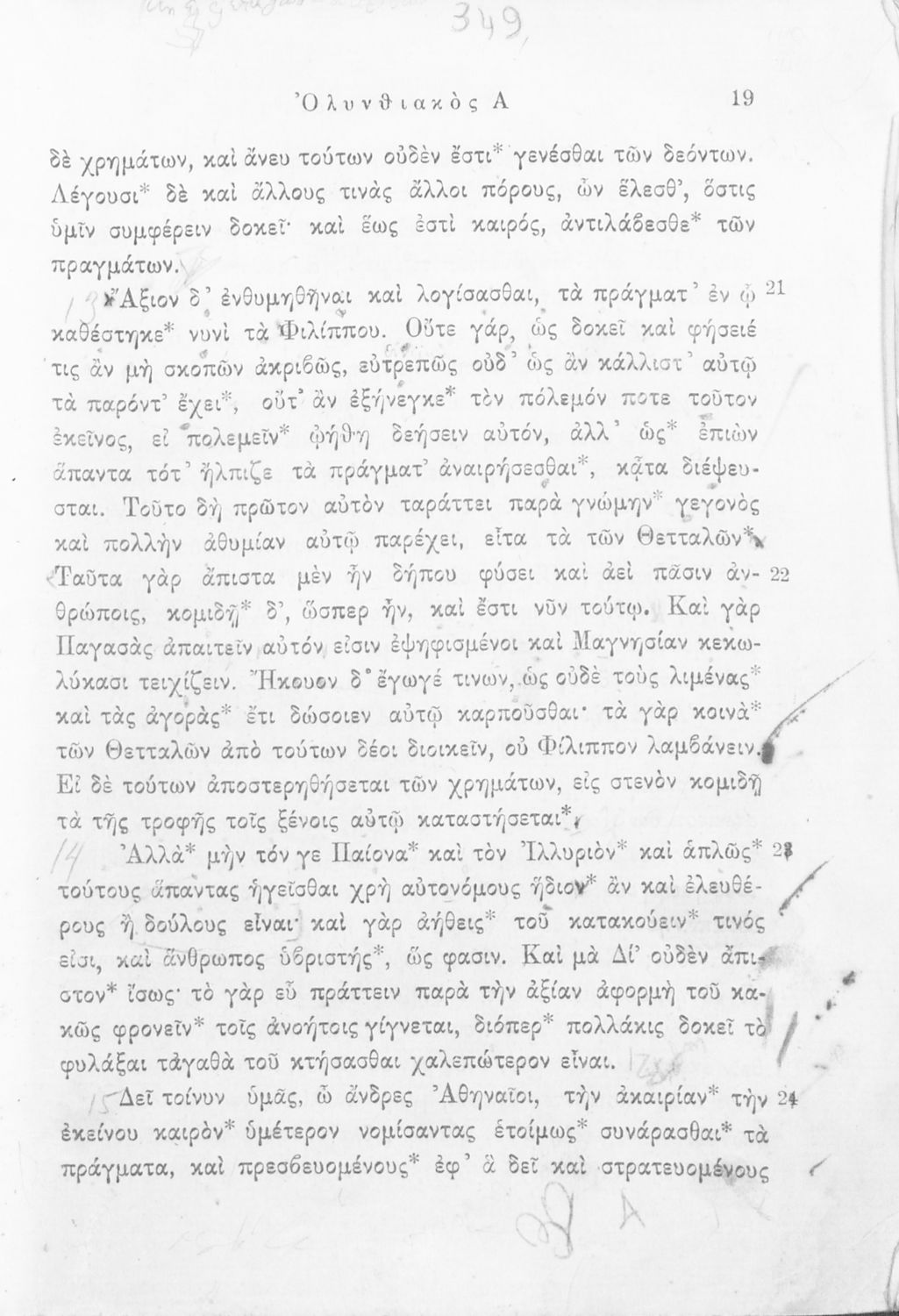 Σχολικό εγχειρίδιο Αρχαίων Ελληνικών Ε΄ Γυμνασίου που περιέχει τους Ολυνθιακούς Α΄ και Β΄ και τους Φιλιππικούς Α΄ και Β΄ του Δημοσθένη, βιογραφικό σημείωμα, λεξιλόγιο και ερμηνευτικά και ετυμολογικά σχόλια.