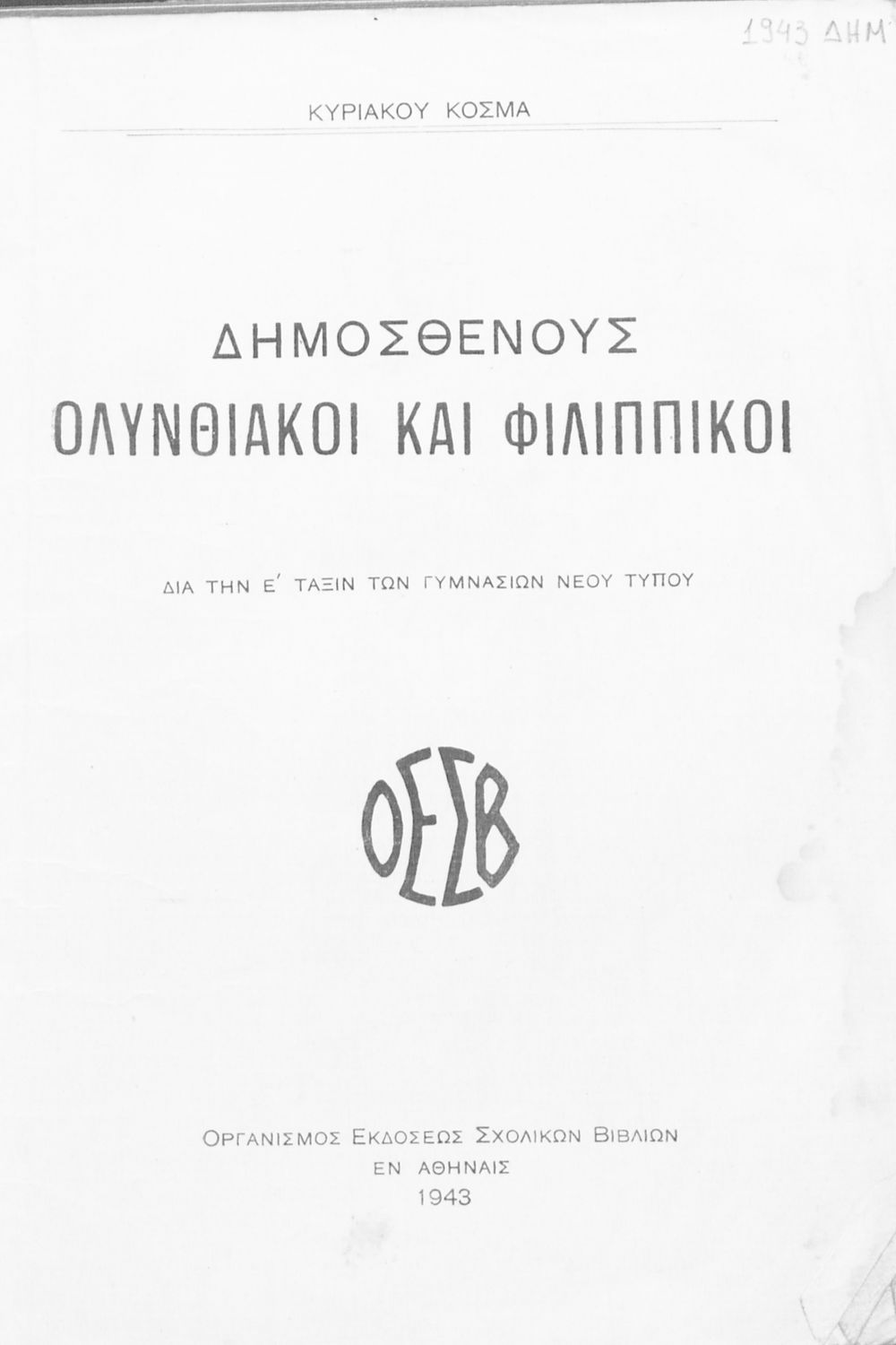 Εκδότης: Οργανισμός Εκδόσεως Σχολικών Βιβλίων Έτος έκδοσης: 1943 Τόπος έκδοσης: Αθήνα |