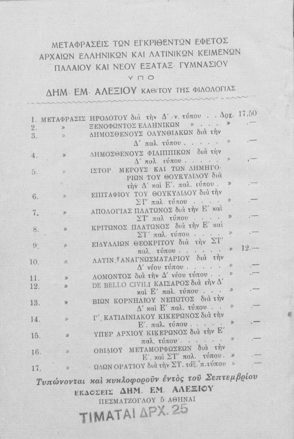 Κωδικός αναγνώρισης: 02-01125 Τίτλος: Μετάφρασις εκλογών εκ των Ιστοριών του Ηροδότου δια την Δ΄ τάξιν Εξαταξίου Γυμνασίου νέου τύπου Συγγραφέας: Δημ. Εμ. Αλεξίου (μτφρ, σχόλια) Μέγεθος και υπόστρωμα: Μαθητικό βοήθημα, μαλακό εξώφυλλο, 119 σελίδες. |