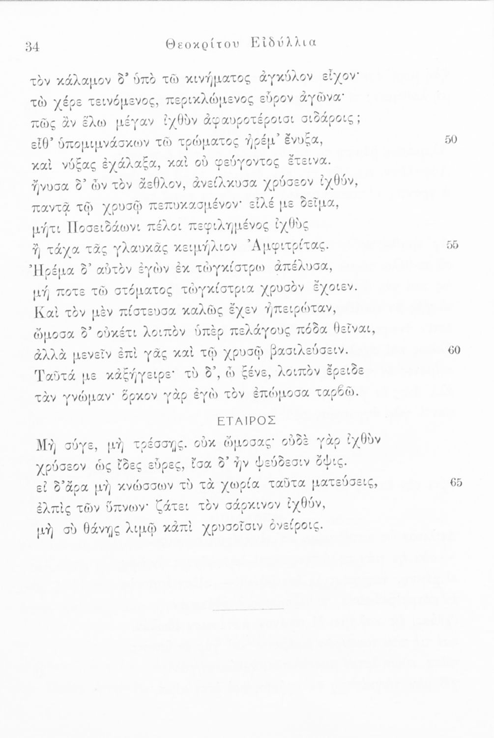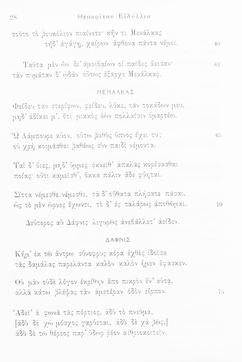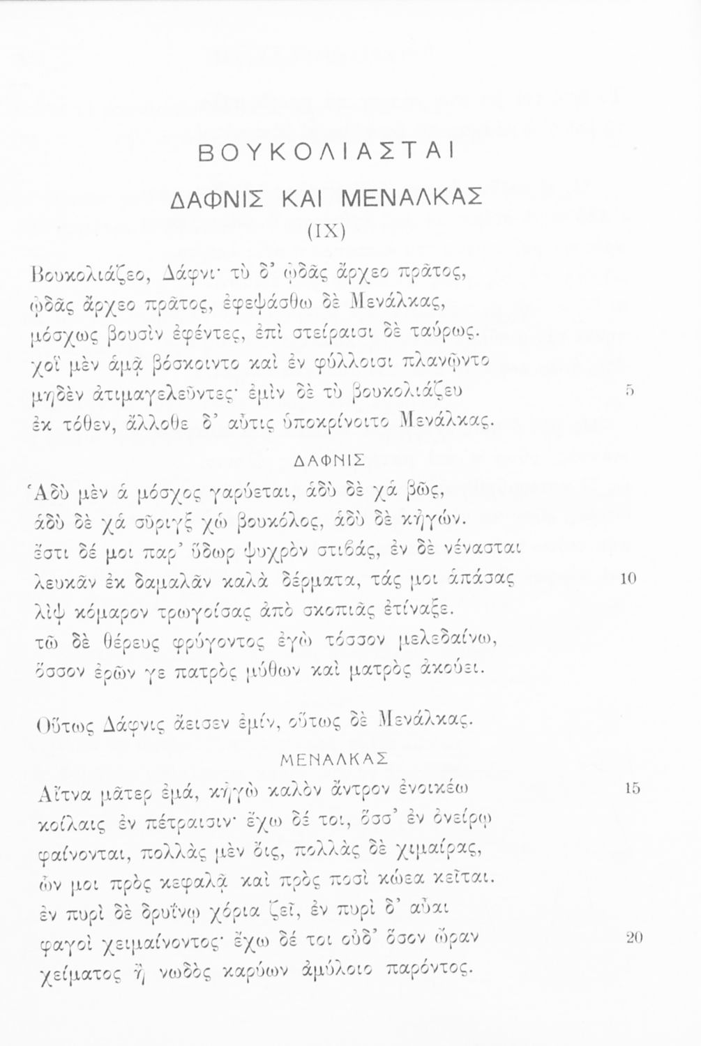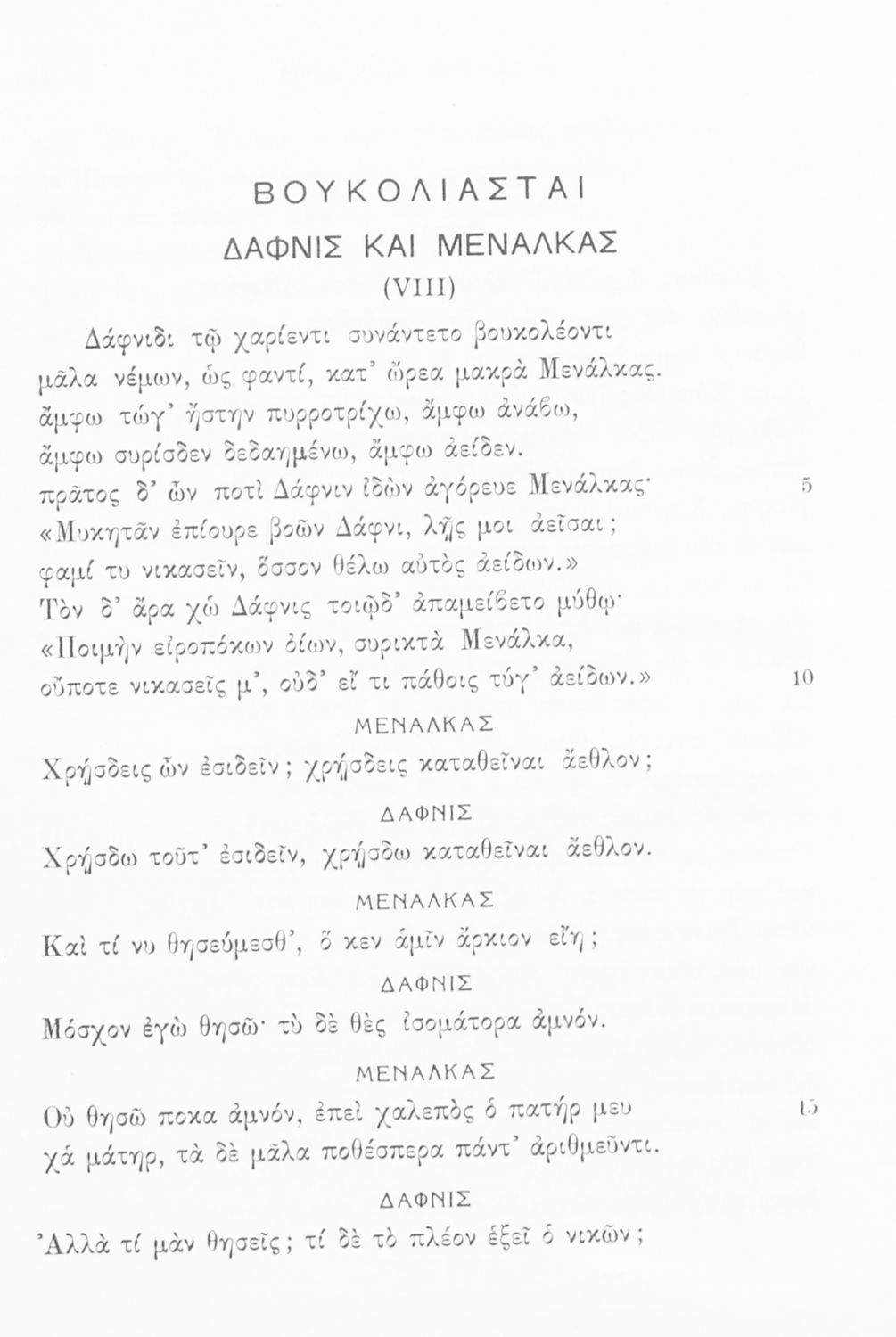 Σχολικό εγχειρίδιο Αρχαίων Ελληνικών ΣΤ΄ Γυμνασίου που περιλαμβάνει εισαγωγή στη ζωή και το έργο του Θεόκριτου, τα Ειδύλλιά του και ερμηνευτικά σχόλια.