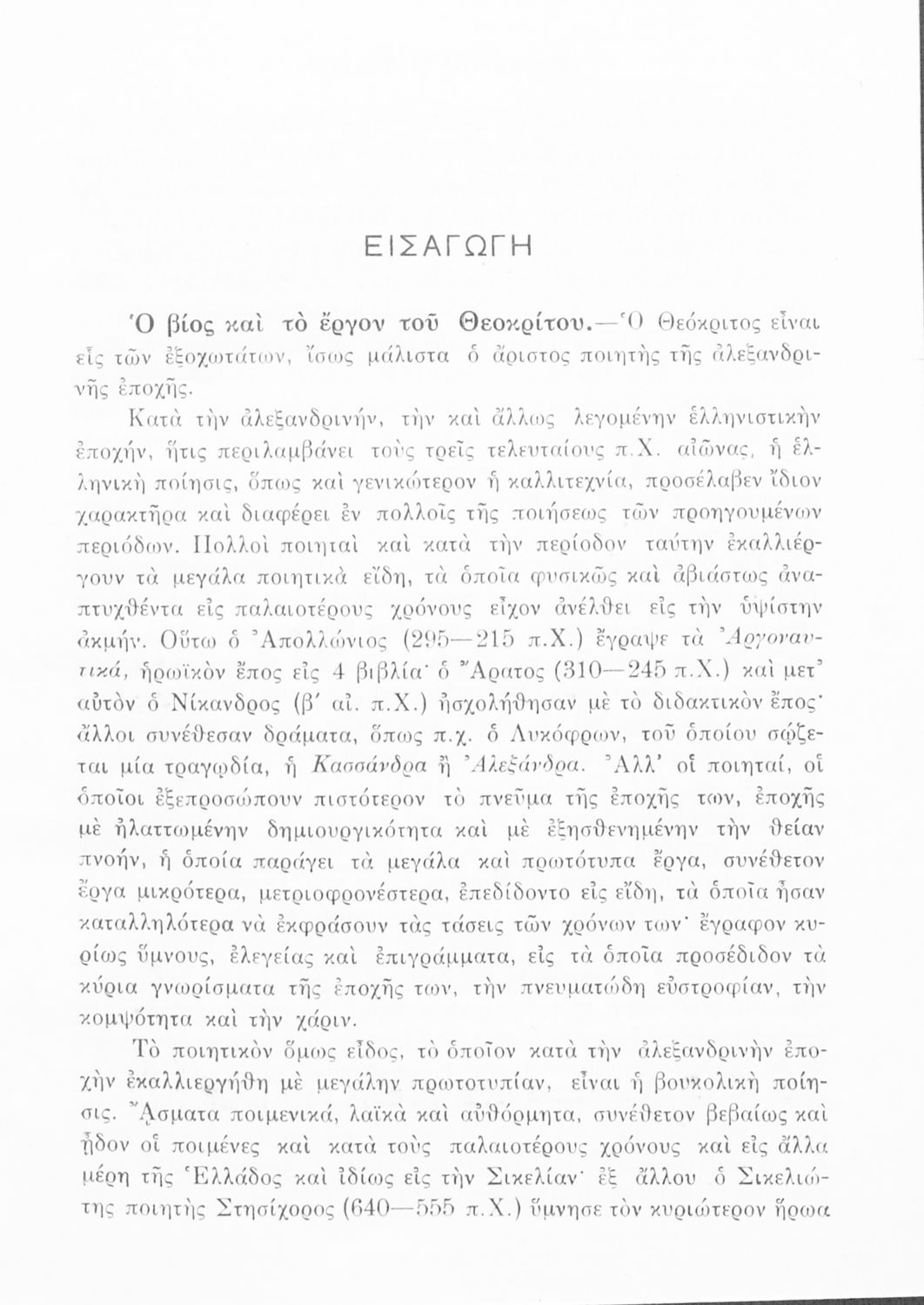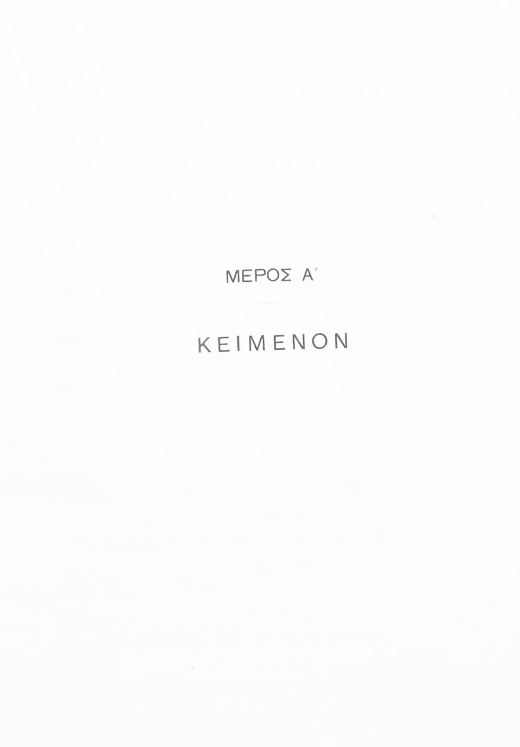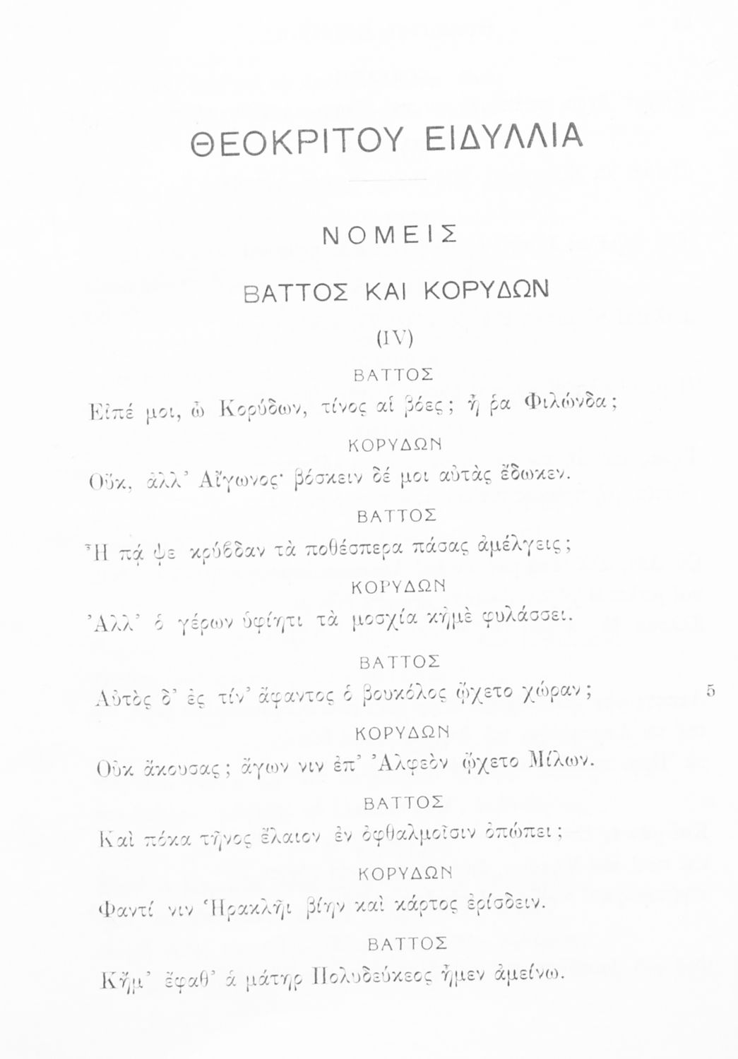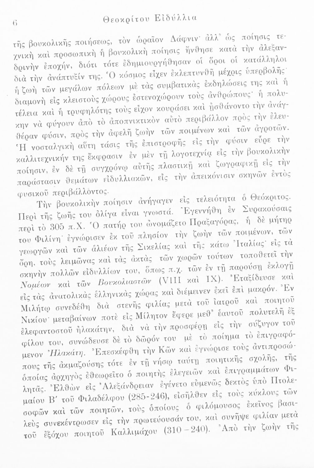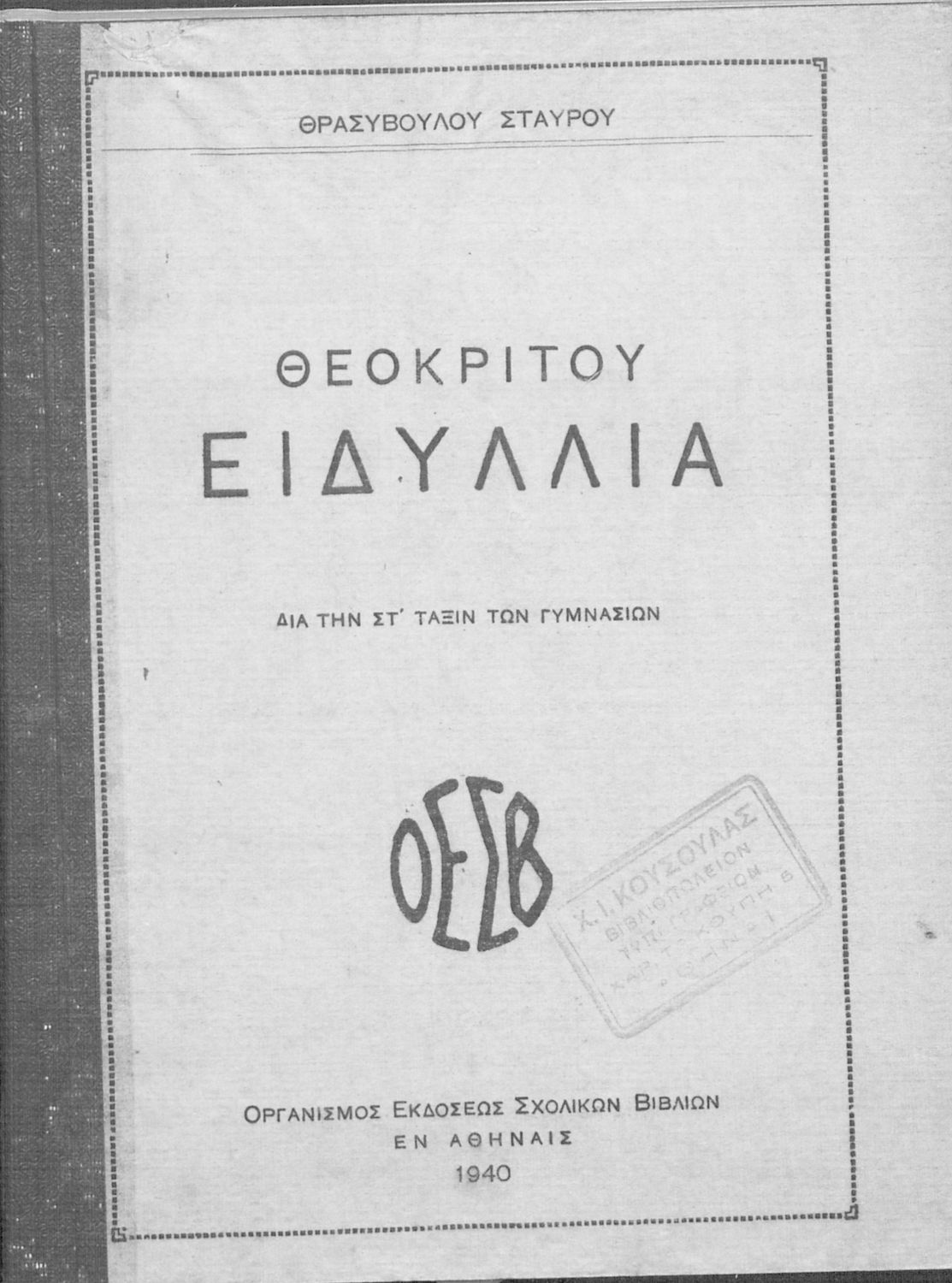 Σχολικό εγχειρίδιο Αρχαίων Ελληνικών ΣΤ΄ Γυμνασίου που περιλαμβάνει εισαγωγή στη ζωή και το έργο του Θεόκριτου, τα Ειδύλλιά του και ερμηνευτικά σχόλια.