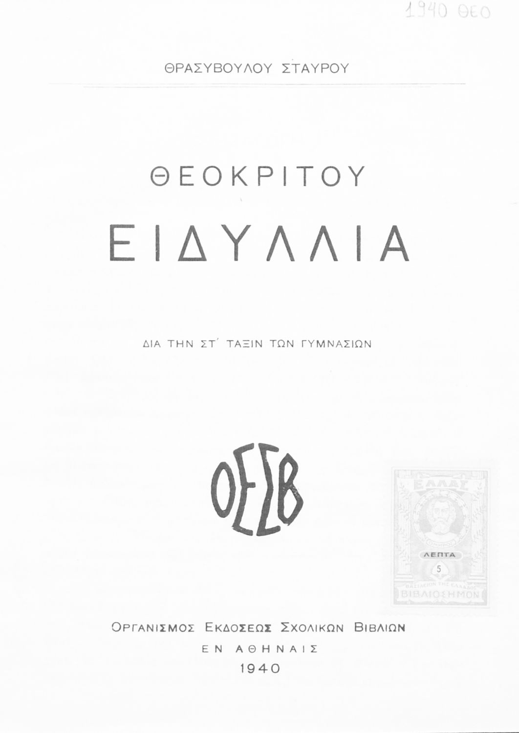 Εντοπισμός πρωτοτύπου: Ελληνικό Λογοτεχνικό και Ιστορικό Αρχείο Κωδικός βιβλιοθήκης: 1940 ΘΕΟ |