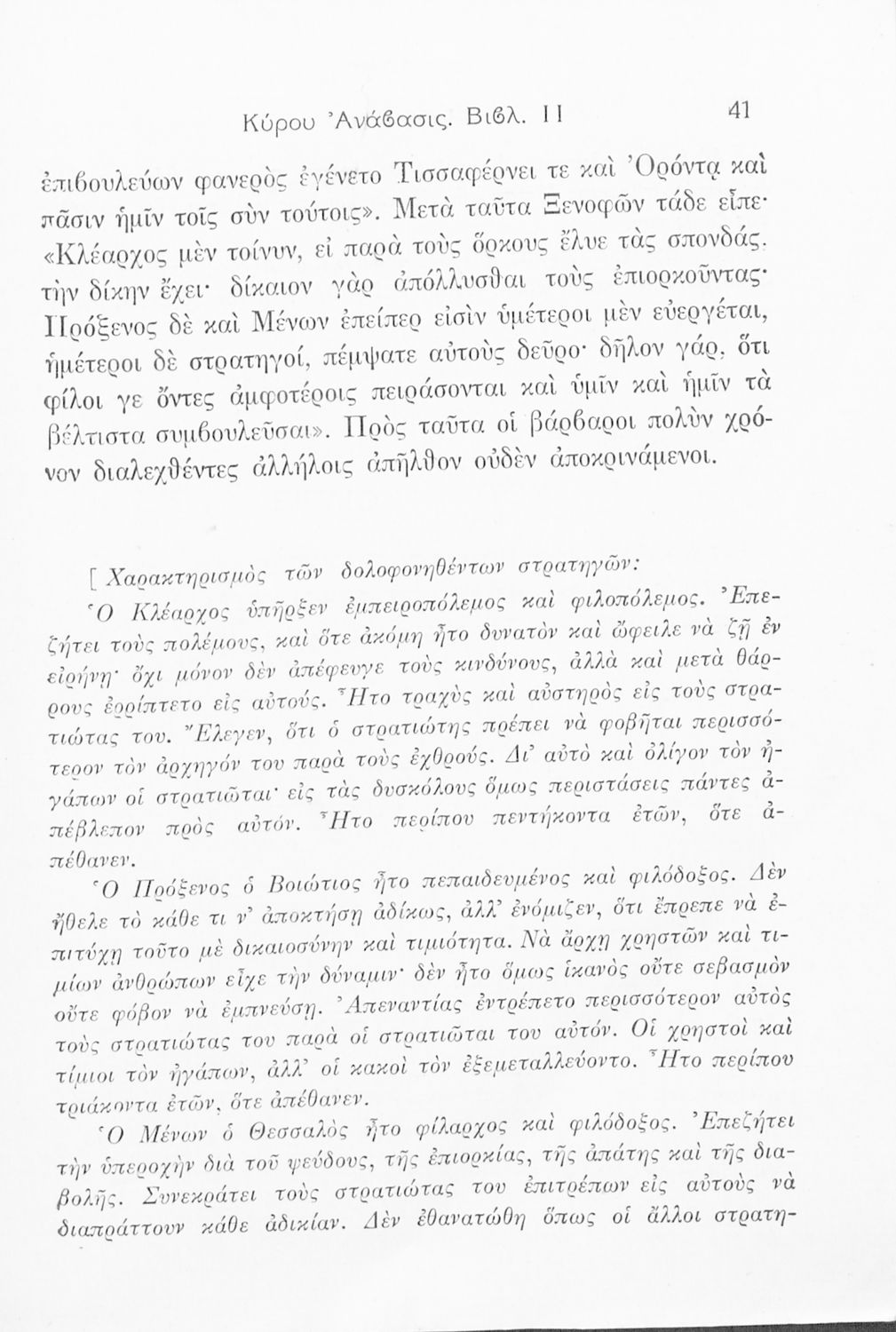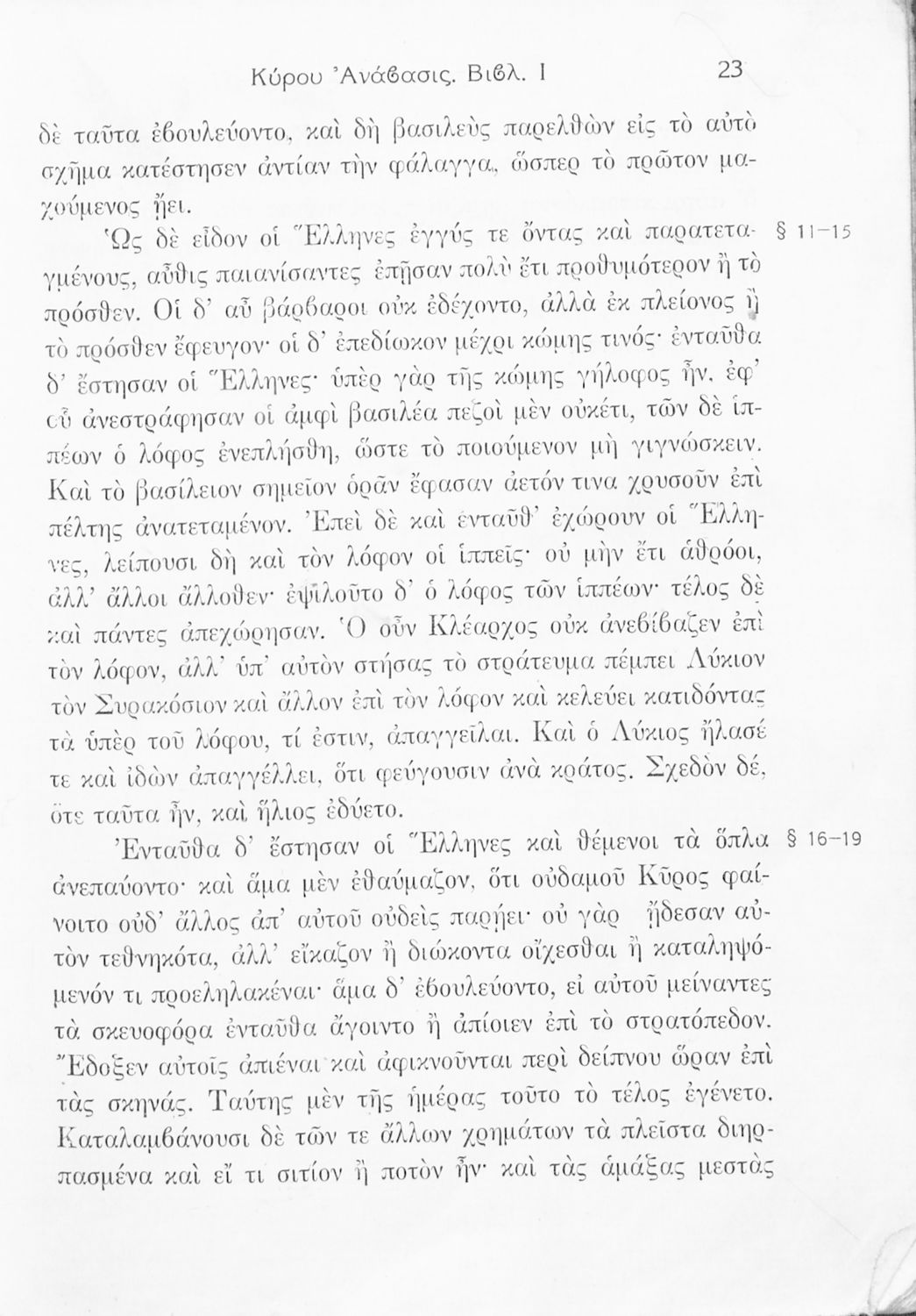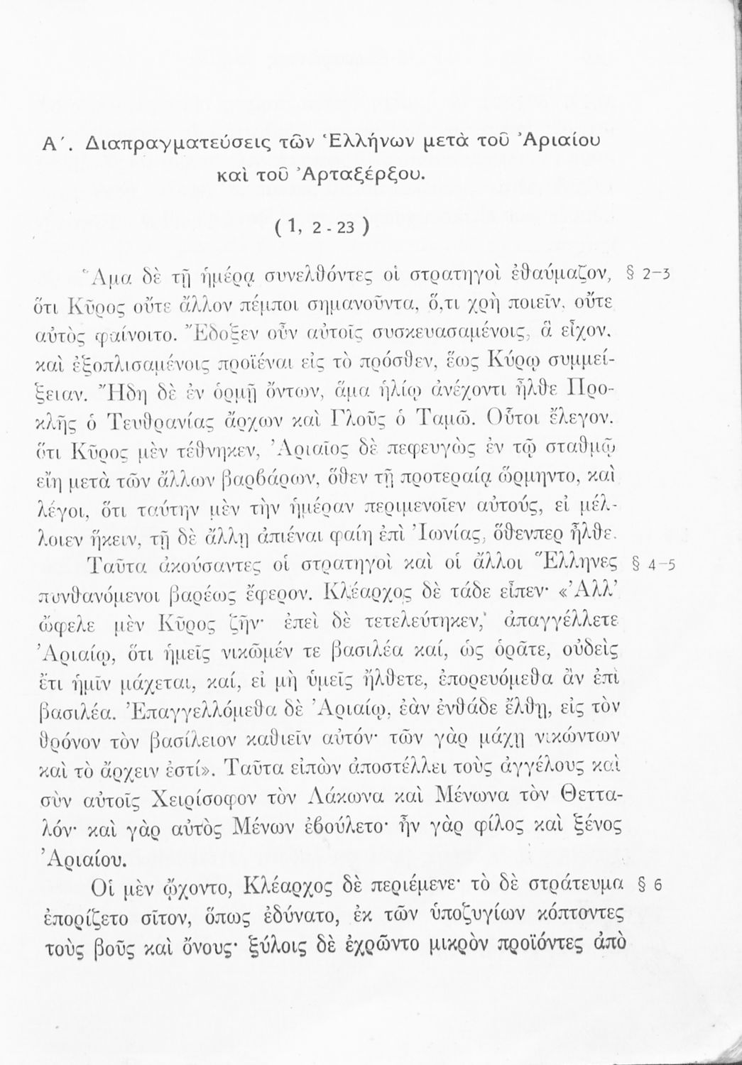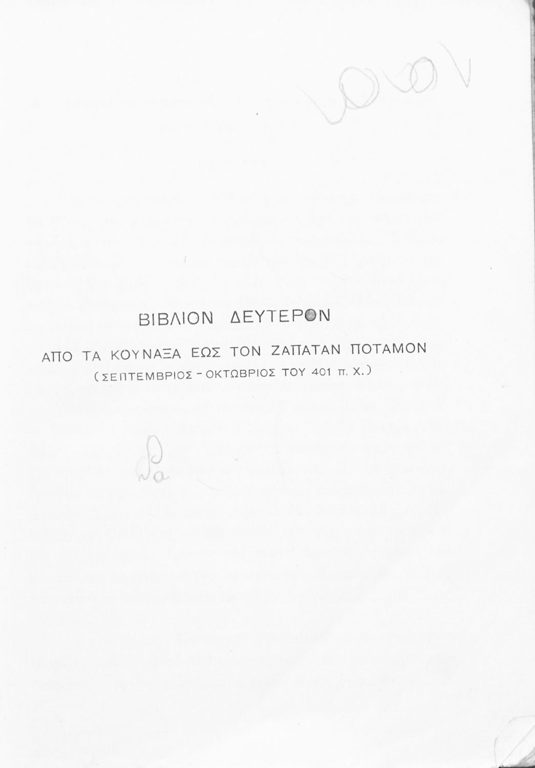 Σχολικό εγχειρίδιο της Γ' Ελληνικού Σχολείου και Αστικών Σχολείων για το μάθημα των Αρχαίων Ελληνικών. Το σύγγραμμα περιλαμβάνει κείμενα κατ΄ επιλογή από τα τέσσερα τελευταία βιβλία του έργου Κύρου Ανάβασις. ...