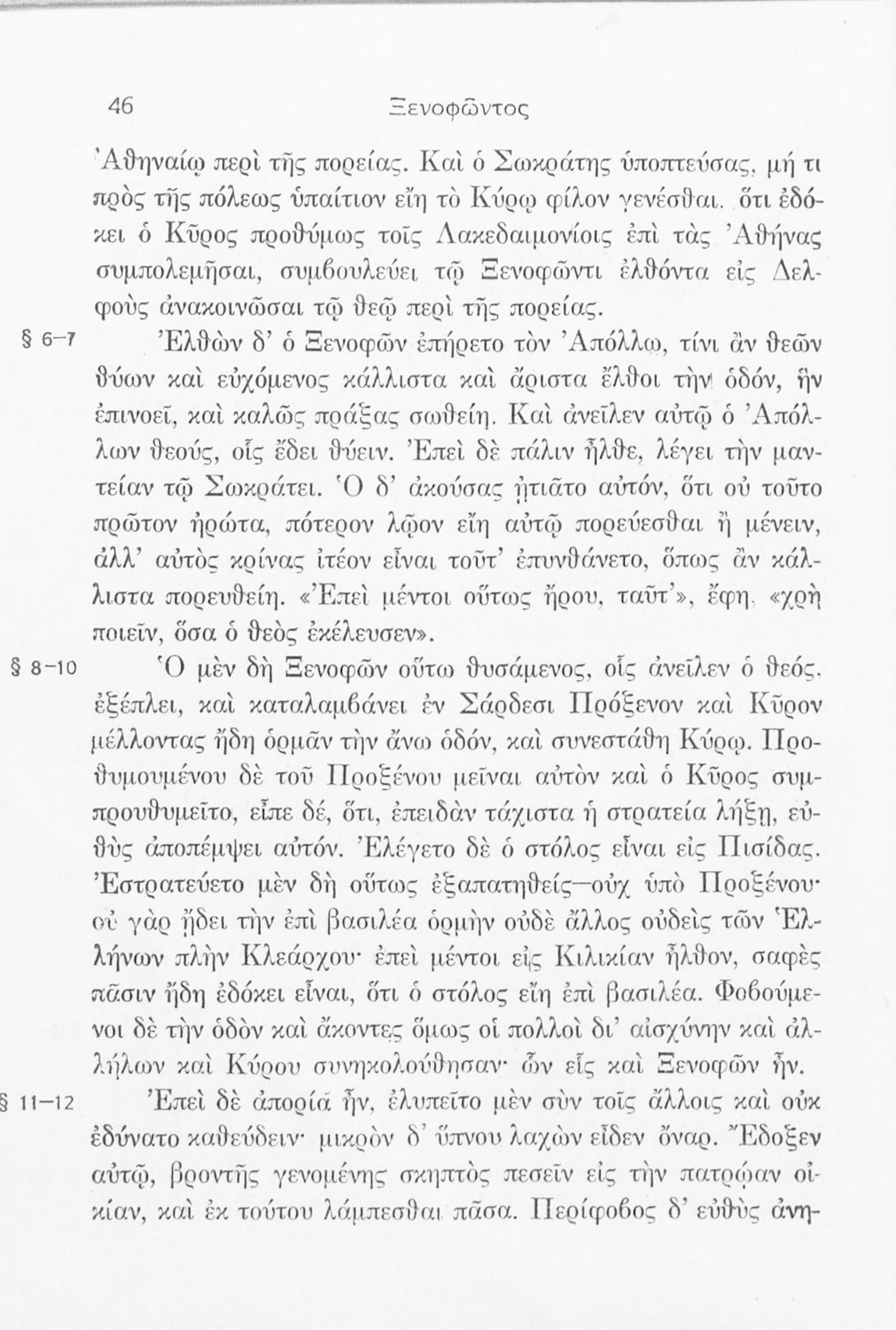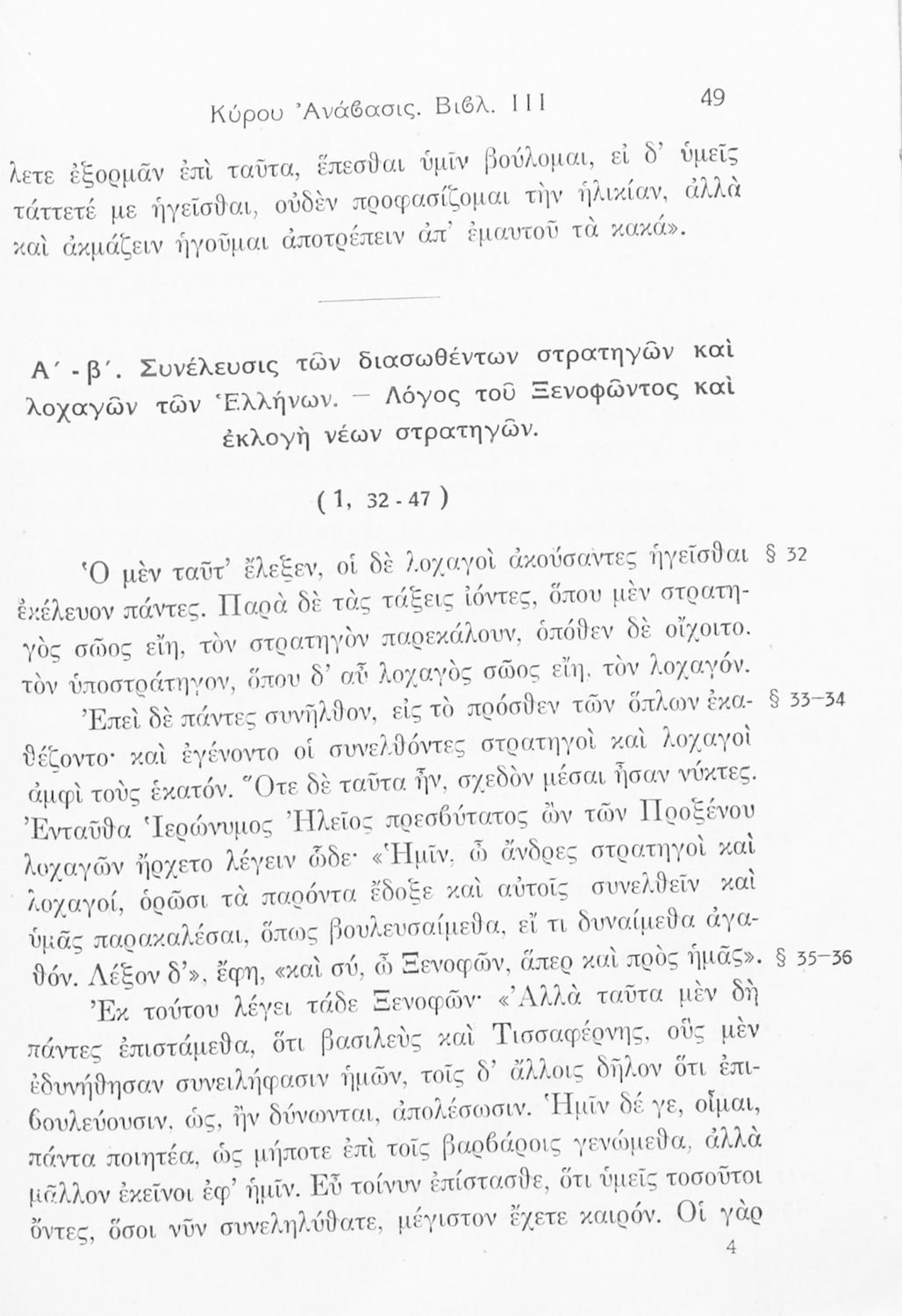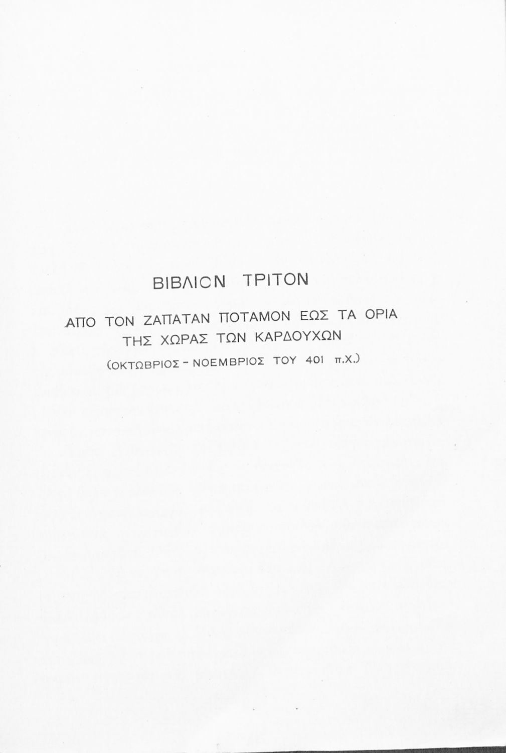 Σχολικό εγχειρίδιο της Γ' Ελληνικού Σχολείου και Αστικών Σχολείων για το μάθημα των Αρχαίων Ελληνικών. Το σύγγραμμα περιλαμβάνει κείμενα κατ΄ επιλογή από τα τέσσερα τελευταία βιβλία του έργου Κύρου Ανάβασις. ...