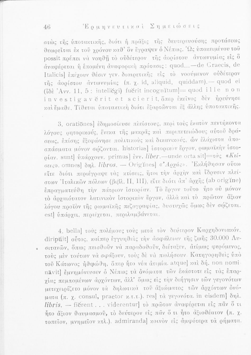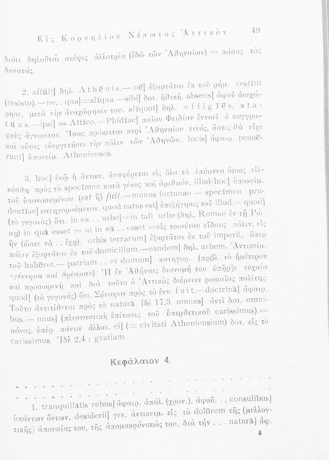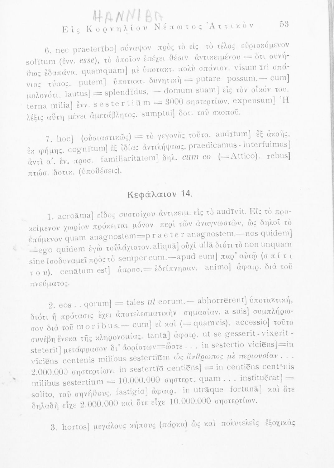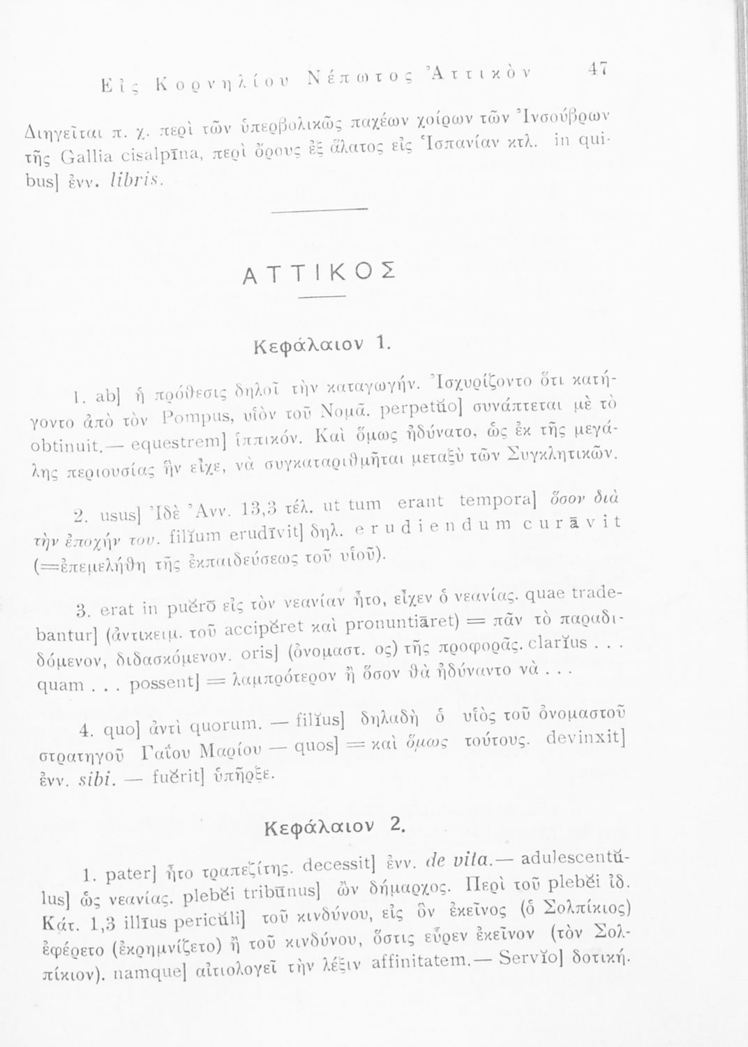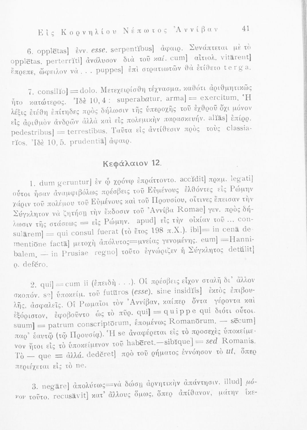 Βαθμίδα εκπαίδευσης: Δευτεροβάθμια Τάξη: Δ΄ Γυμνασίου παλαιού τύπου / Ε' Γυμνασίου νέου τύπου Μάθημα: Λατινικά Γλώσσα: Καθαρεύουσα Παρουσίαση περιεχομένου: Σχολικό εγχειρίδιο Λατινικών για την Δ΄ Γυμνασίου παλαιού τύπου και την Ε΄ Γυμνασίου νέου τύπου που περιέχει σύντομο βιογραφικό σημείωμα του Νέπωτα, αποσπάσματα από τα έργα Αμίλκας, Αννίβας, Κάτων και Αττικός ερμηνευτικές σημειώσεις, ιστορικό και γεωγραφικό πίνακα και λεξιλόγιο. Ο συγγραφέας ήταν καθηγητής της Λατινικής Φιλολογίας στο Πανεπιστήμιο Αθηνών. |