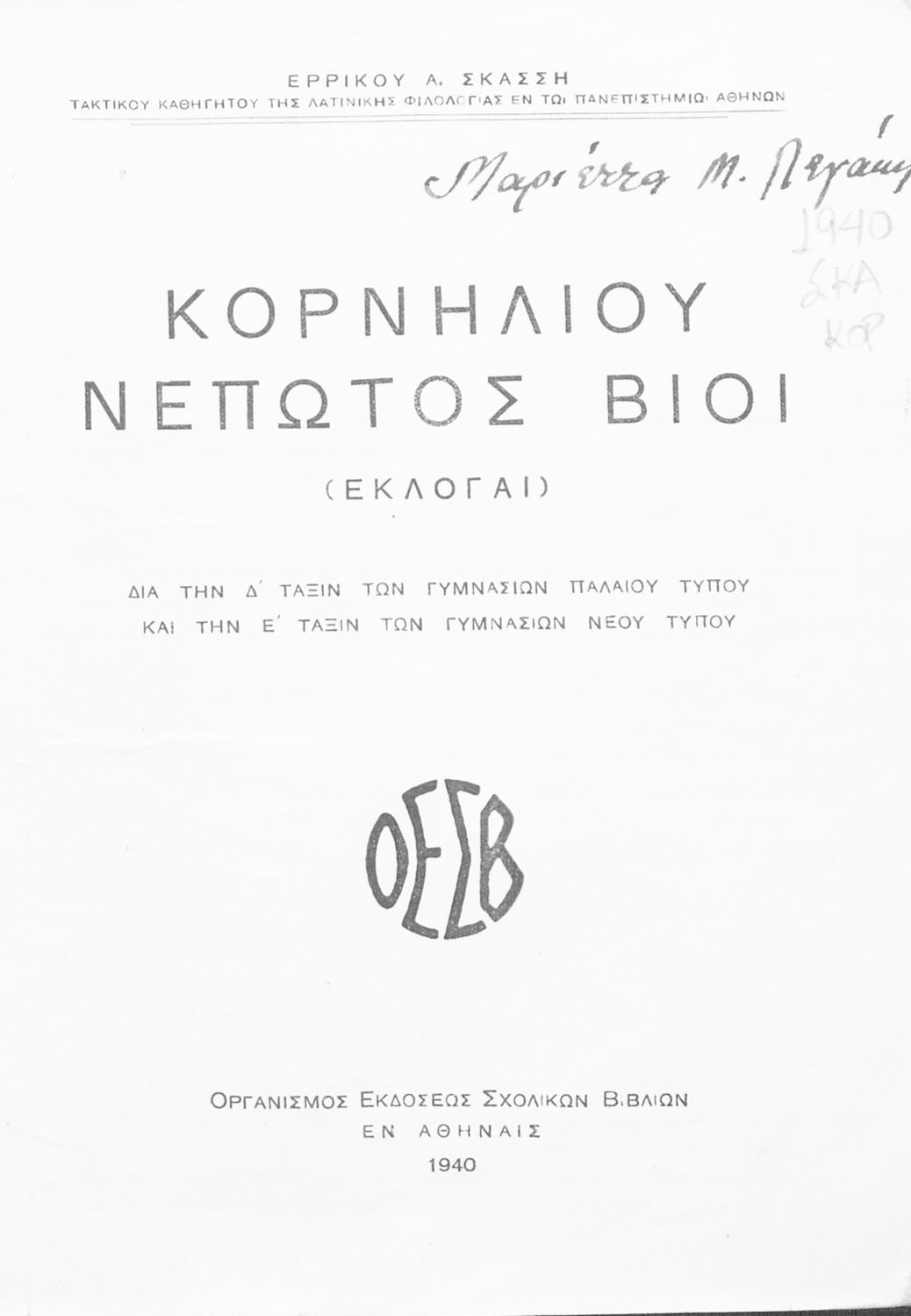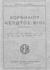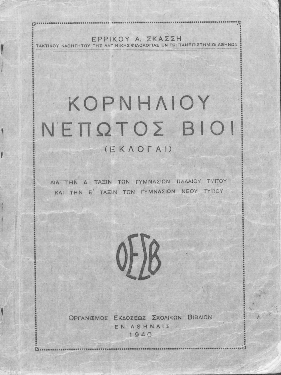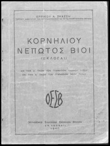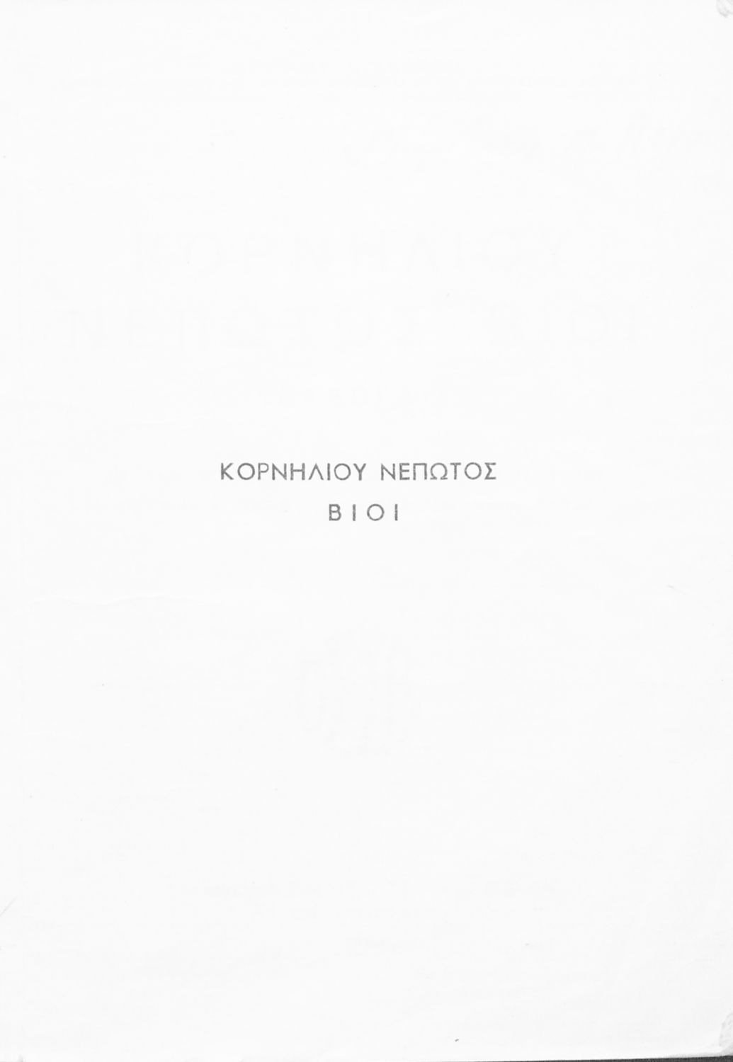 Κωδικός αναγνώρισης: 02-01147 Τίτλος: Κορνηλίου Νέπωτος Βίοι (Εκλογαί) προς χρήσιν των μαθητών της Δ΄ τάξεως των Γυμνασίων παλαιού τύπου και την Ε΄ τάξιν των Γυμνασίων νέου τύπου Συγγραφέας: Κορνήλιος Νέπως (Cornelius Nepos), Ερρίκος Α. Σκάσσης (σχόλια) Μέγεθος και υπόστρωμα: Σχολικό εγχειρίδιο, μαλακό εξώφυλλο, 136 σελίδες. |