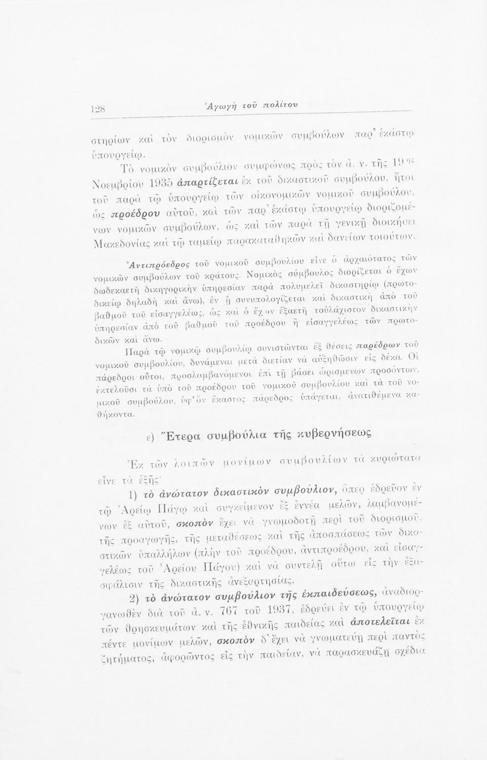Σχολικό εγχειρίδιο Αγωγής του Πολίτη που αποσκοπεί όχι μόνο στην "μετάδοση στοιχειωδών γνώσεων δικαίου και πολιτικής οικονομίας αλλά κυρίως στην εθνοπρεπής πολιτική, κοινωνική και ηθική διάπλαση της ελληνικής νεολαίας" σύμφωνα με τα πρότυπα του καθεστώτος της 4ης Αυγούστου. Τις πρώτες σελίδες του βιβλίου κοσμούν φωτογραφίες του Γεωργίου του Β΄ και του Ιωάννη Μεταξά που φέρει τον τίτλο του "αρχηγού της εθνικής κυβερνήσεως και του γενικού επιθεωρητή της Ε.Ο.Ν". Ο συγγραφέας ήταν καθηγητής της Ιστορίας στο Πανεπιστήμιο Αθηνών.