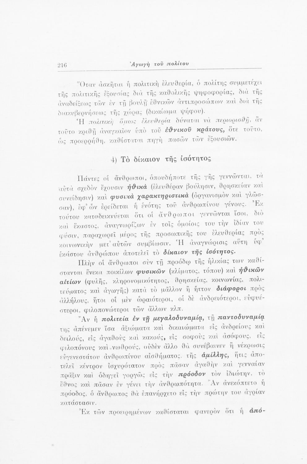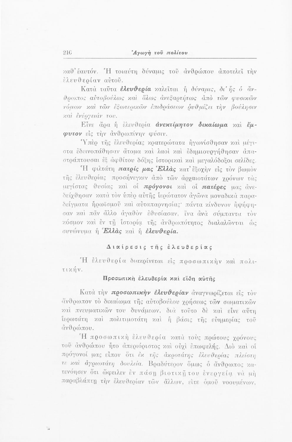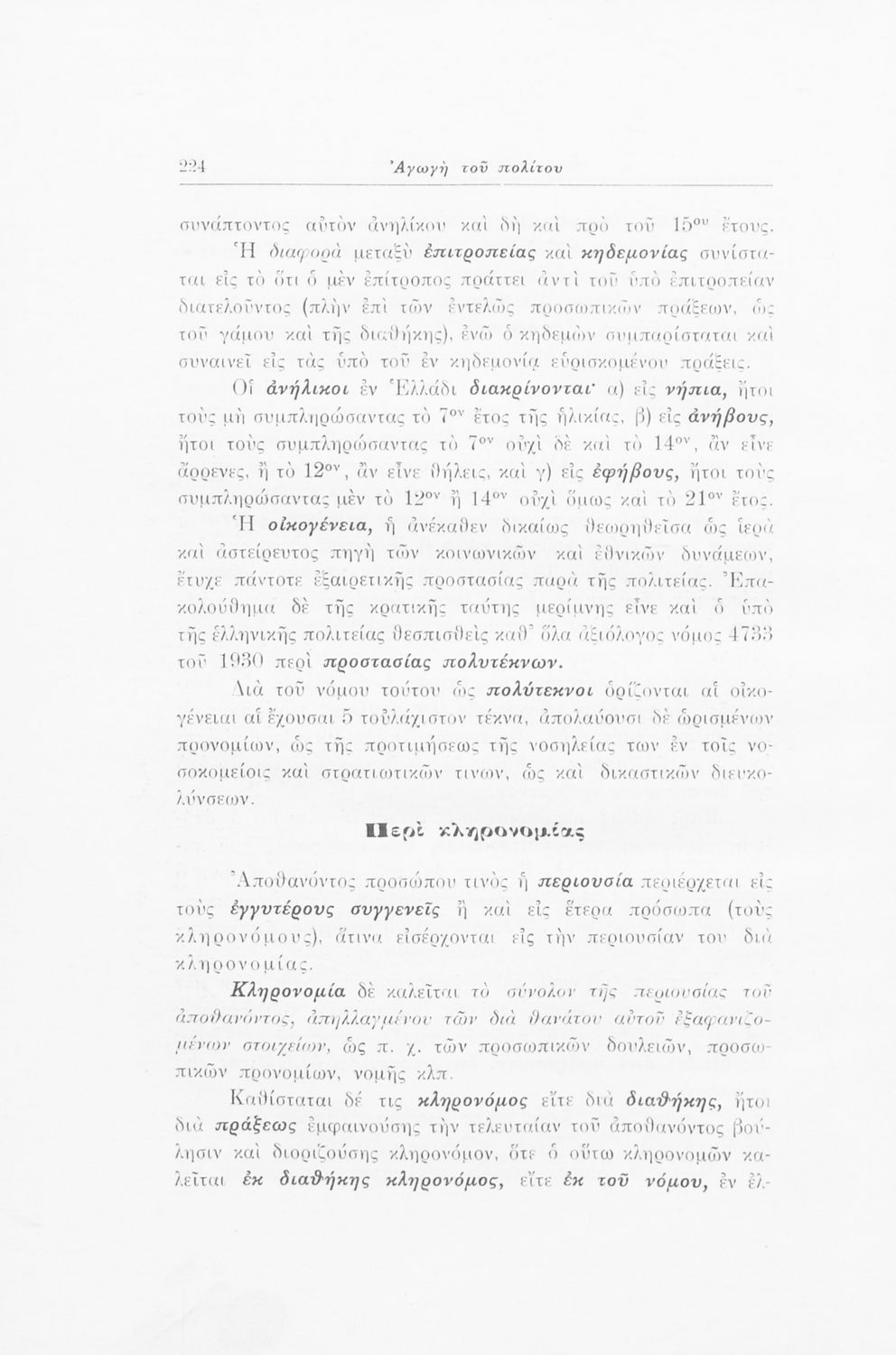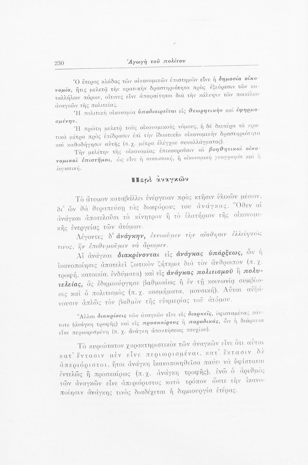Σχολικό εγχειρίδιο Αγωγής του Πολίτη που αποσκοπεί όχι μόνο στην "μετάδοση στοιχειωδών γνώσεων δικαίου και πολιτικής οικονομίας αλλά κυρίως στην εθνοπρεπής πολιτική, κοινωνική και ηθική διάπλαση της ελληνικής νεολαίας" σύμφωνα με τα πρότυπα του καθεστώτος της 4ης Αυγούστου. Τις πρώτες σελίδες του βιβλίου κοσμούν φωτογραφίες του Γεωργίου του Β΄ και του Ιωάννη Μεταξά που φέρει τον τίτλο του "αρχηγού της εθνικής κυβερνήσεως και του γενικού επιθεωρητή της Ε.Ο.Ν". Ο συγγραφέας ήταν καθηγητής της Ιστορίας στο Πανεπιστήμιο Αθηνών.