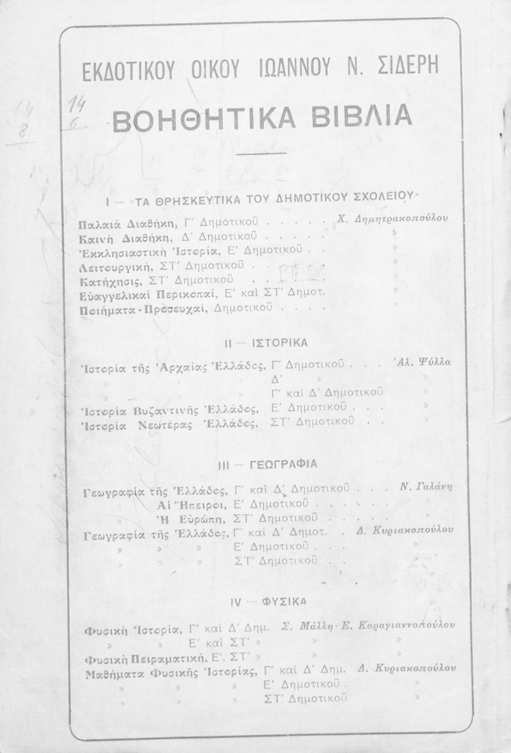 Σχολικό εγχειρίδιο Γ΄ και Δ΄ Δημοτικού που περιέχει τη γραμματικής της νέας ελληνικής. Την έκδοση επιμελήθηκε ο Γ. Λογοθέτης, τέως διευθυντής του επταταξίου δημ. Τμήμ.της Ευαγγελικής Σχολής.