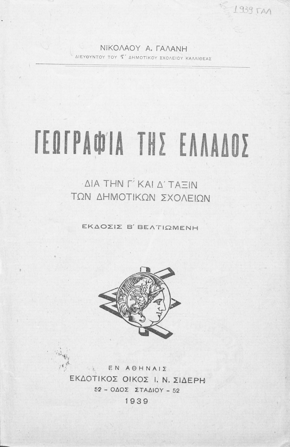 Κωδικός αναγνώρισης: 02-01170 Τίτλος: Γεωγραφία της Ελλάδος διά την Γ΄ και Δ΄ τάξιν των Δημοτικών Σχολείων Συγγραφέας: Νικόλαος Α. Γαλάνης Μέγεθος και υπόστρωμα: Μαθητικό βοήθημα, μαλακό εξώφυλλο, 138 σελίδες. Εικόνες (ασπρόμαυρες), σκίτσα (ασπρόμαυρα), χάρτες (ασπρόμαυροι). |