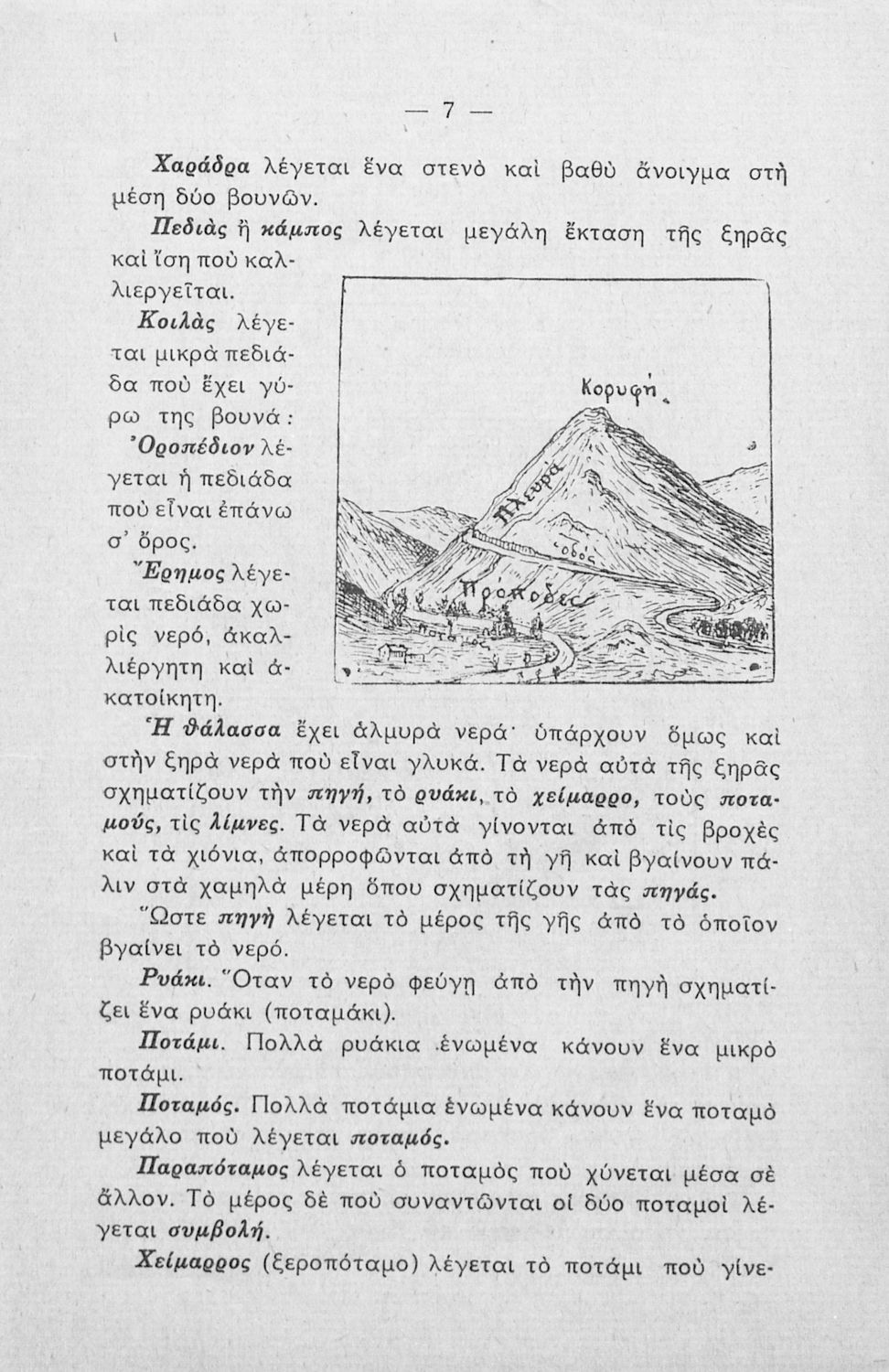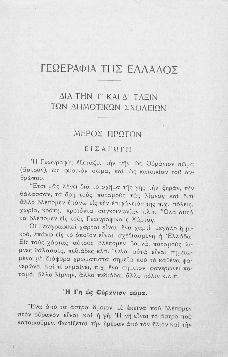 Βαθμίδα εκπαίδευσης: Πρωτοβάθμια Τάξη: Γ' Δημοτικού / Δ' Δημοτικού Μάθημα: Γεωγραφία Γλώσσα: Απλή καθαρεύουσα Παρουσίαση περιεχομένου: Μαθητικό βοήθημα Γεωγραφίας για της Γ΄ και Δ΄ Δημοτικού που περιλαμβάνει εισαγωγή στη φυσική γεωγραφία και εξετάζει την Ελλάδα ανά γεωγραφικό διαμέρισμα από γεωφυσική και οικονομική άποψη. |