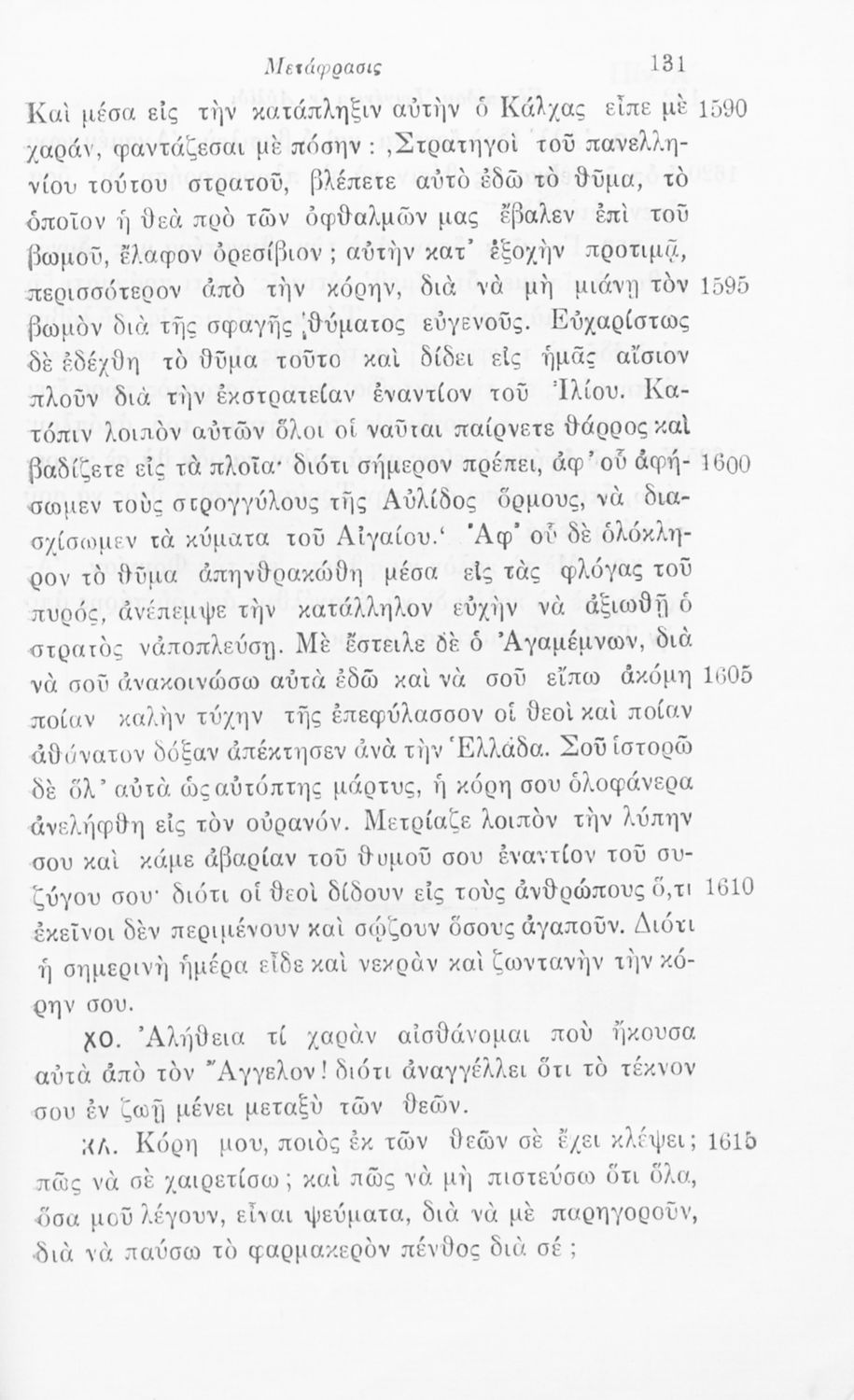 Μαθητικό βοήθημα Αρχαίων Ελληνικών για την Ε' Γυμνασίου που περιλαμβάνει μετάφραση, ερμηνευτικά, γραμματικά και συντακτικά σχόλια στην Ιφιγένεια η εν Αυλίδι.