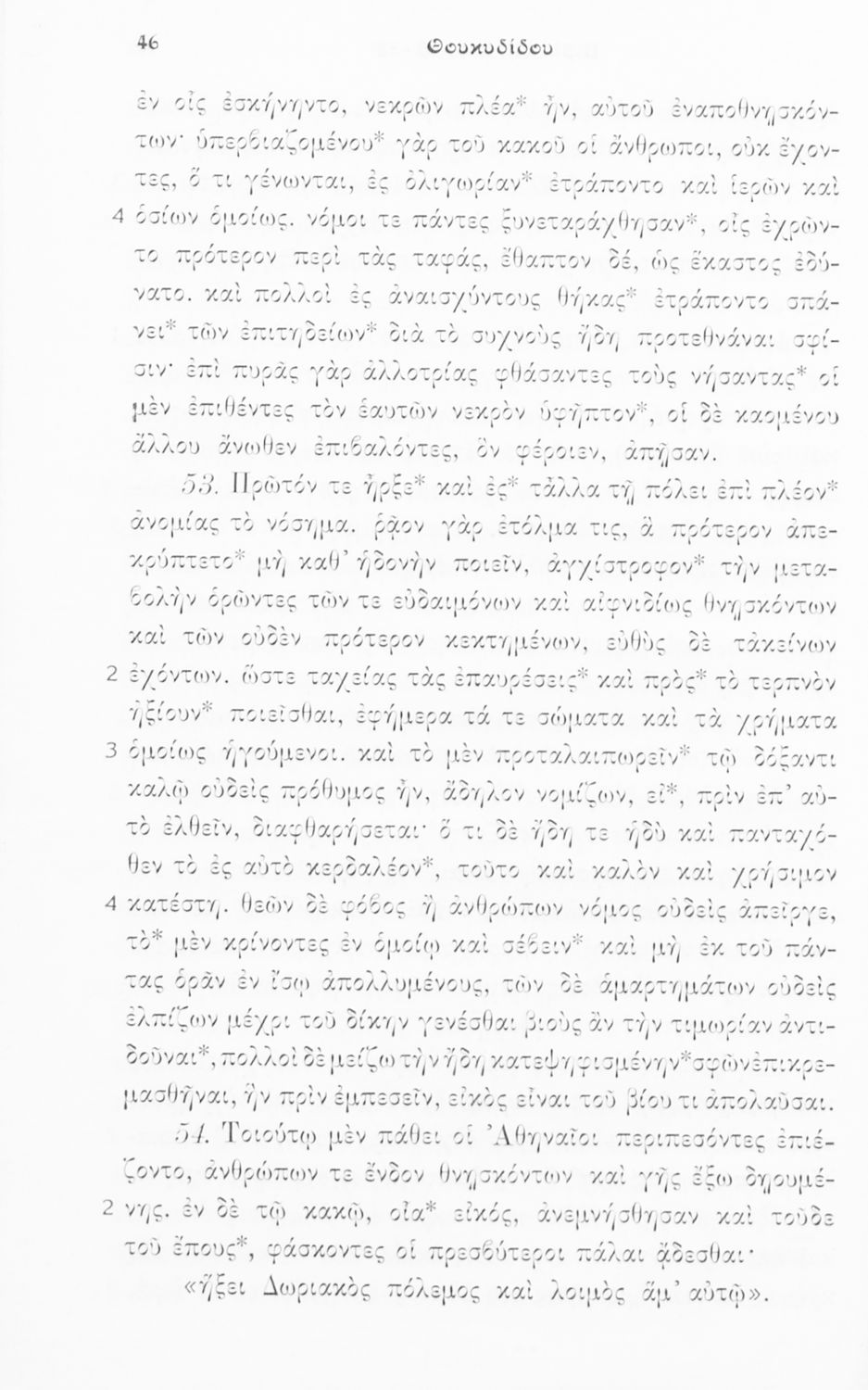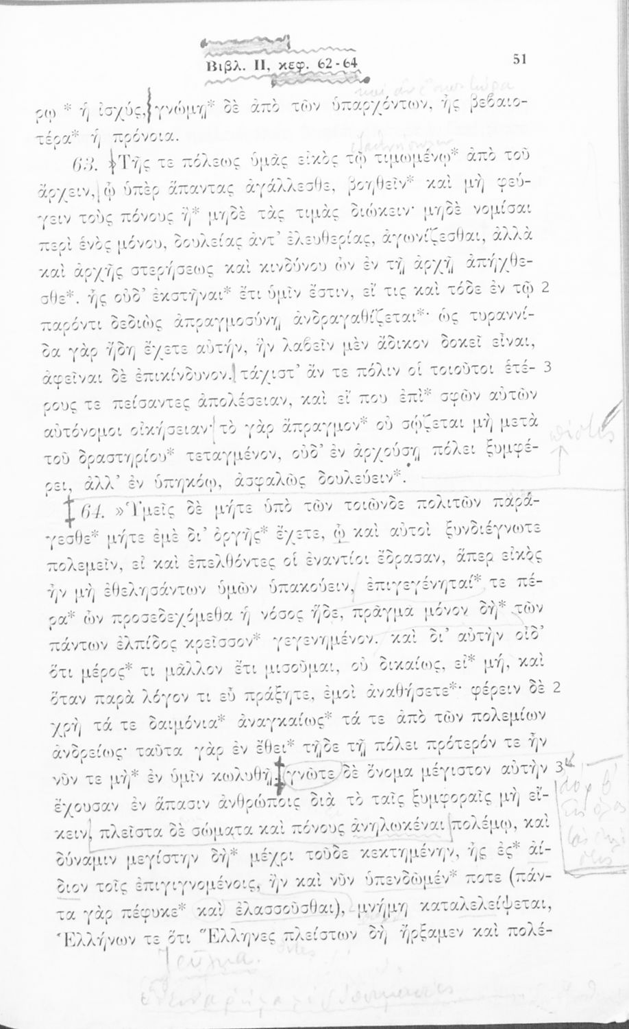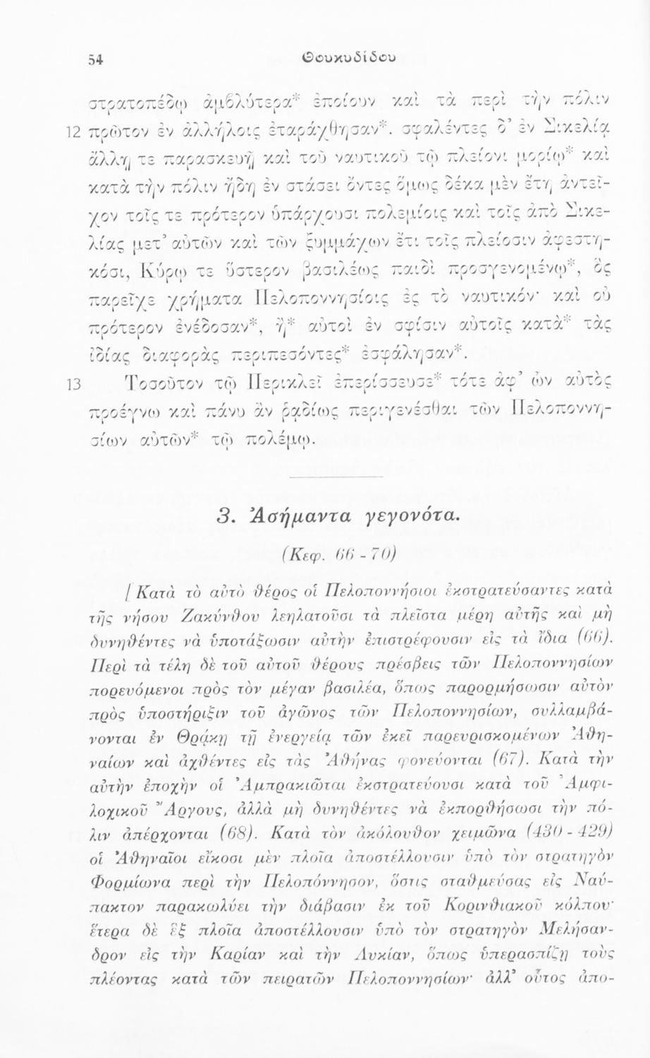 Σχολικό εγχειρίδιο Αρχαίων Ελληνικών για τις Β΄ και Γ΄ Γυμνασίου που περιλαμβάνει σύντομο βιογραφικό σημείωμα του Θουκυδίδη, εισαγωγικά σχόλια στο έργο, κείμενο και ετυμολογικό λεξιλόγιο.