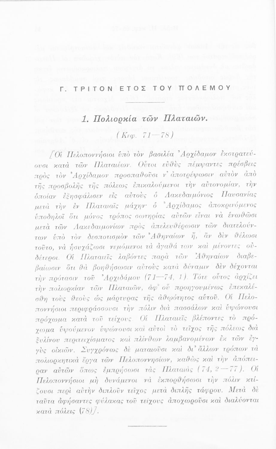 Σχολικό εγχειρίδιο Αρχαίων Ελληνικών για τις Δ΄, Ε΄ και ΣΤ΄ Γυμνασίου παλαιού τύπου που περιλαμβάνει σύντομο βιογραφικό σημείωμα του Θουκυδίδη, περιγραφή του ιστορικού πλαισίου, αποσπάσματα από τα Πλαταϊκά, τα