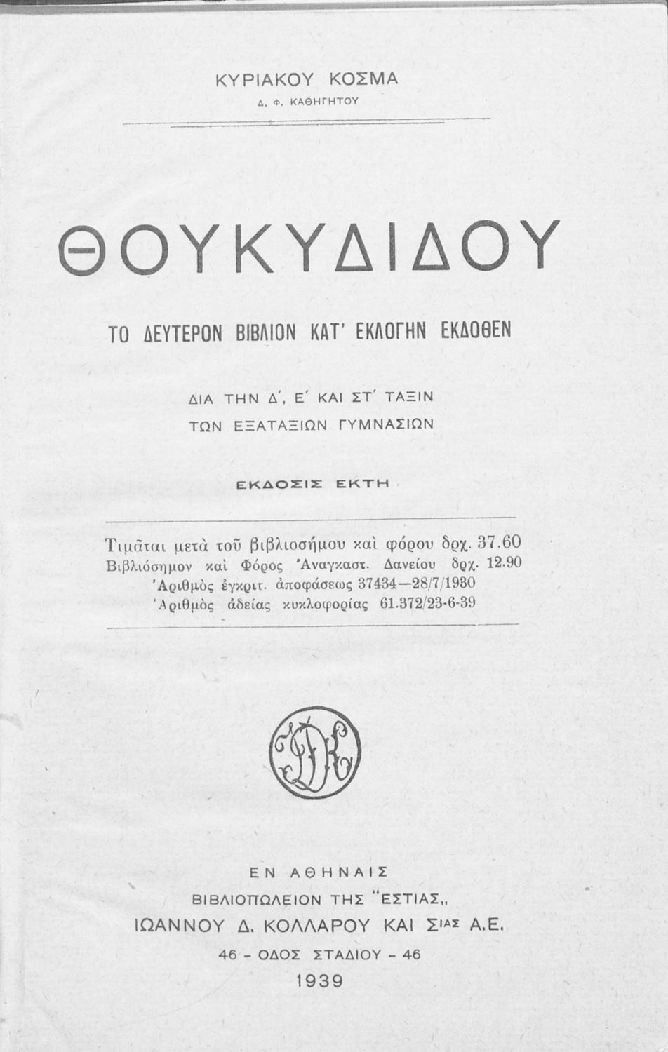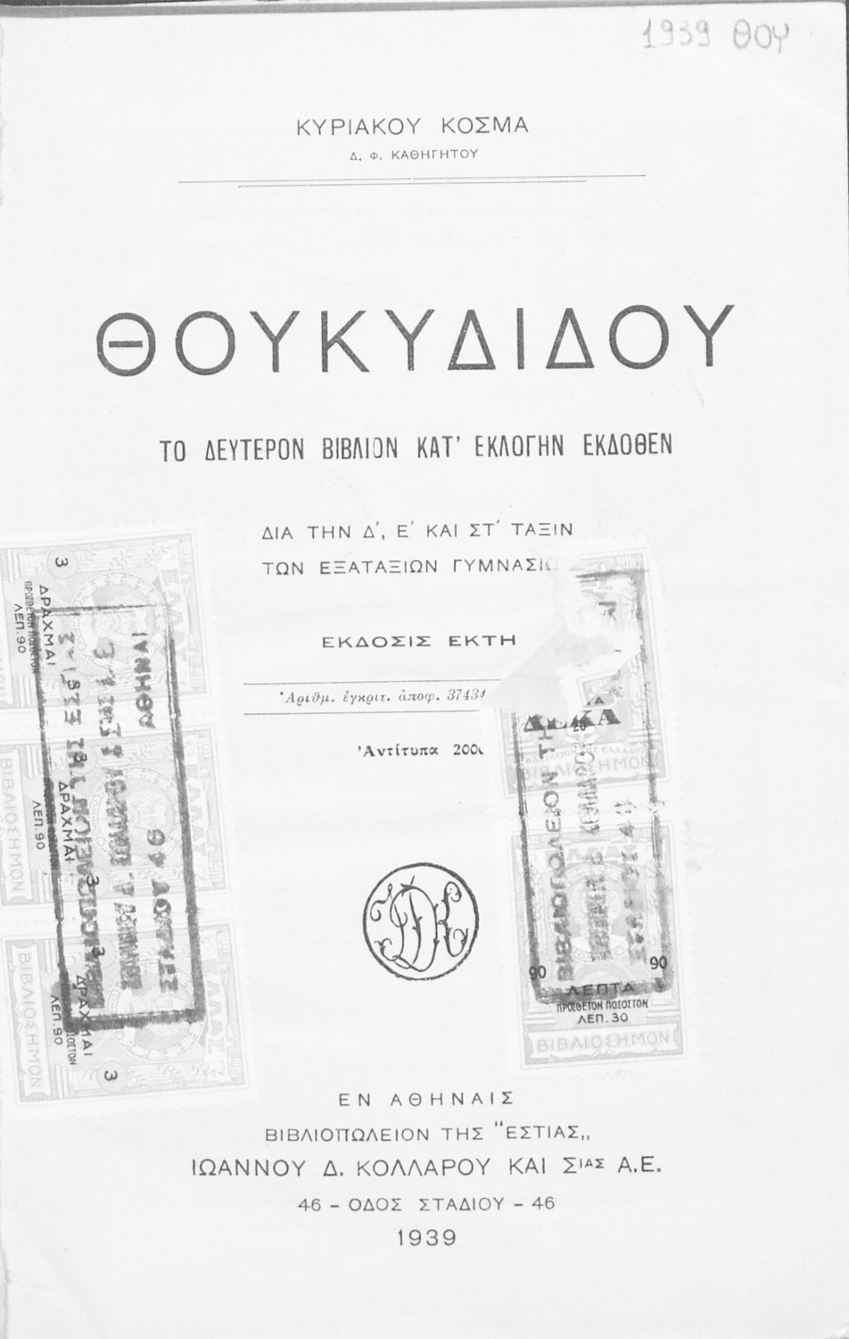 Εκδότης: Ιωάννης Δ. Κολλάρος και ΣΙΑ ΑΕ Έτος έκδοσης: 1939 Τόπος έκδοσης: Αθήνα Έκδοση: 6η Υπουργική απόφαση / Σύμβαση: 37434/28-7-1930 |
